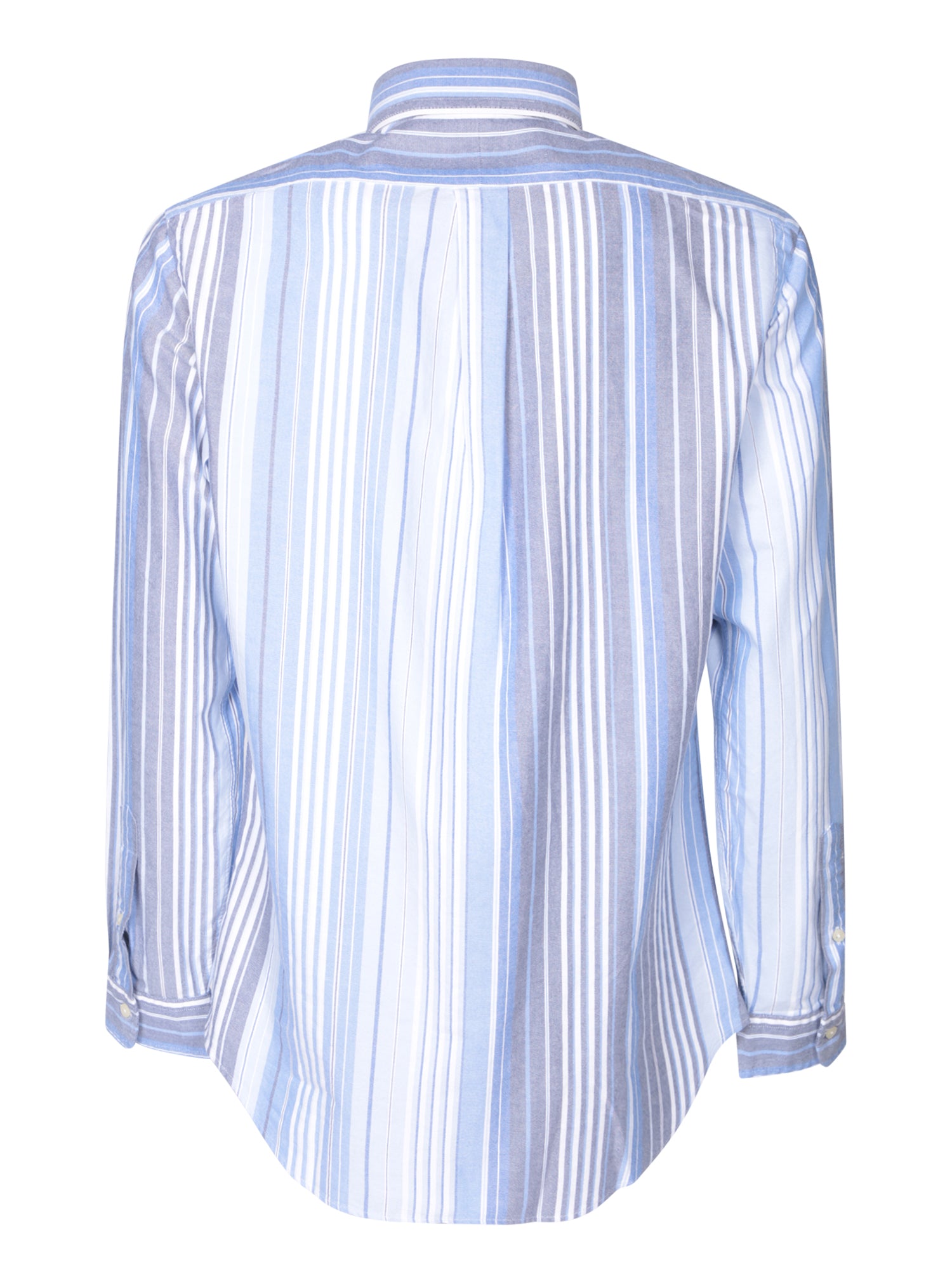 Long-sleeved shirt with vertical stripes in blue and white shades. Button-down collar and embroidered logo on the chest.