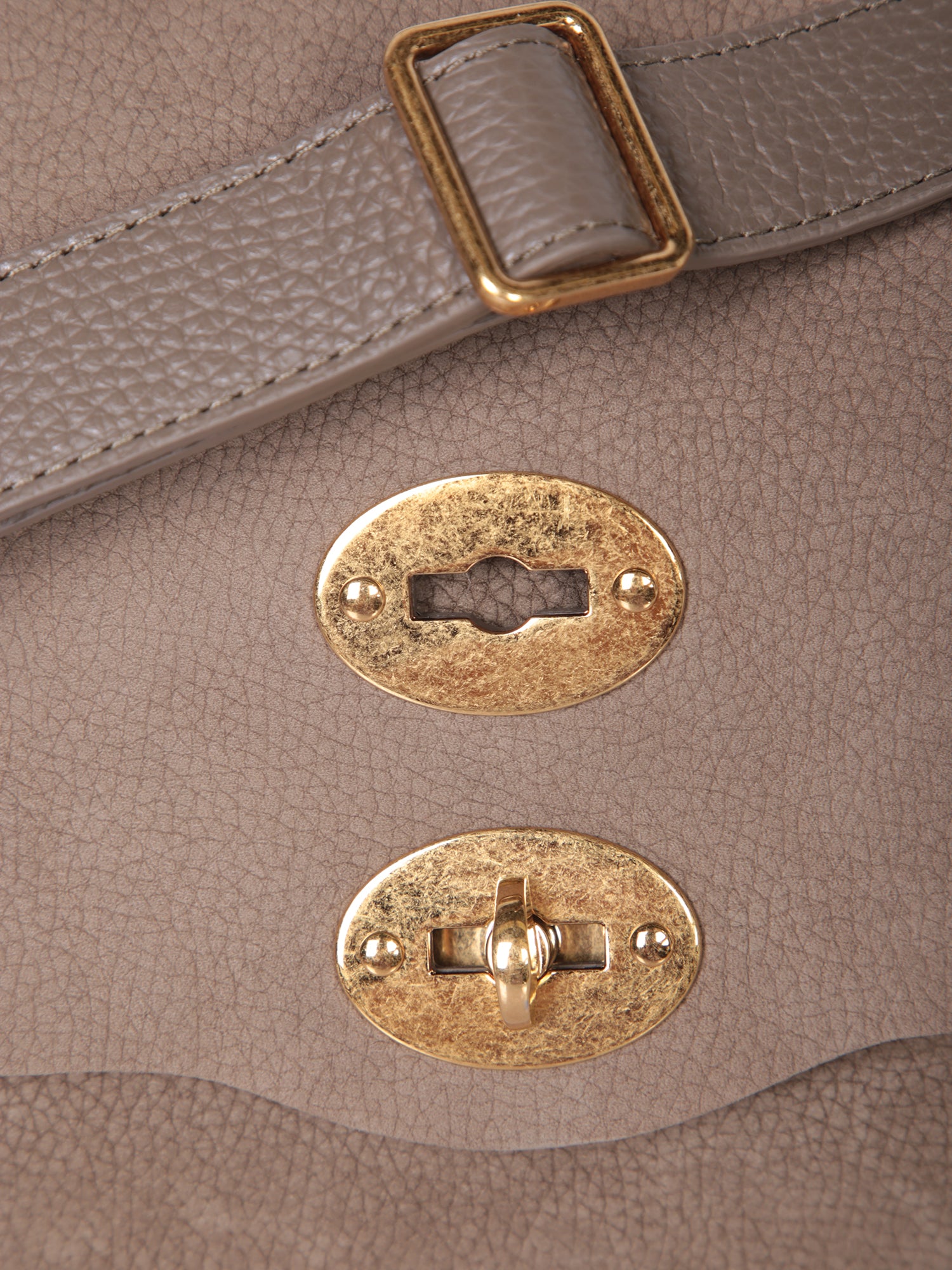 Crafted from fine leather. Flap closure with golden lock. Adjustable and removable shoulder strap.