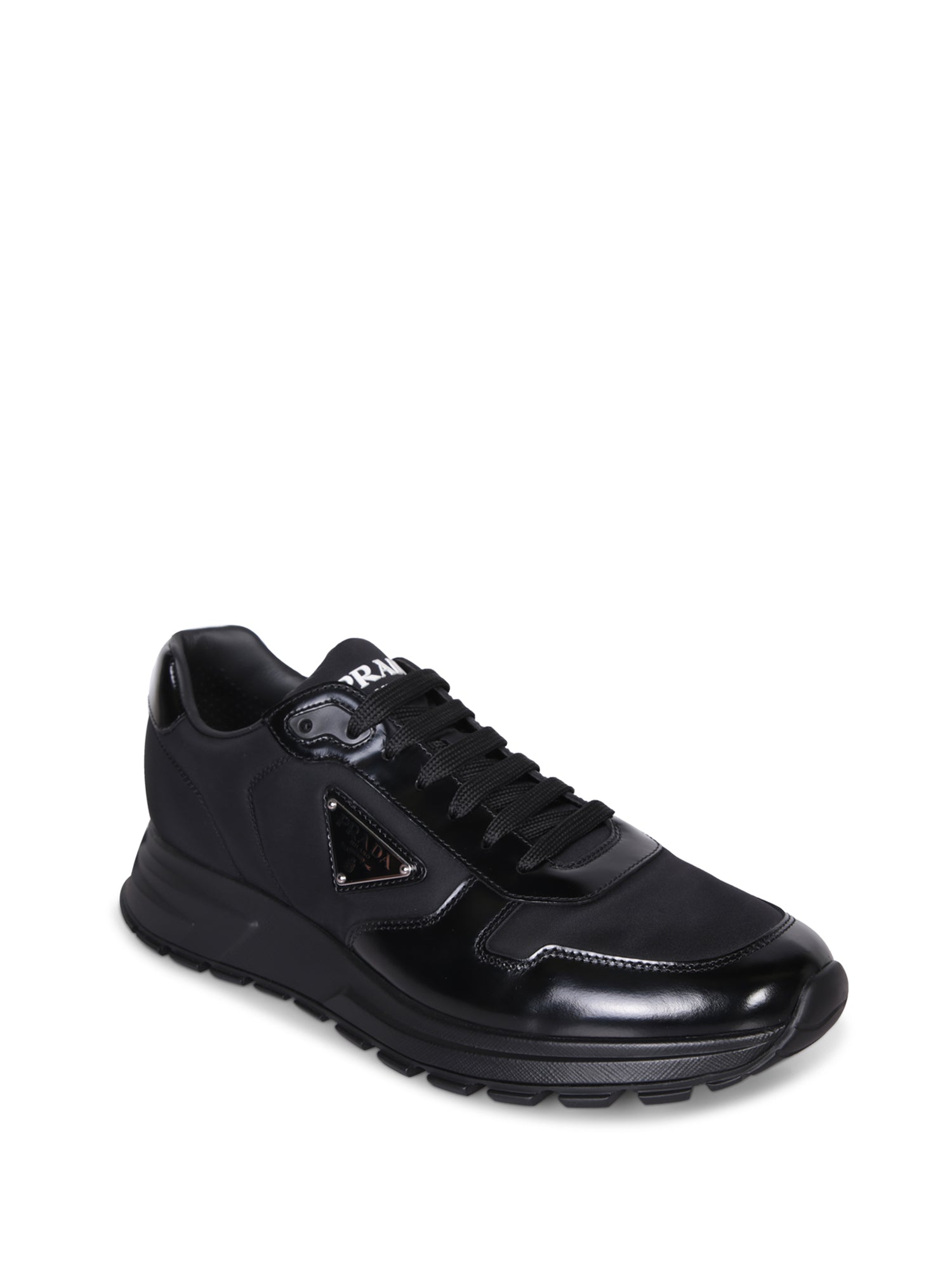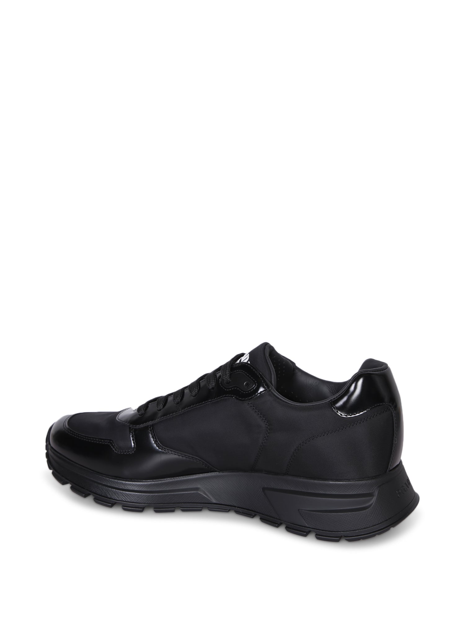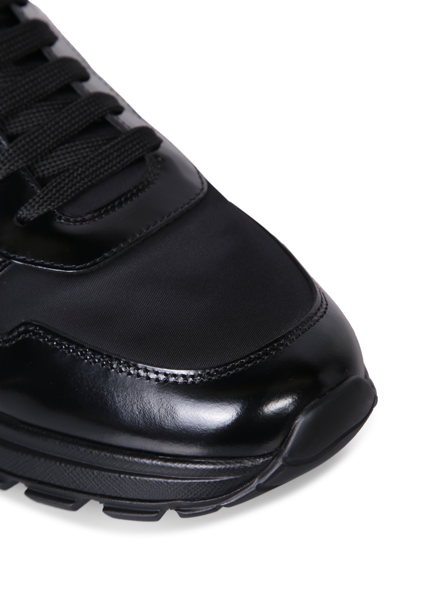 Mixed composition of leather and Renylon. Design features a triangular metal Prada logo. Coordinated color laces.