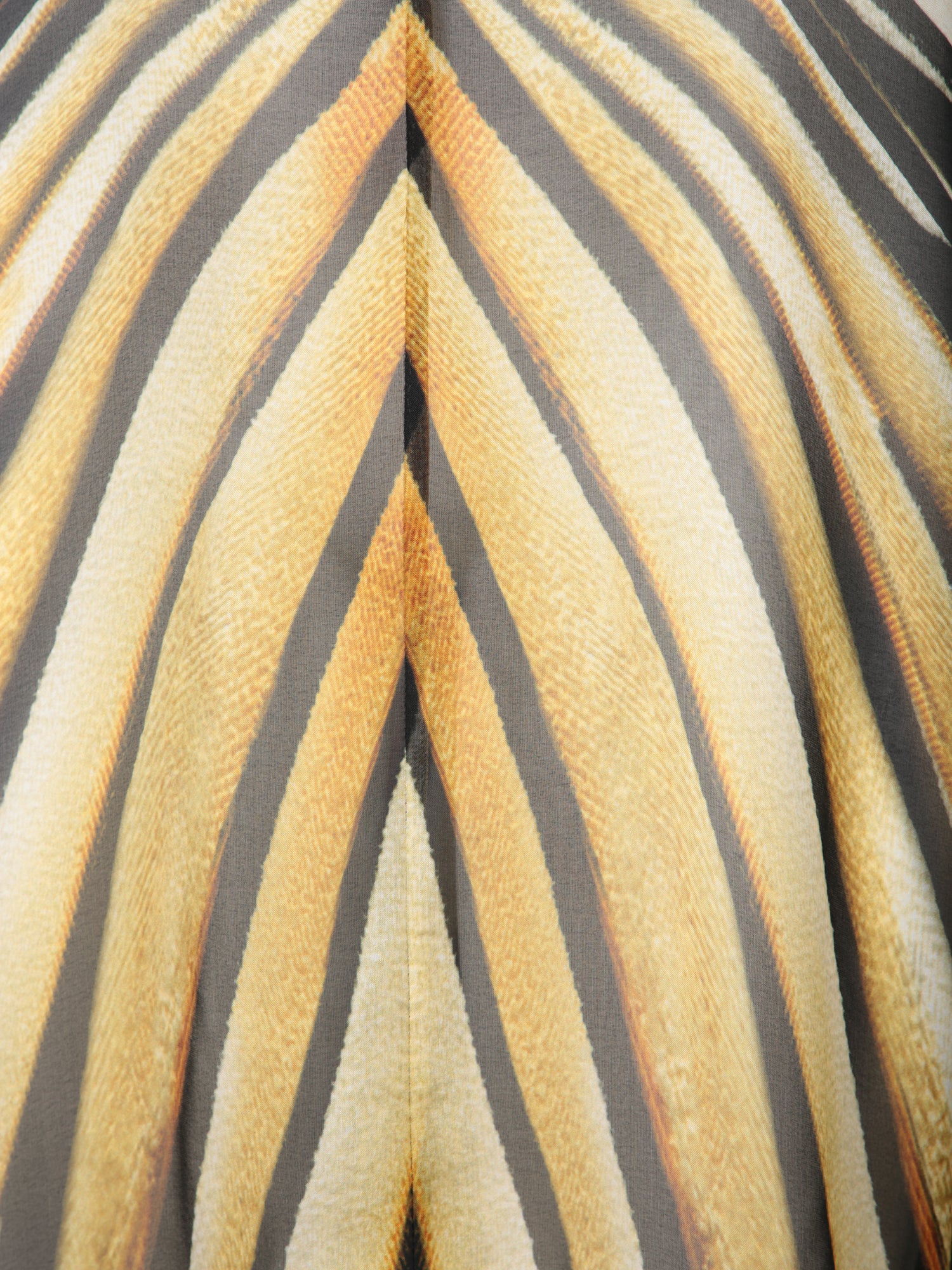 Lightweight kaftan dress with golden and black graphic print. Wide sleeves and floor length.