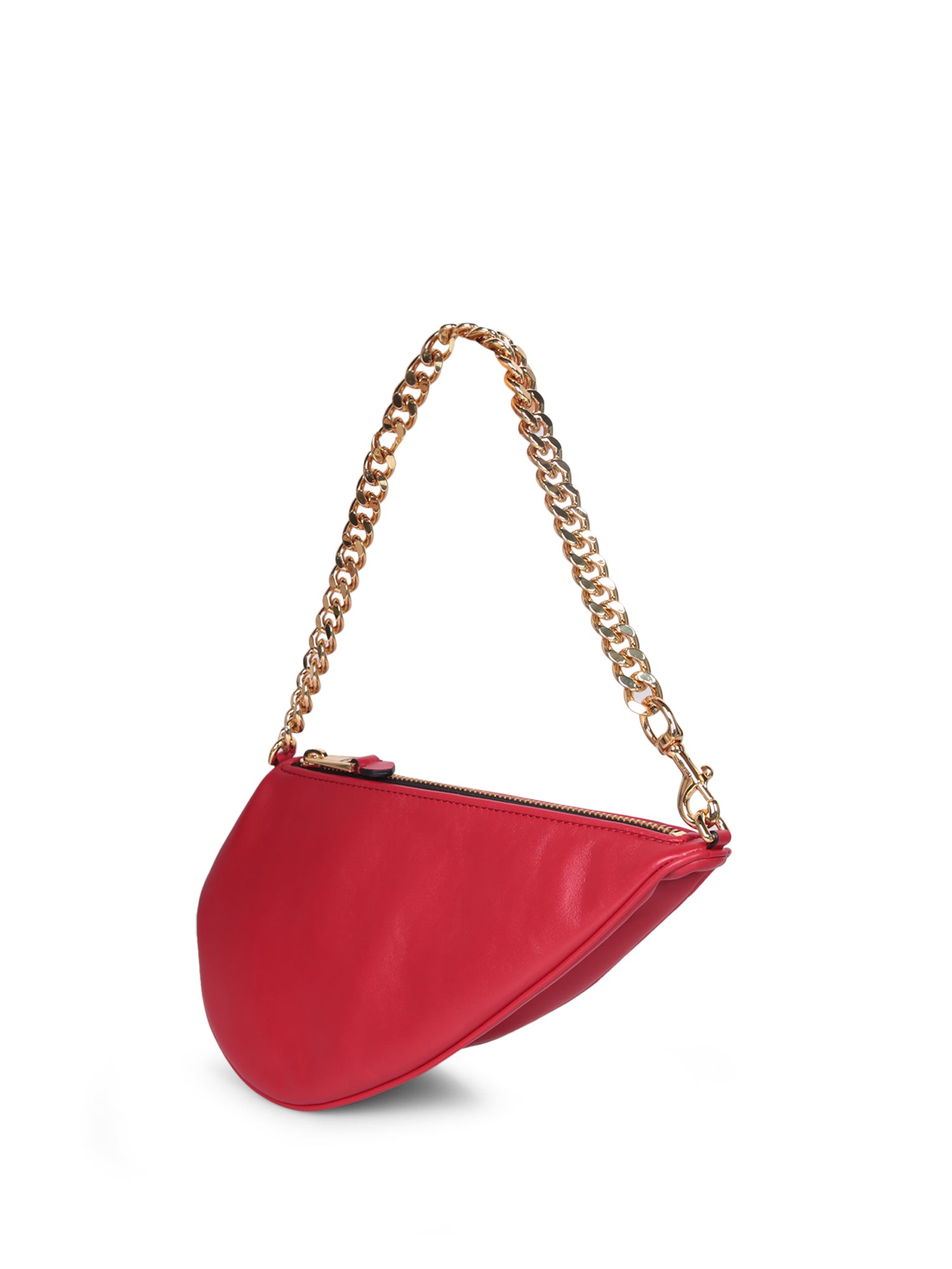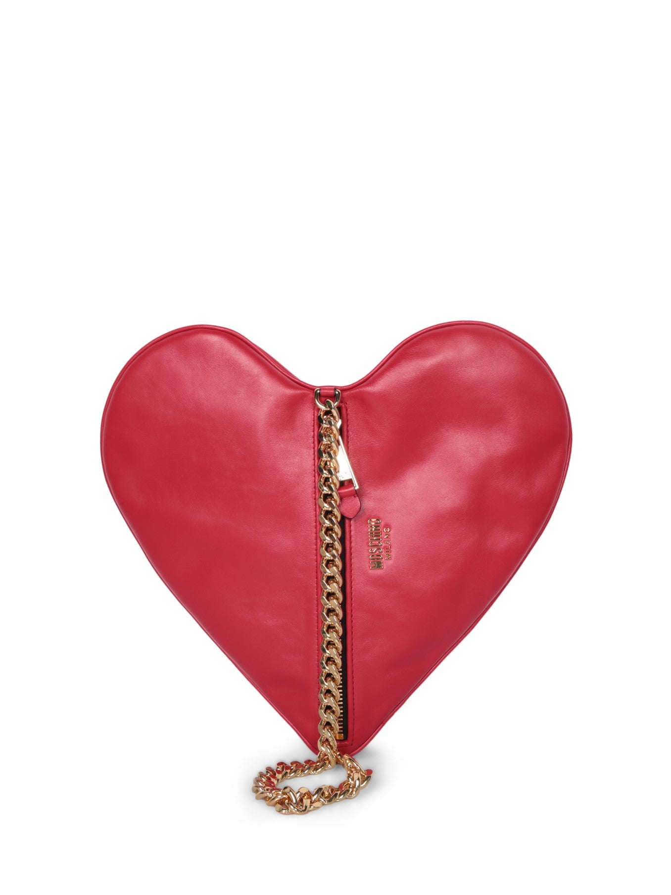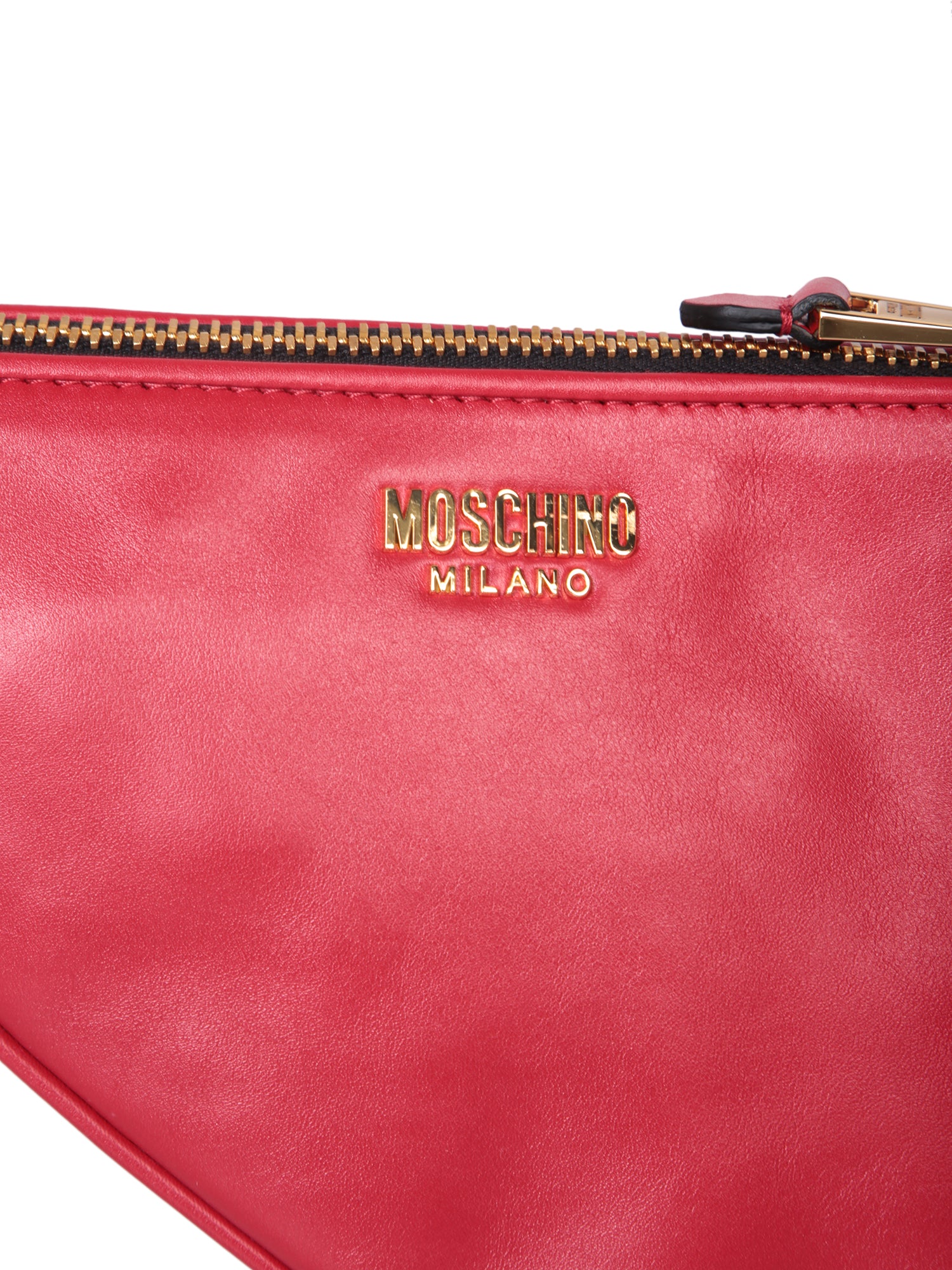 Gold-tone chain strap. Top zip closure. Embossed Moschino logo on the front.