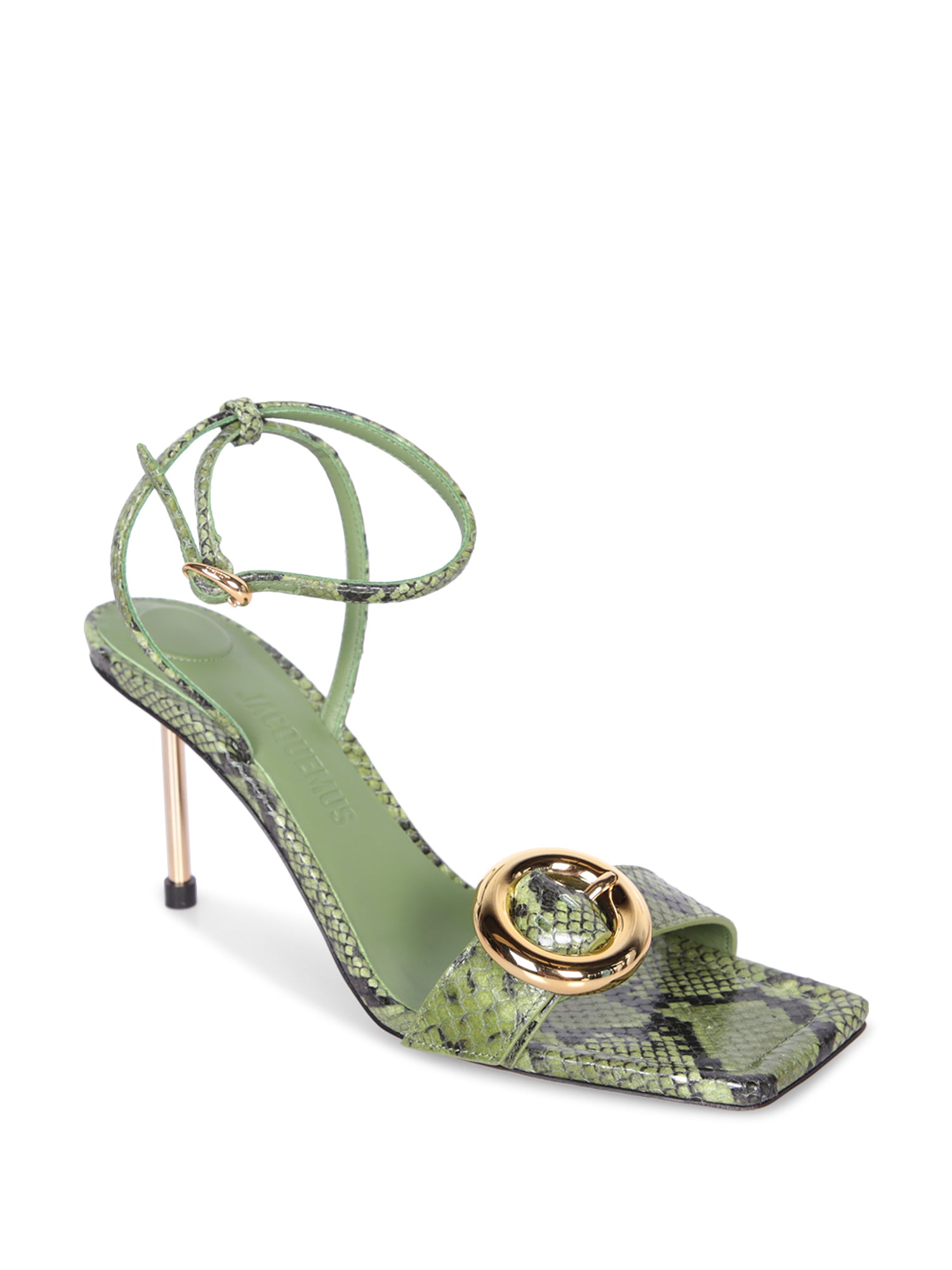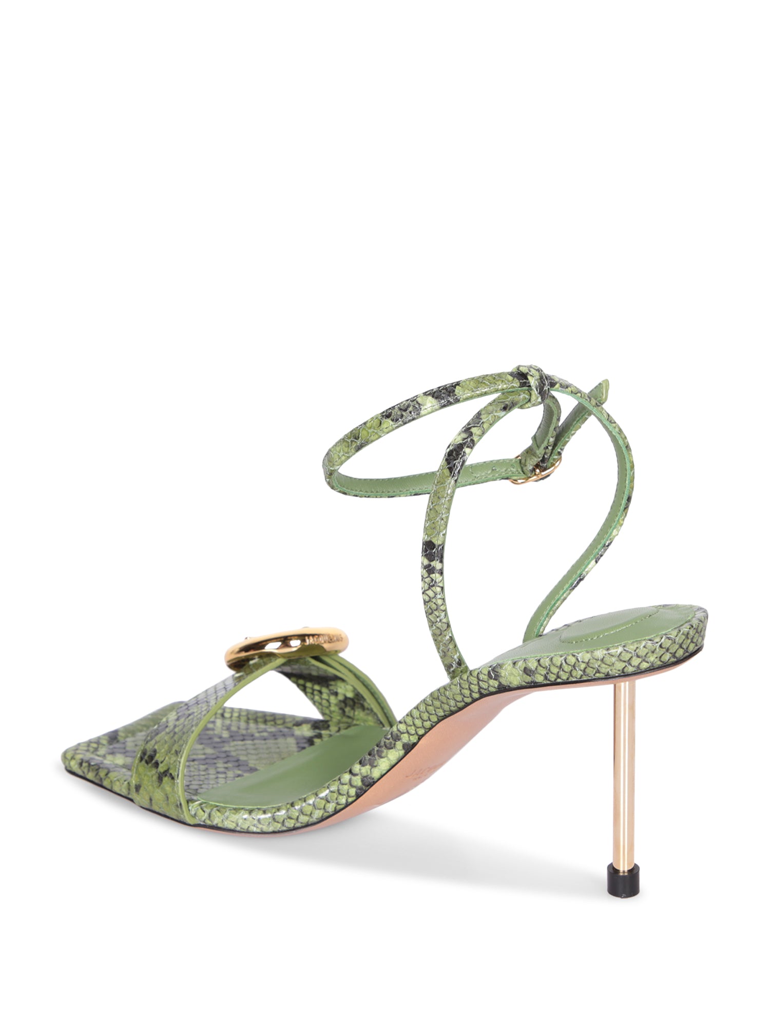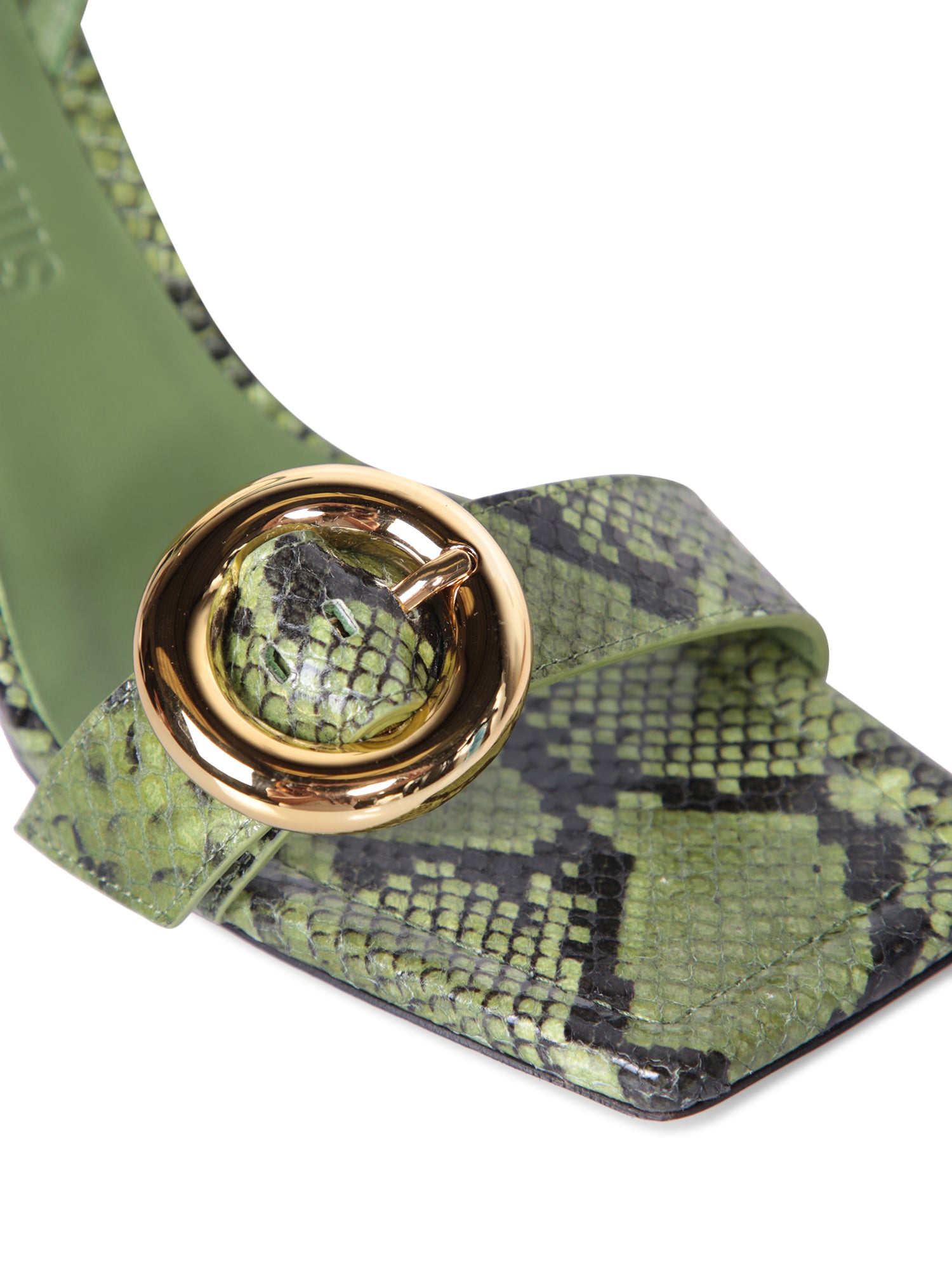 Python-print leather sandals, gold ring detail, adjustable ankle strap, stiletto heel.