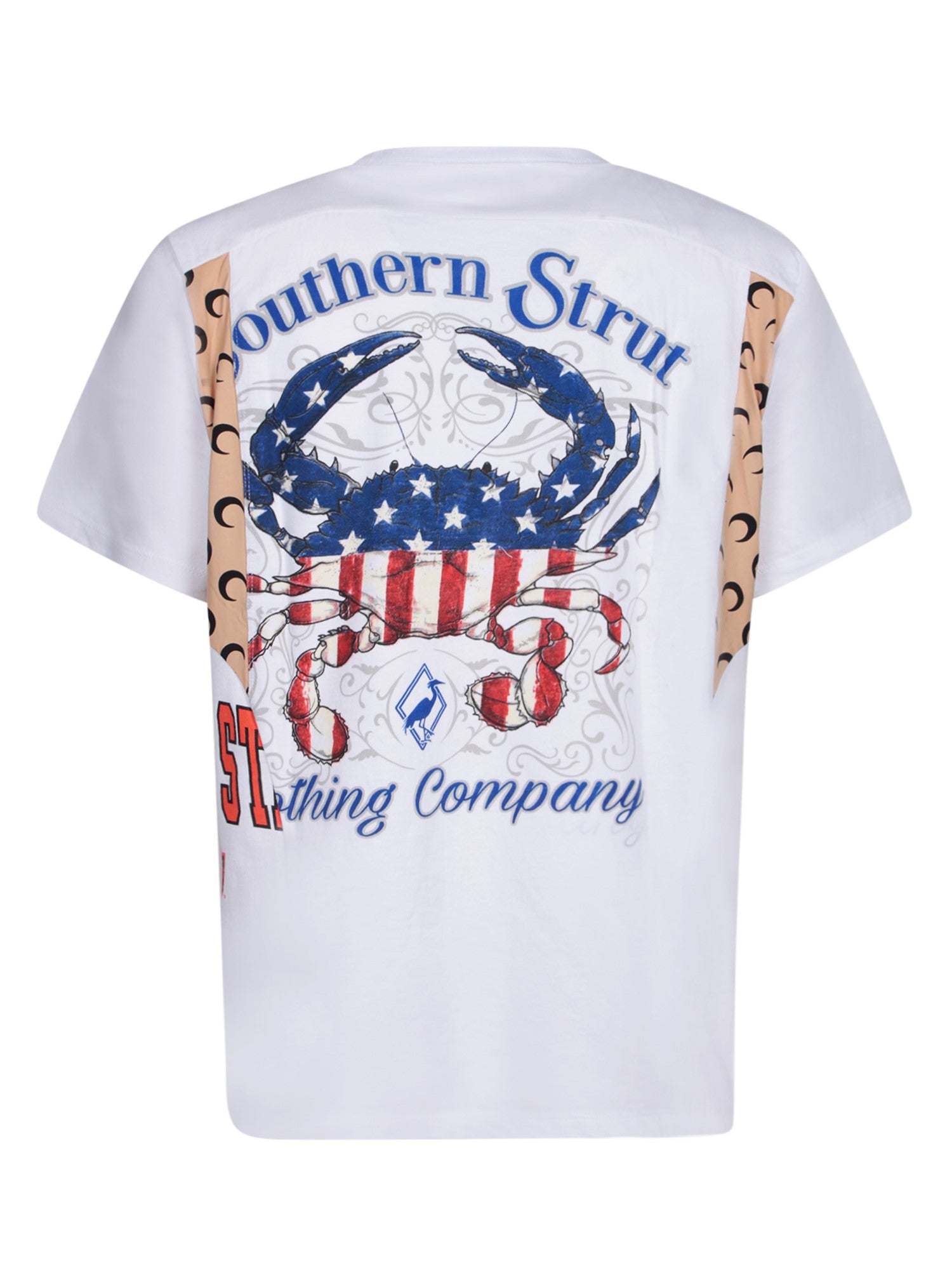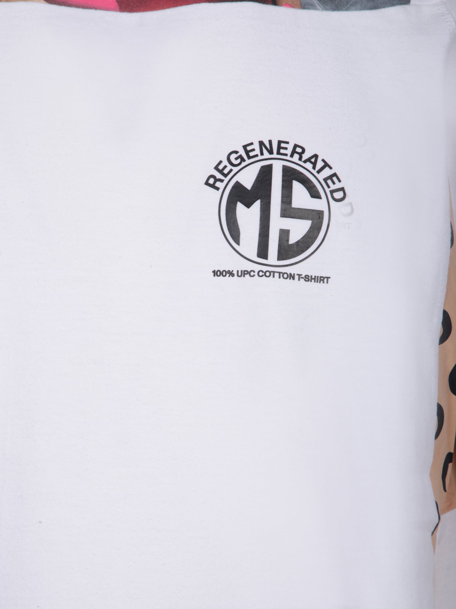 Short-sleeve white cotton t-shirt. Features a colorful graphic print on the shoulders and a front Marine Serre logo.