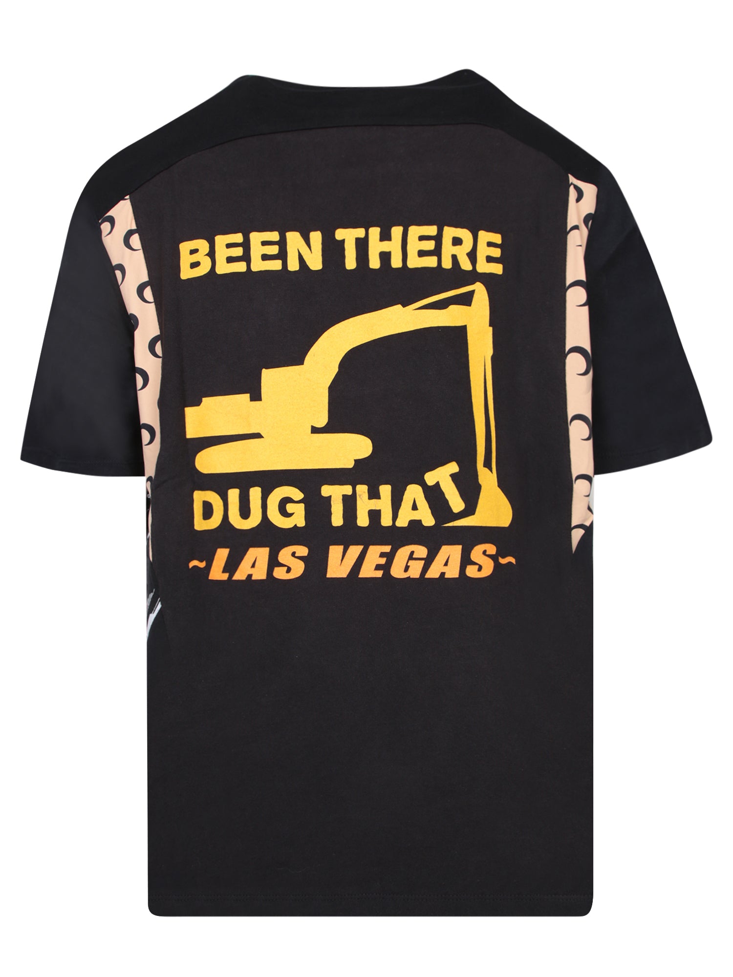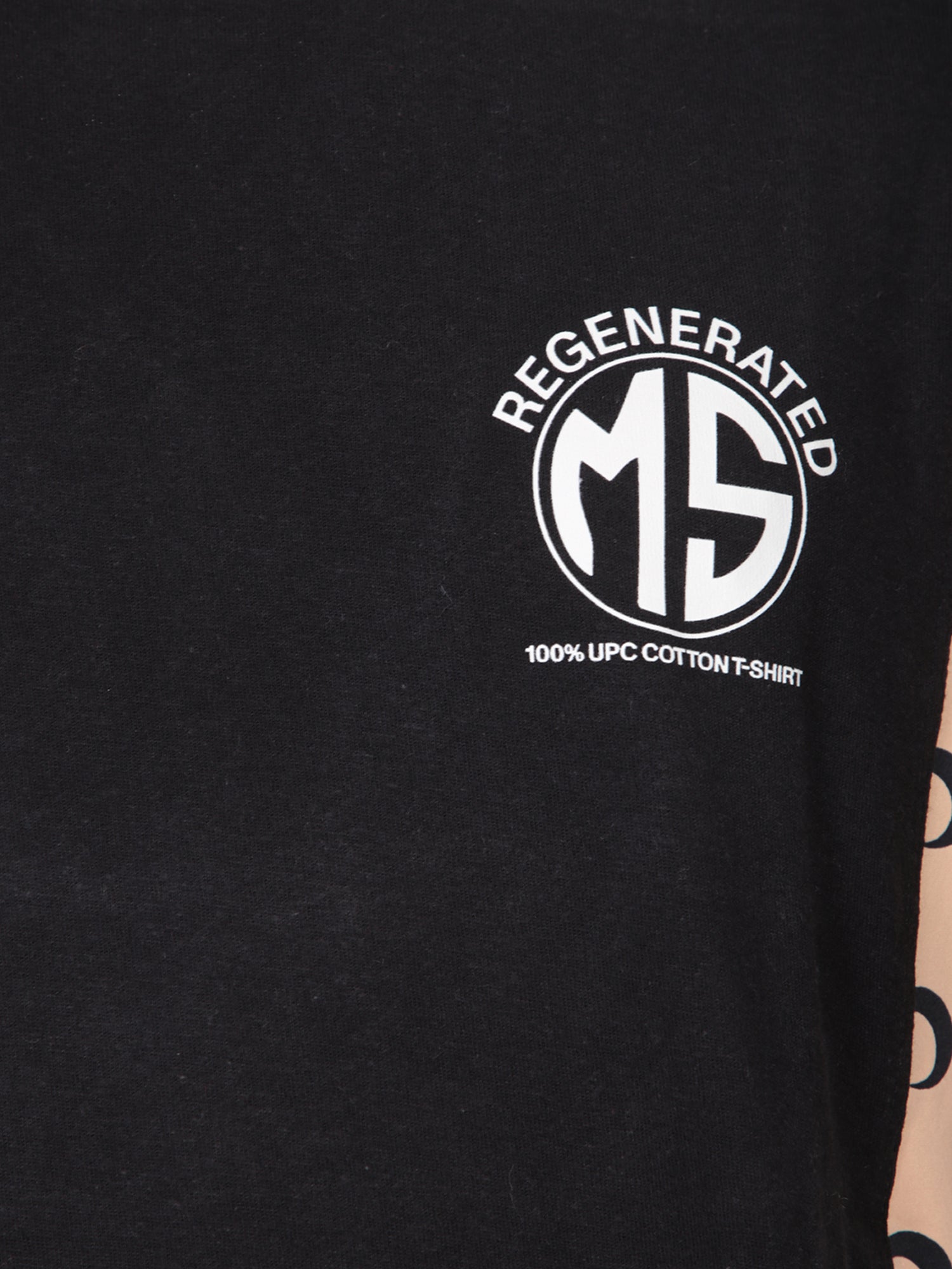 Black short-sleeved t-shirt with front print and graphic design on the sides.