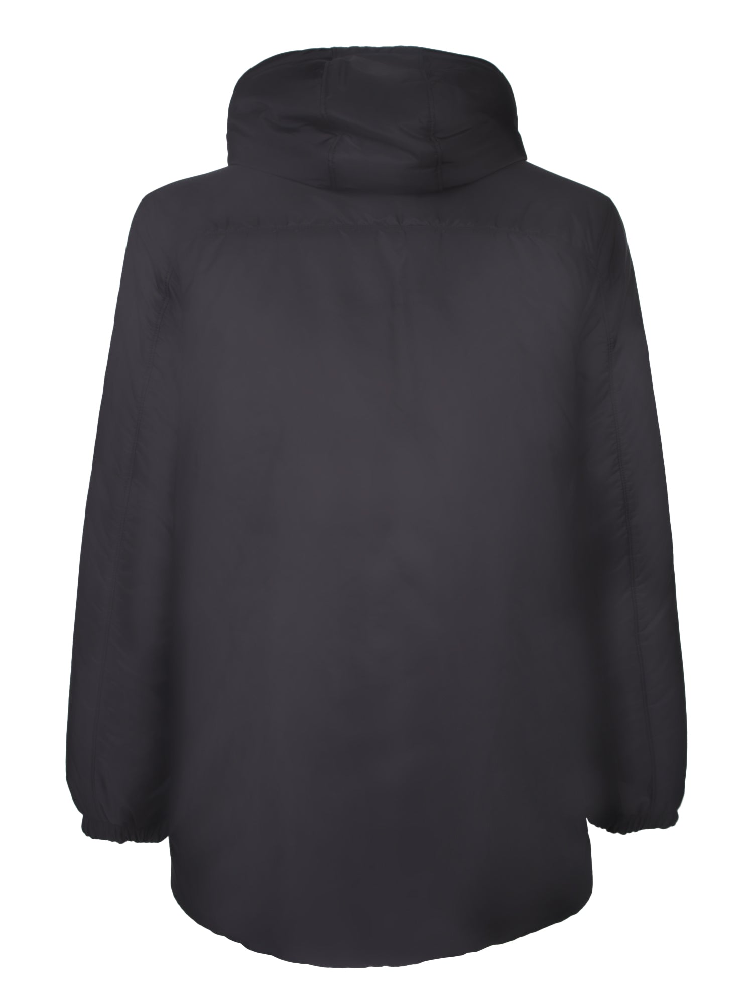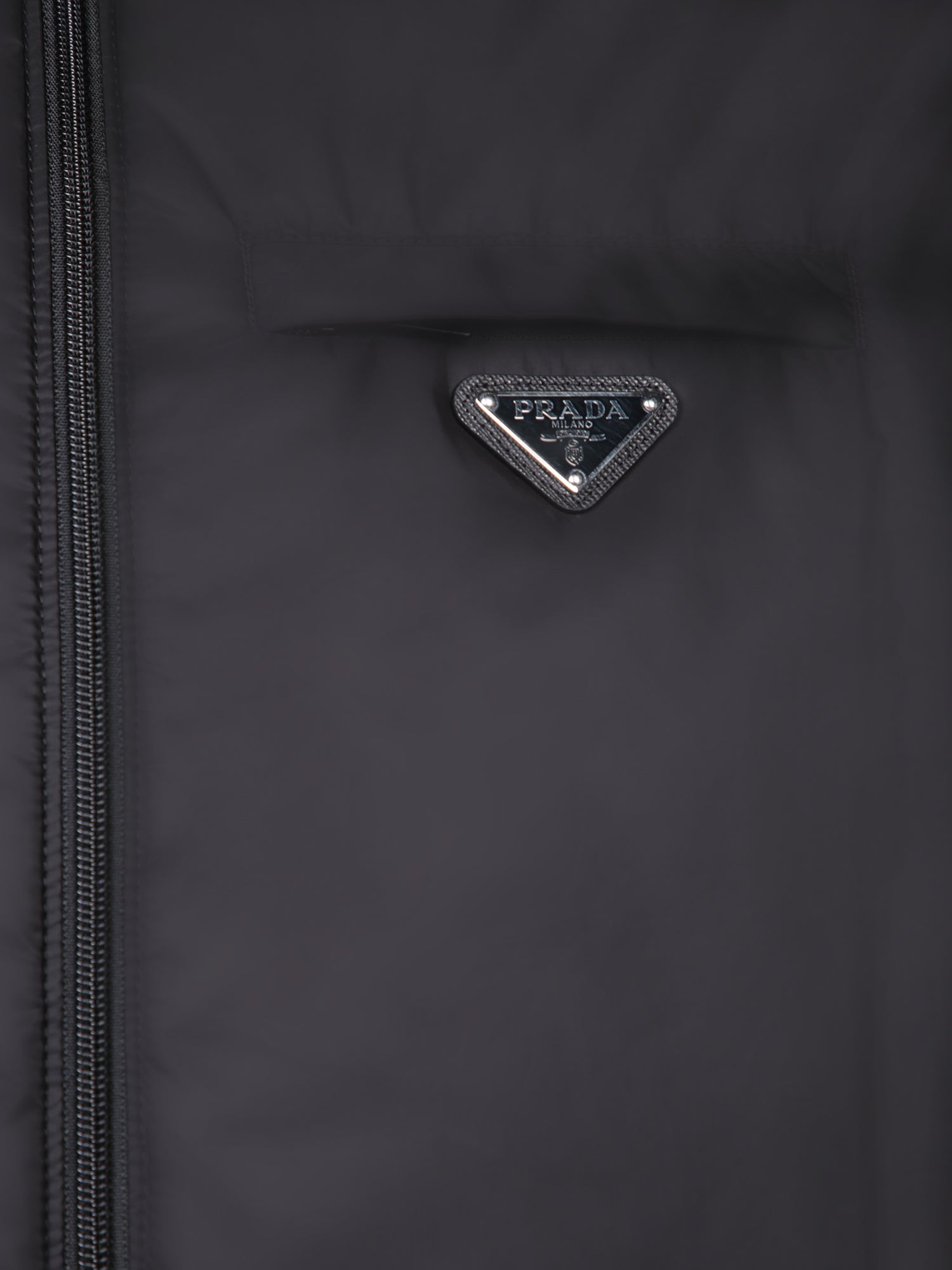 Hooded parka with front zip closure and metal triangle logo on the pocket.