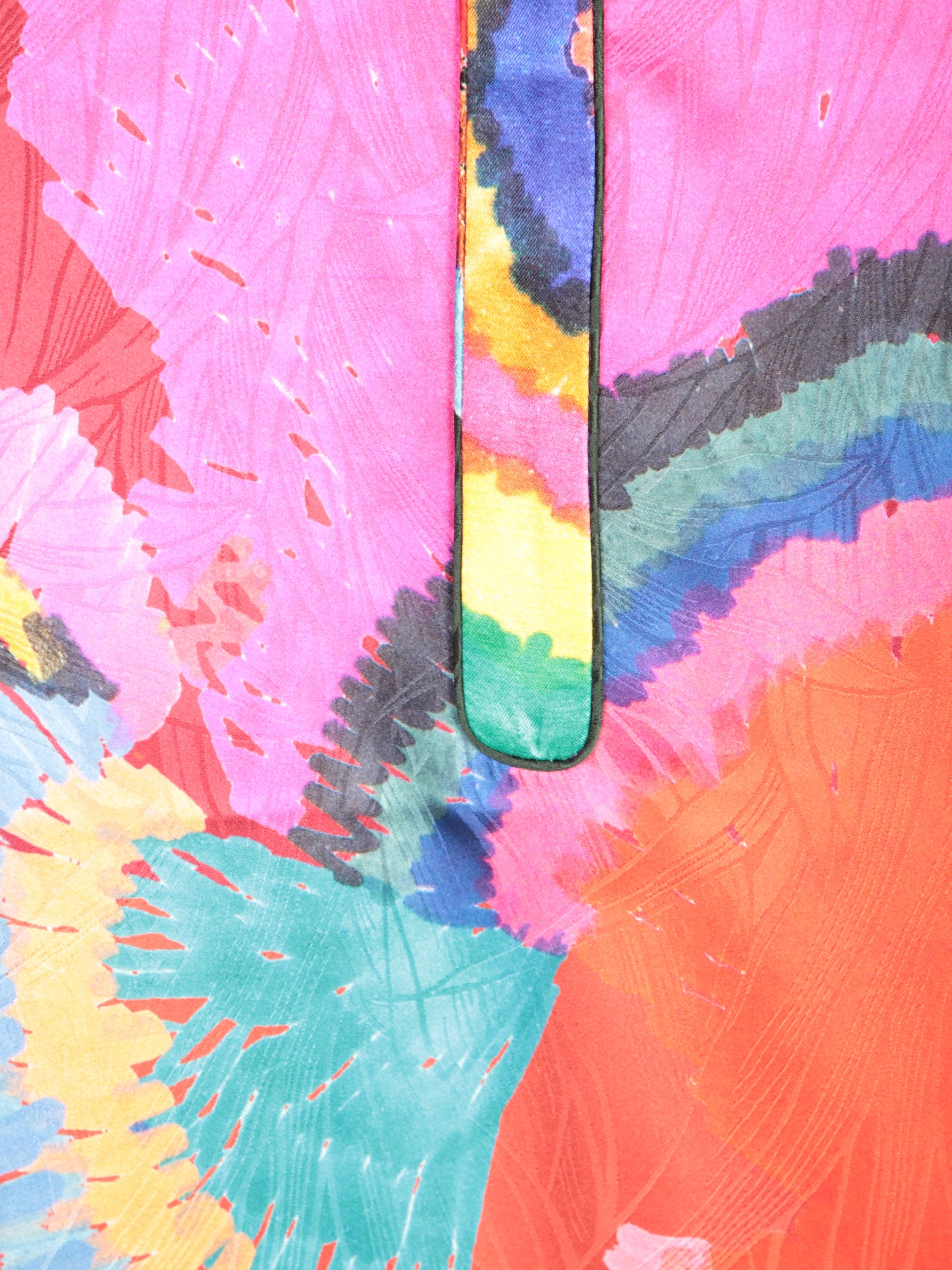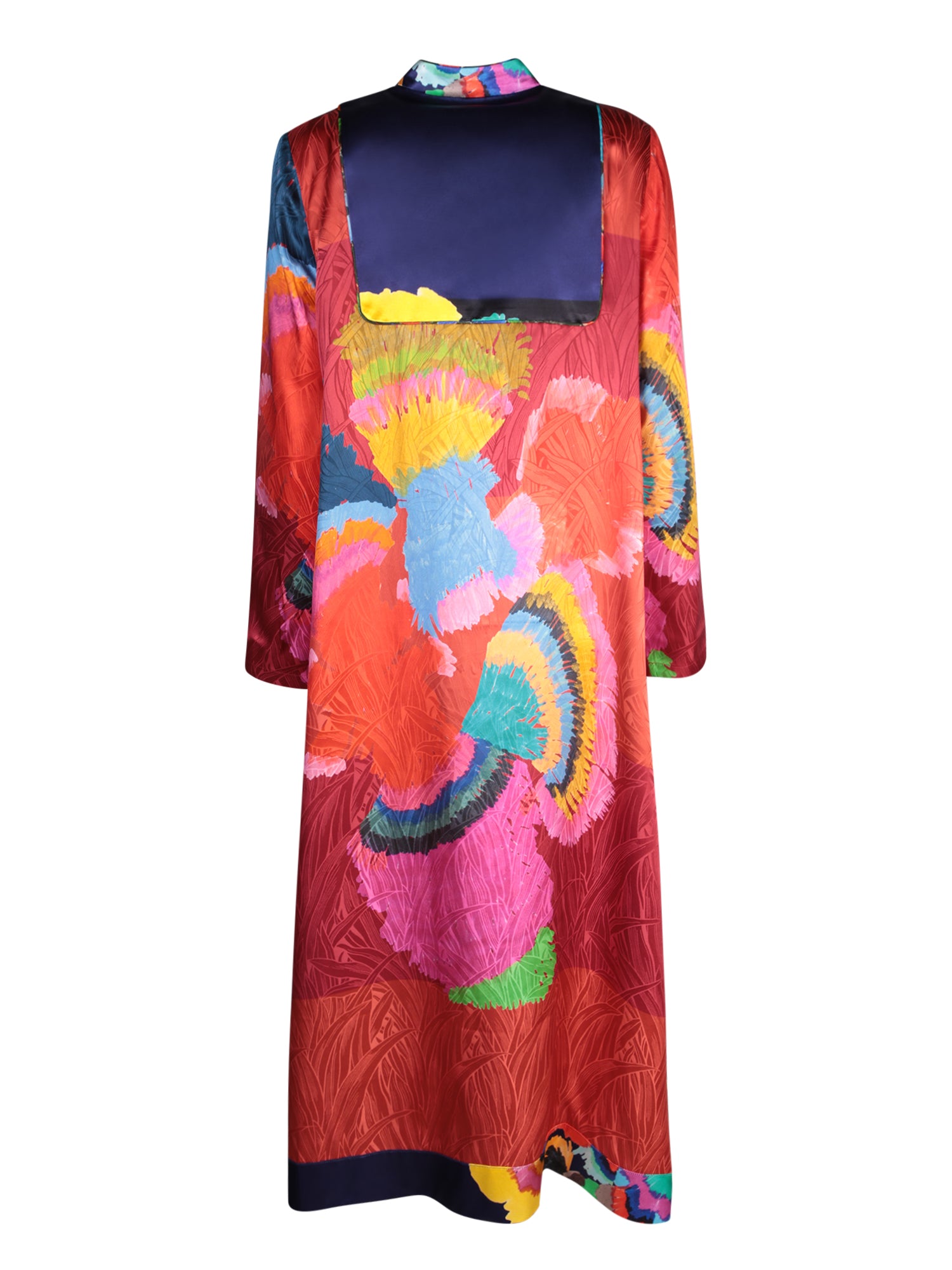 This vibrant kaftan, designed with an exclusive multicolored papagalos print on a coral base, exudes a playful yet sophisticated aesthetic. A relaxed fit with a partially buttoned front placket offers both comfort and style, perfect for laid-back yet styl
