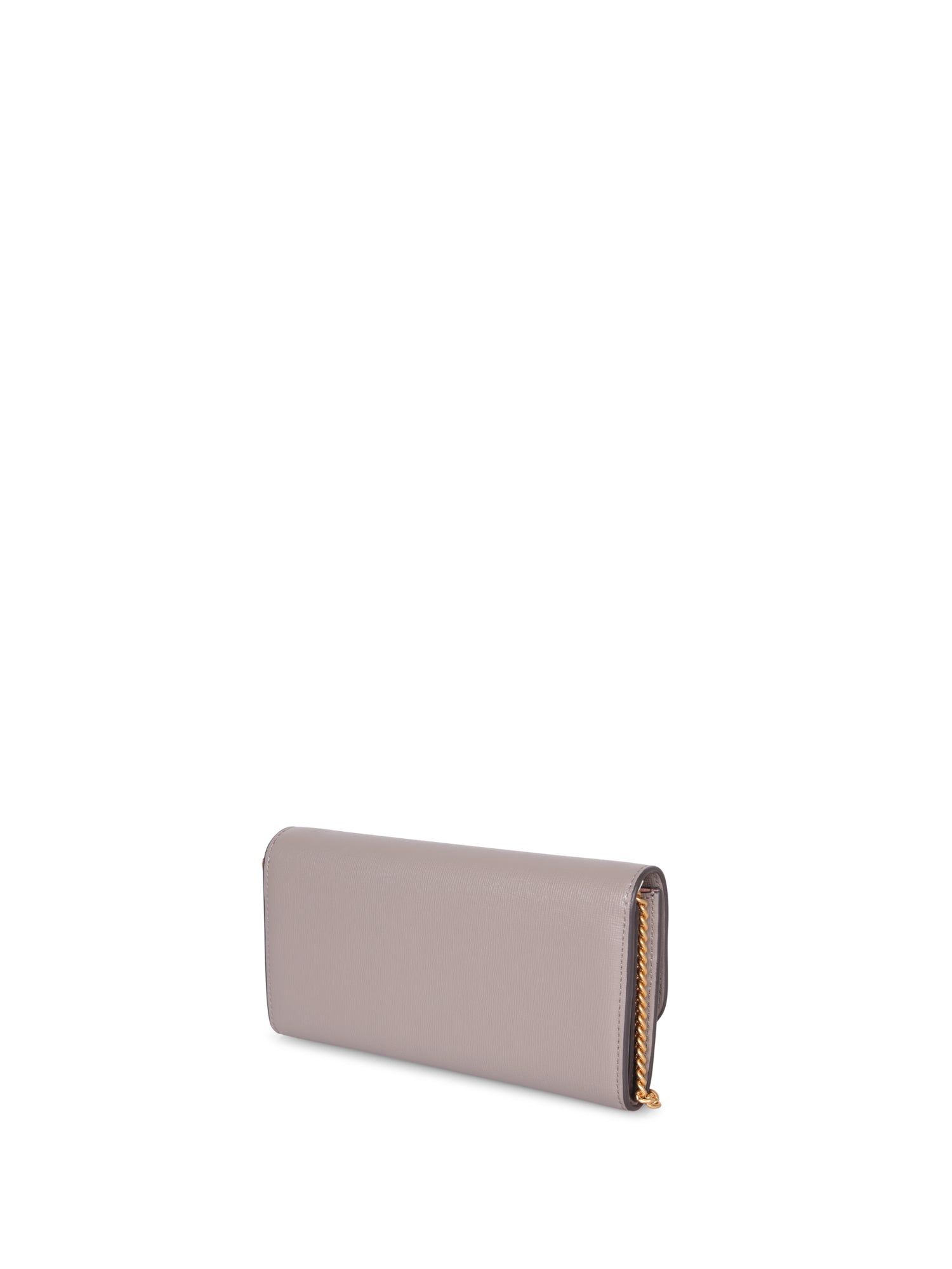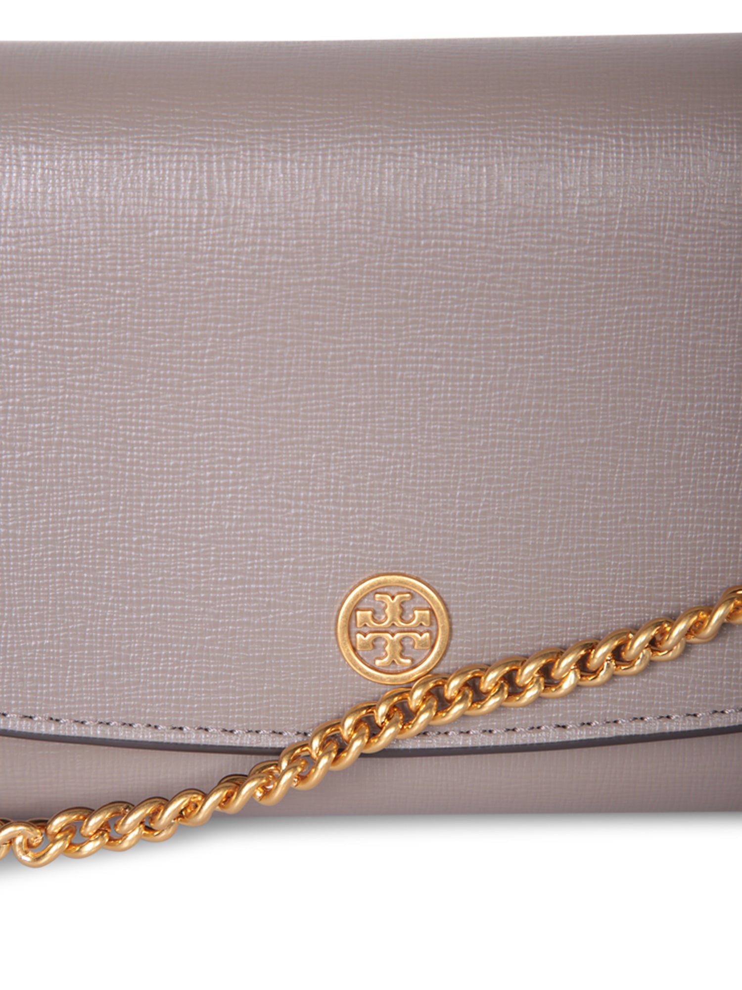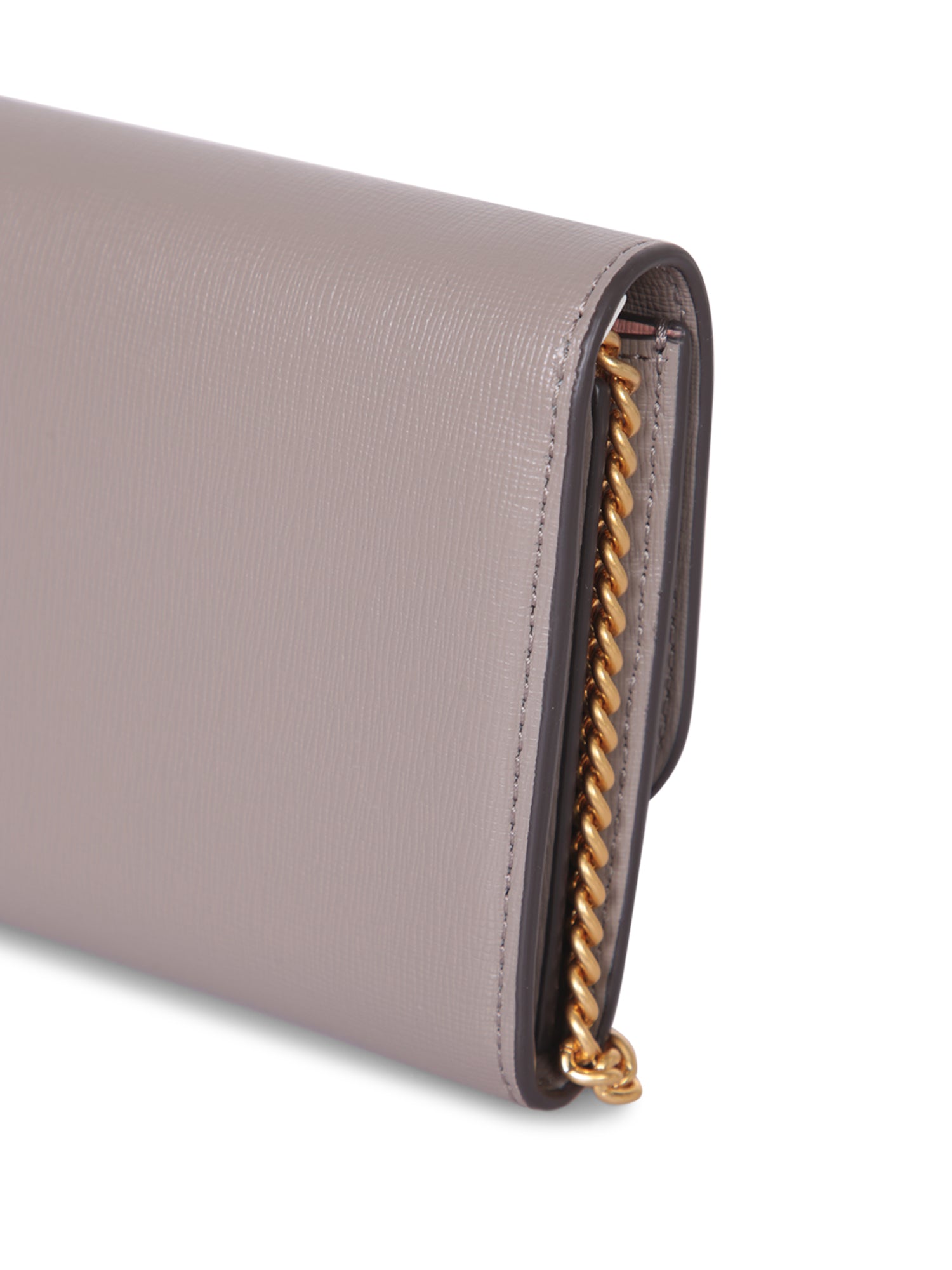 Saffiano leather crossbody bag. Gold-tone chain as strap. Magnetic snap closure.