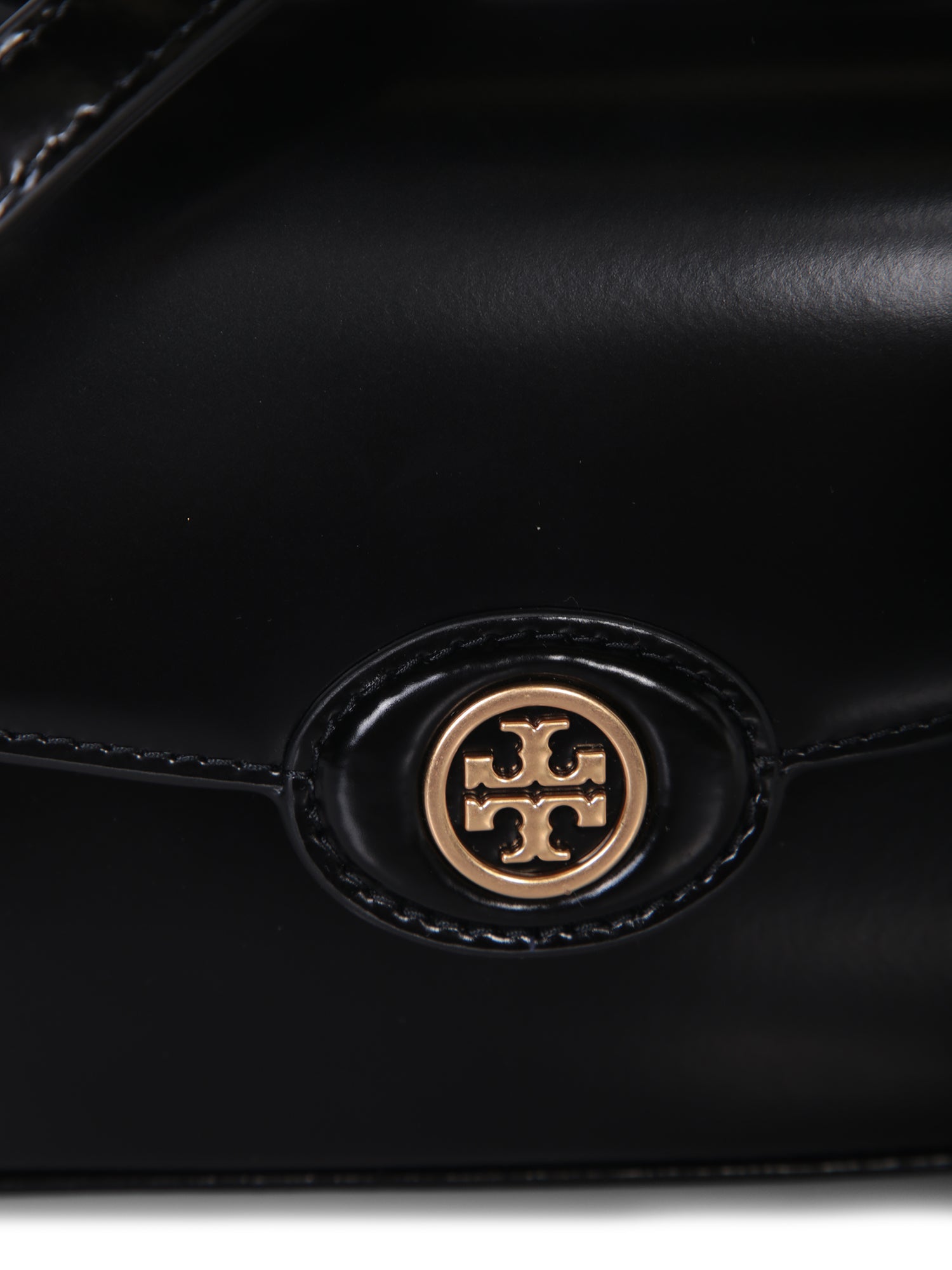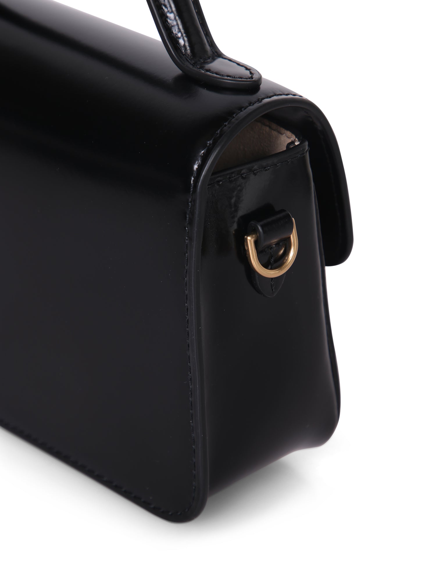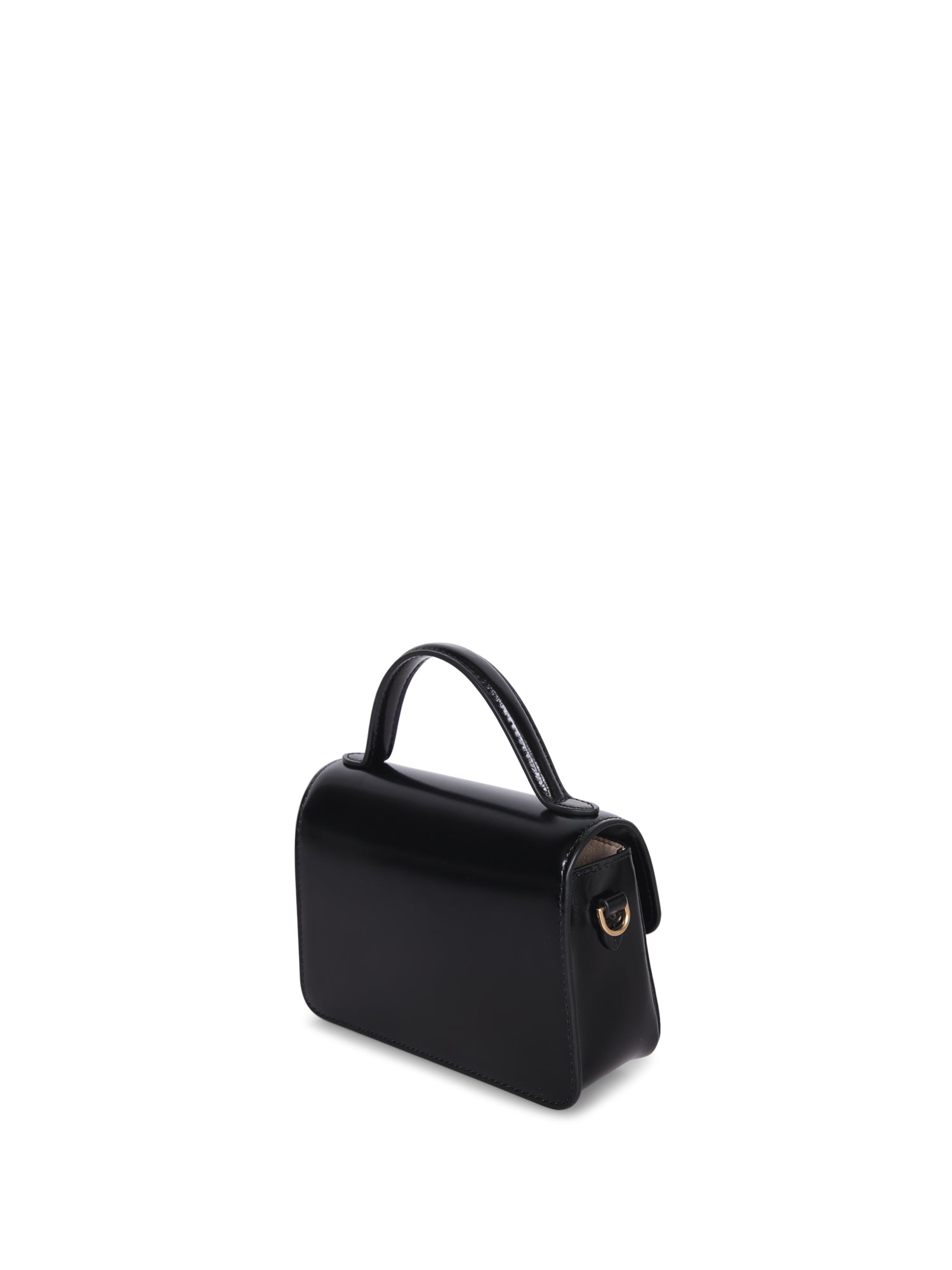 Mini bag in glossy leather. Central golden logo detail. Adjustable and removable shoulder strap.