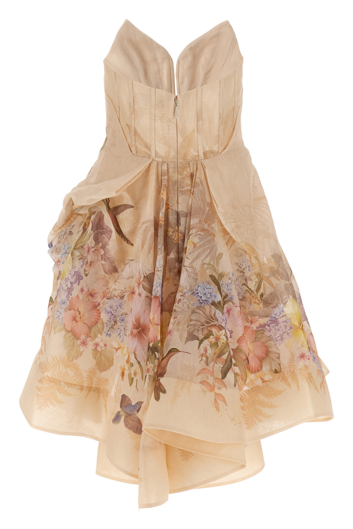 'Illuminate Draped Mini' off-the-shoulder dress in silk and linen with slats, deep plunge neckline, asymmetrical hem, layered skirt with draping, back zip closure.