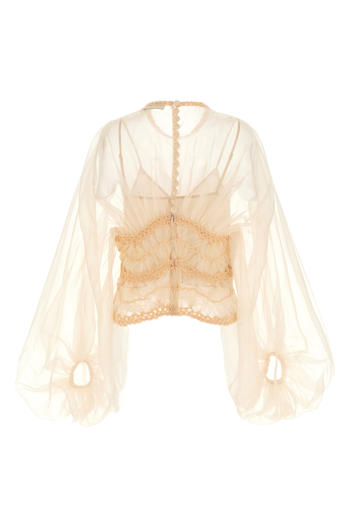 'Illuminate Macrame' semi-transparent silk organza blouse with macrame details, crew neck, long balloon sleeves with elastic cuffs, zip and back button closure, removable top.
