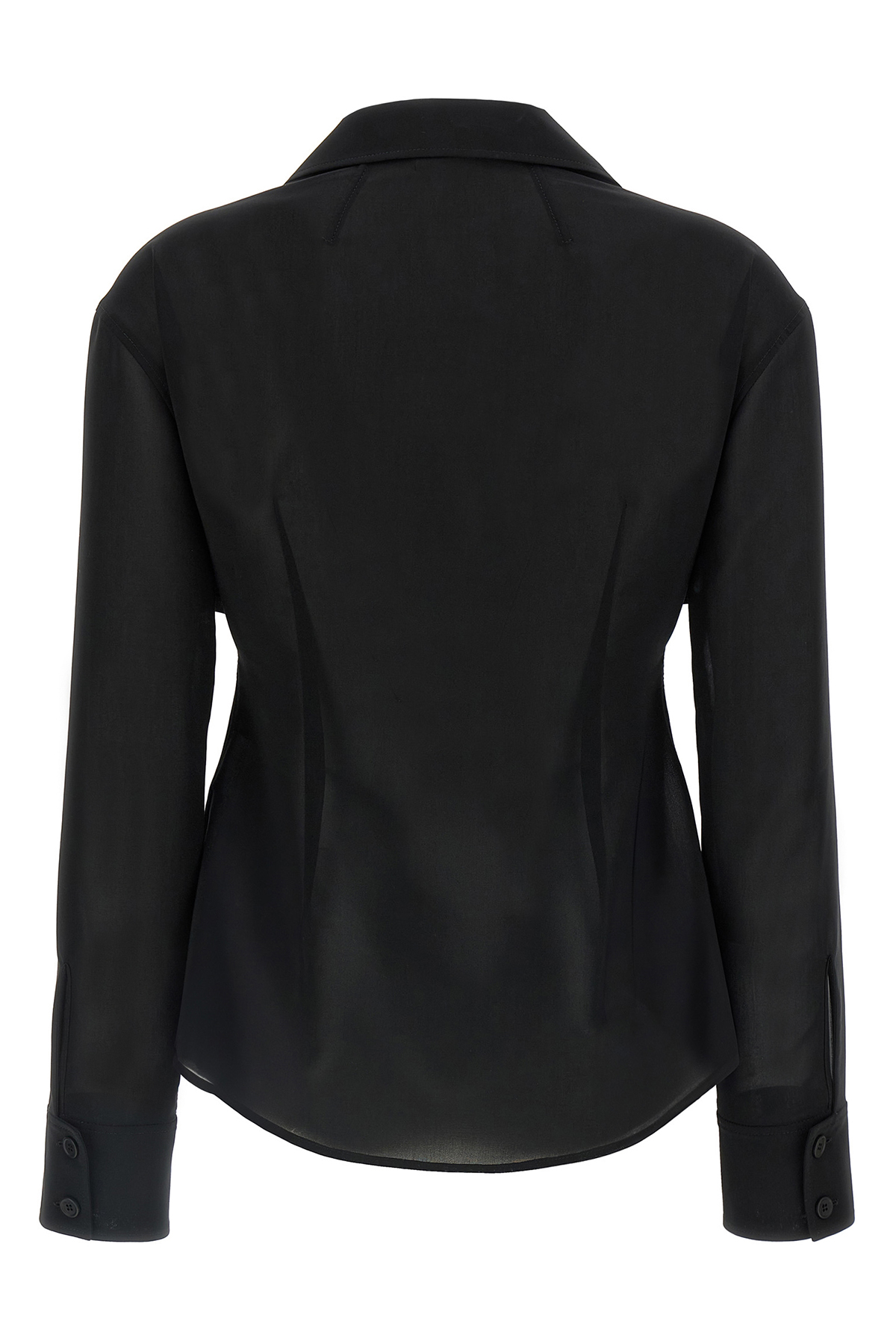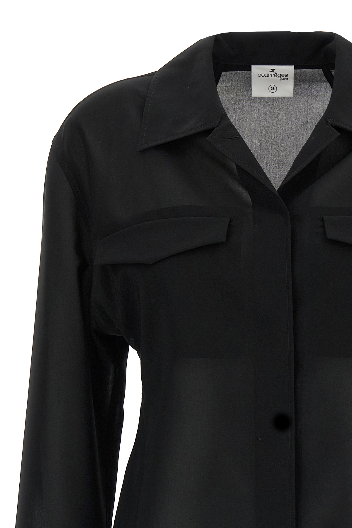 Semi-transparent cotton blend shirt, front pockets, collar, side logo embroidery, long sleeves.