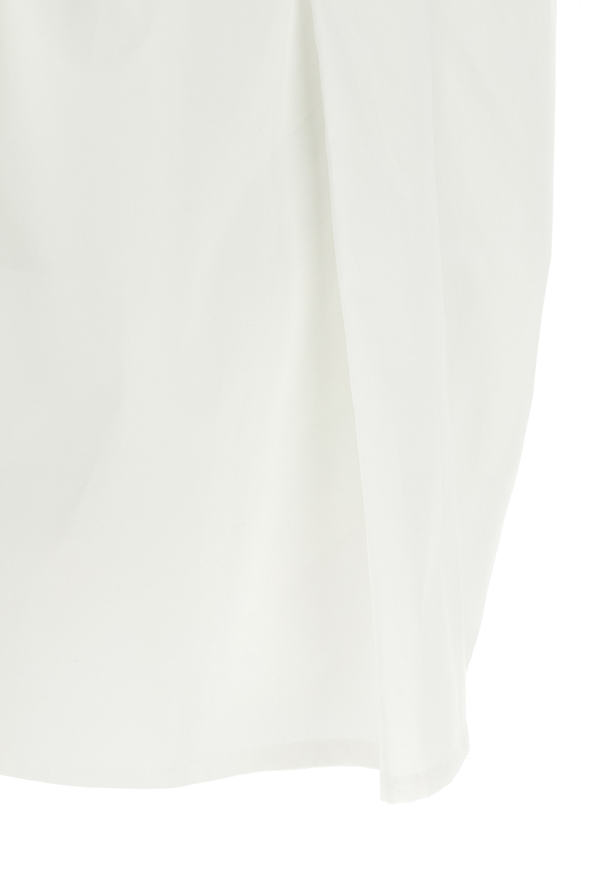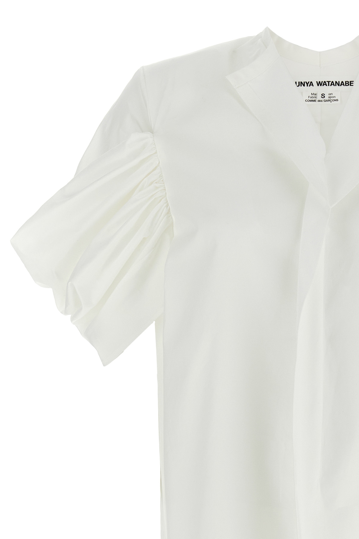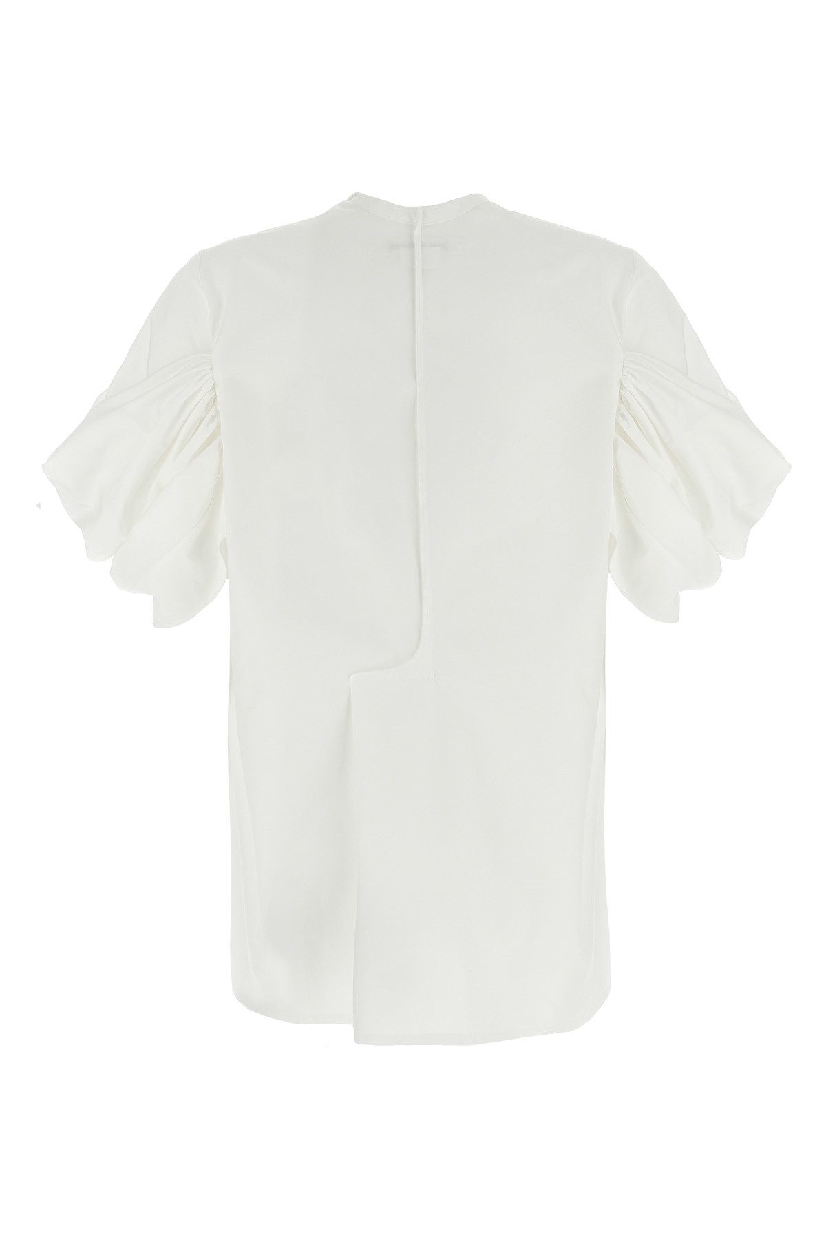 Cotton poplin blouse with short sleeves with curled flounce detail, V-neck, back split.