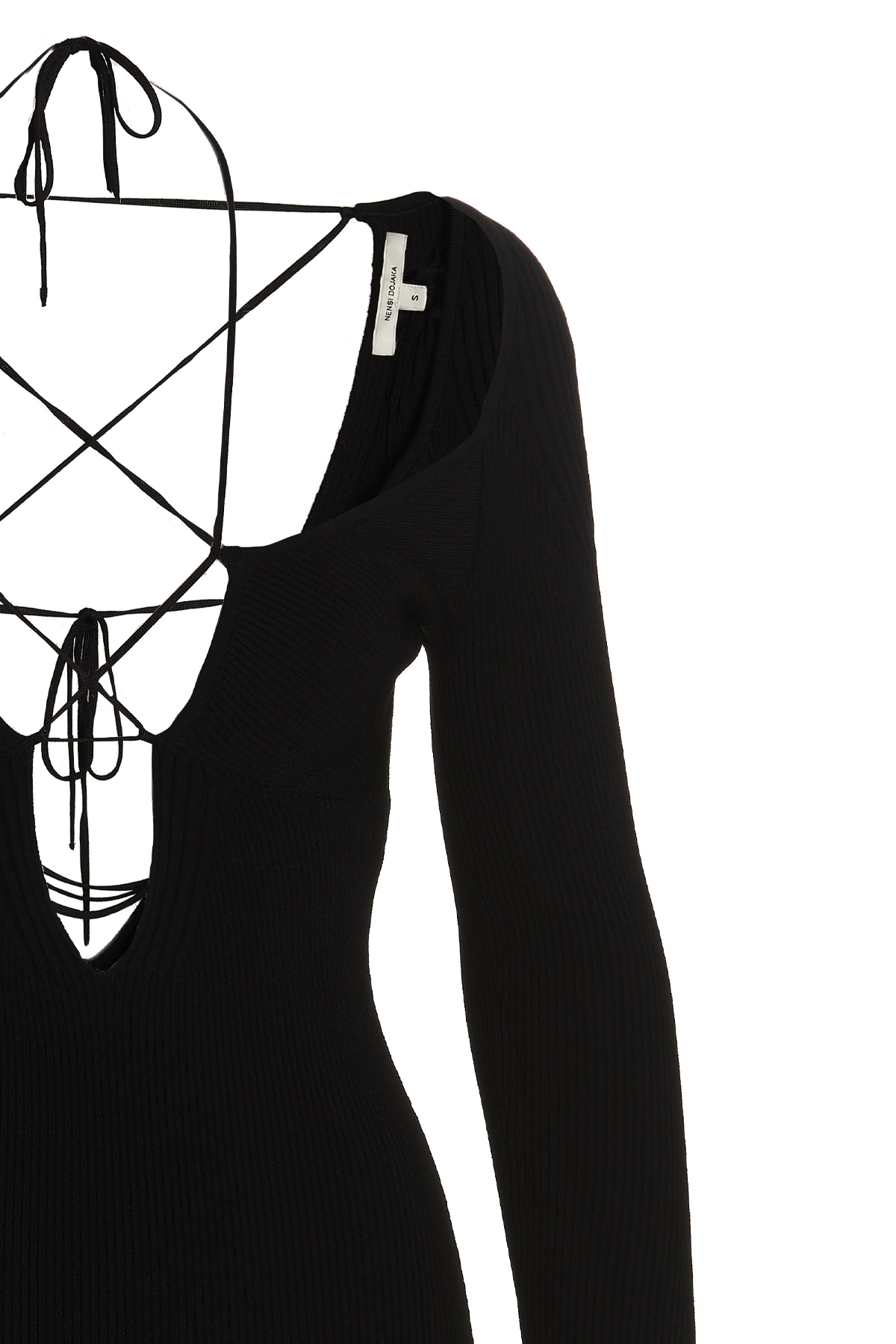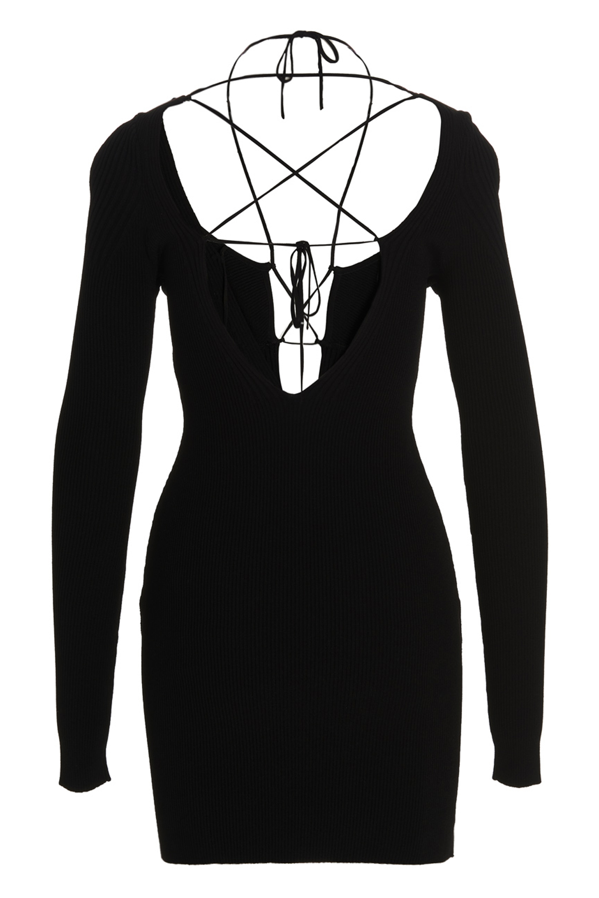 Ribbed viscose minidress with plunging neckline at the front and back and a lace-up detail. Long sleeves style.ed model.