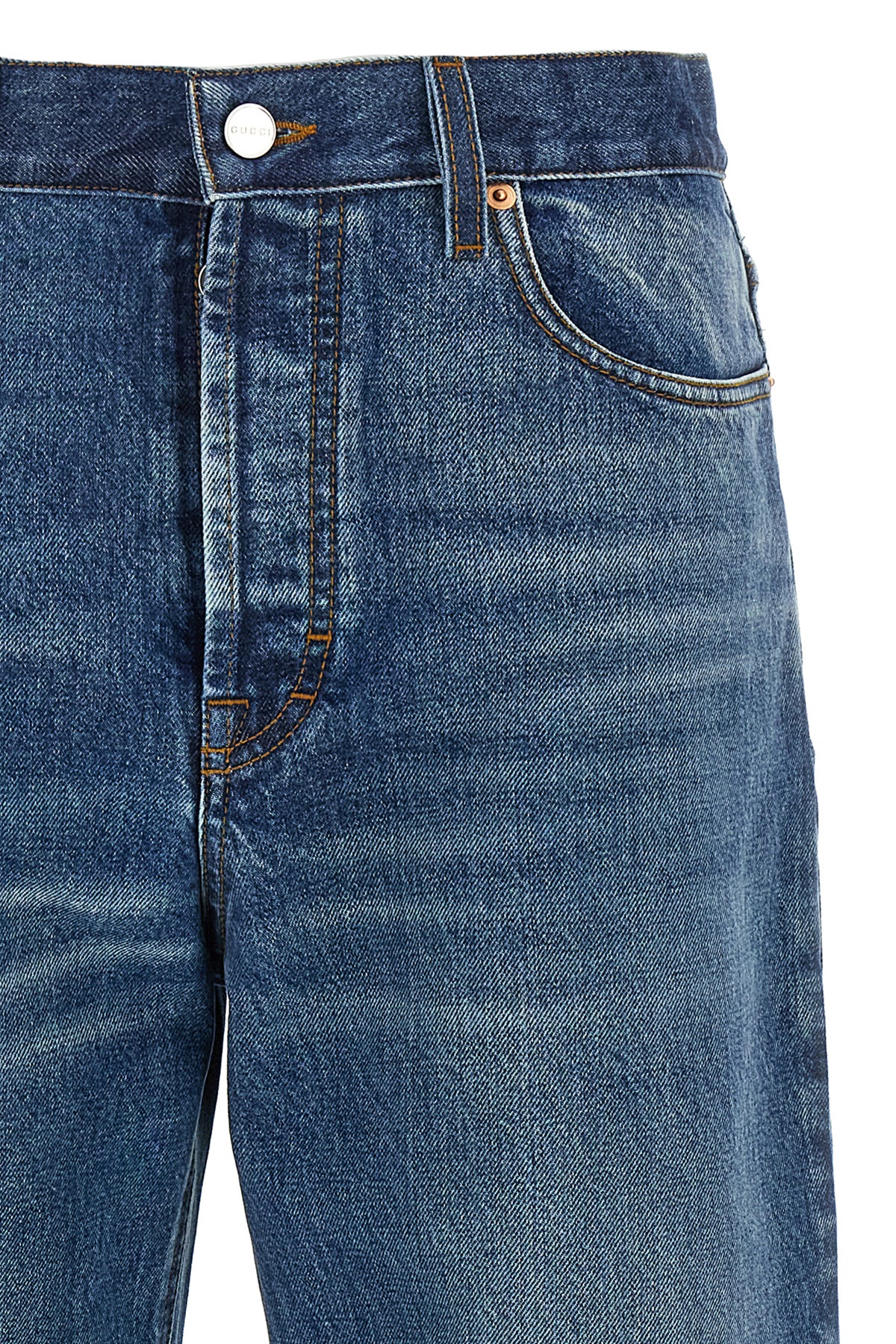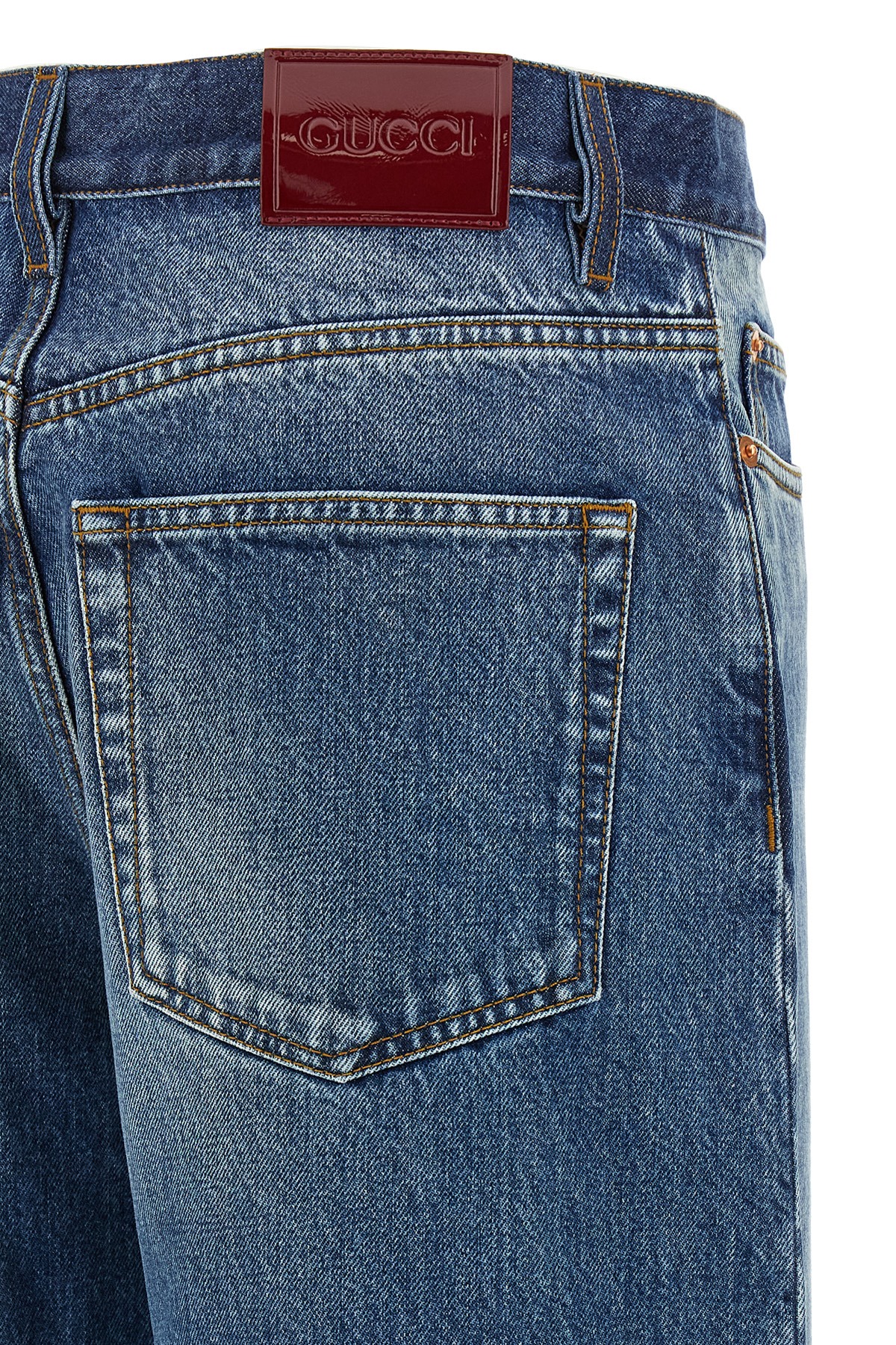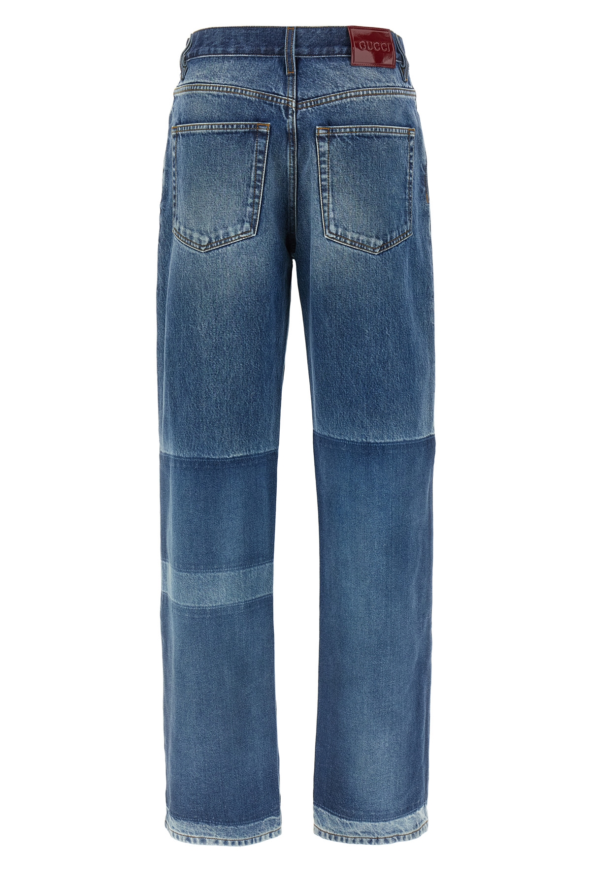 Two-tone cotton denim jeans with lightened stonewashed treatment, slightly low crotch, wide leg, front button closure, five pockets, split at the bottom of the leg, 'Gucci Rosso Ancora' naplak logo at the back.