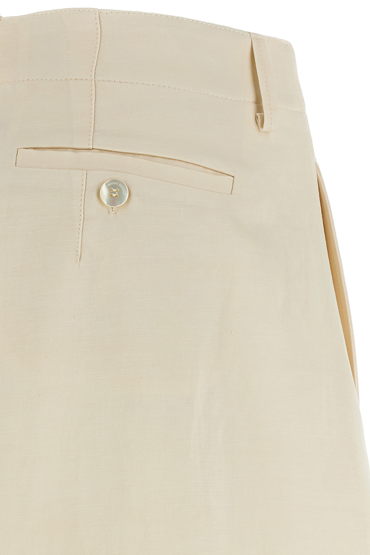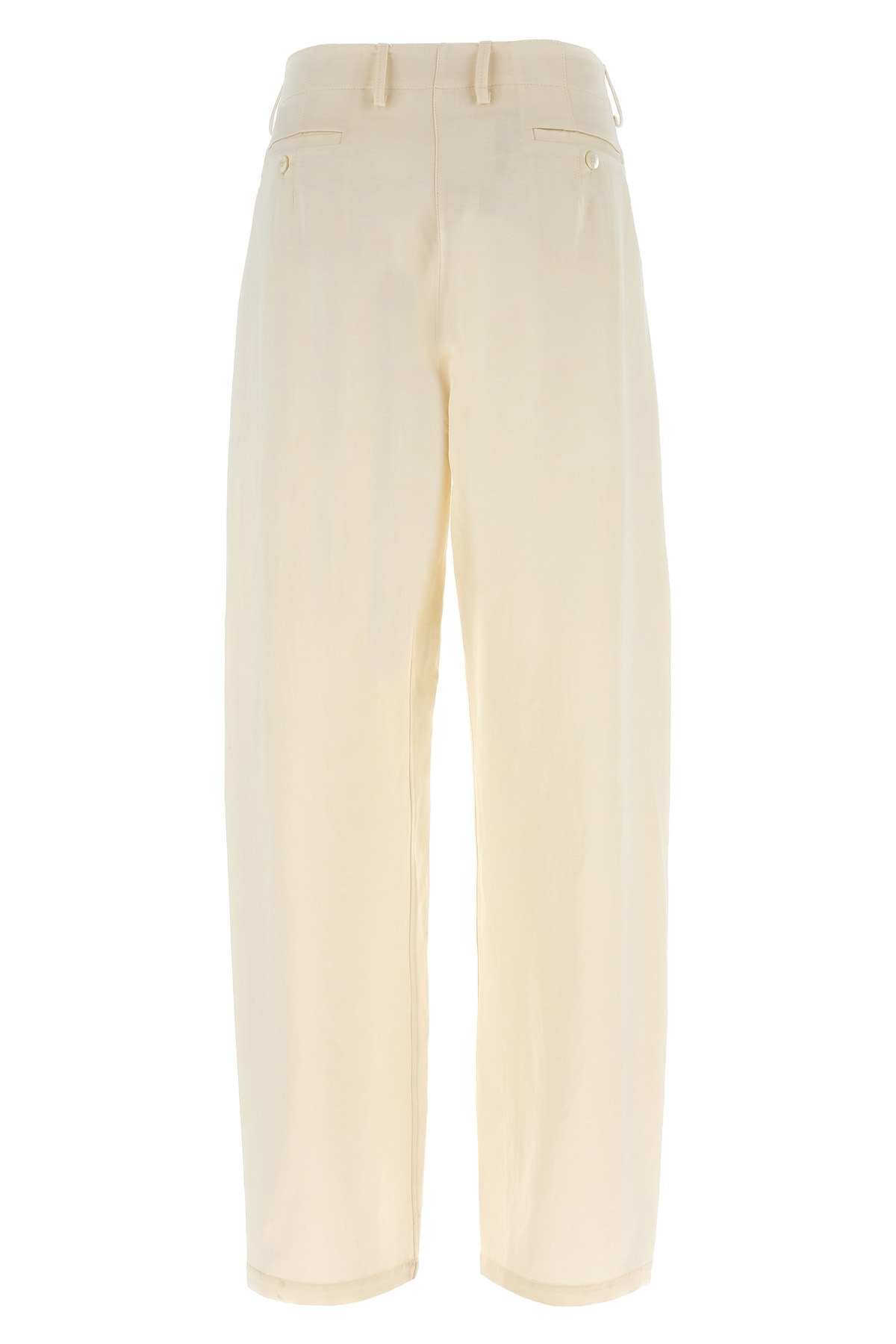 '08' stretch cotton trousers with silk sheath, wide leg and slightly low crotch, asymmetric leg stitching, zip hook and front button closure, pockets.