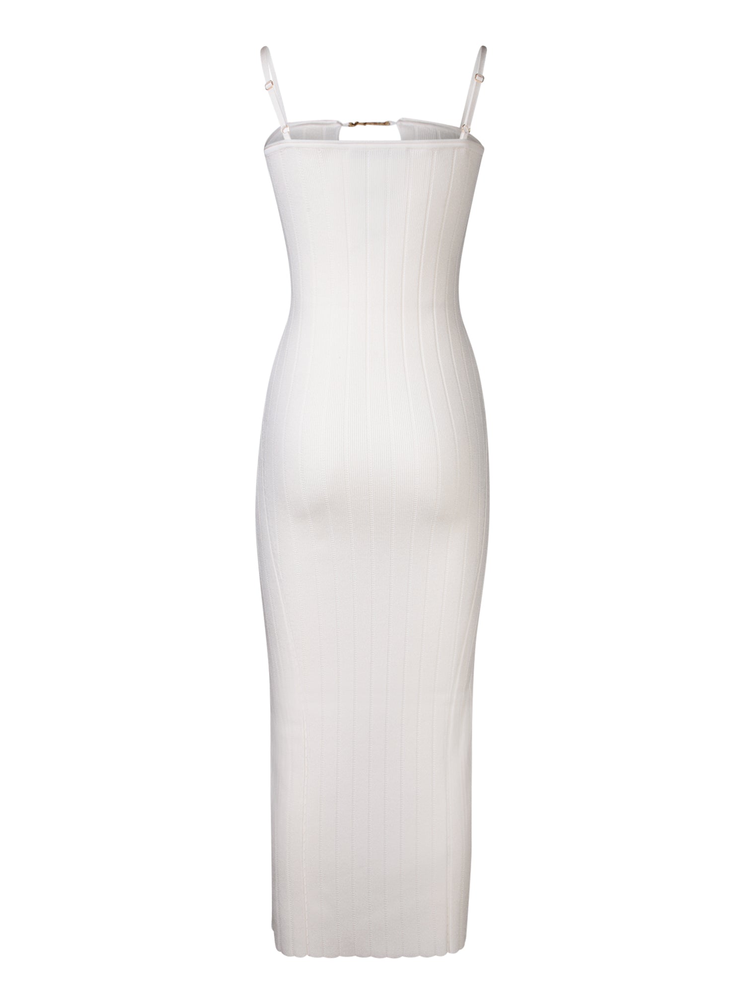 Ribbed knit midi dress. Adjustable thin straps. Gold buckle detail at the neckline.