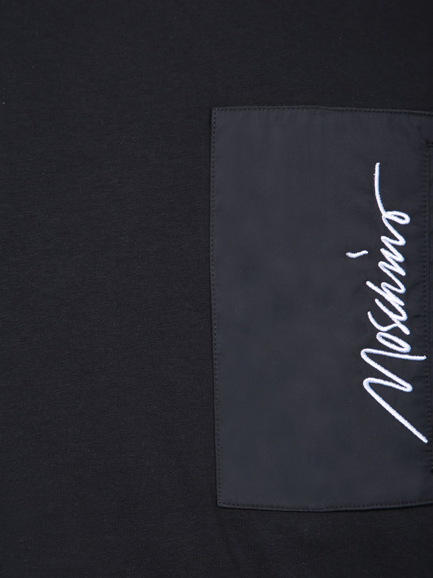 Short sleeve black cotton t-shirt. Features an applied pocket with white Moschino logo.
