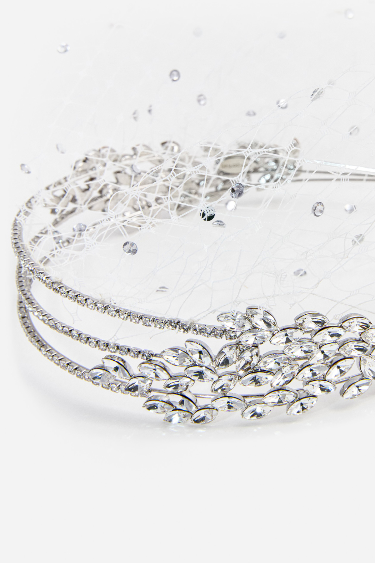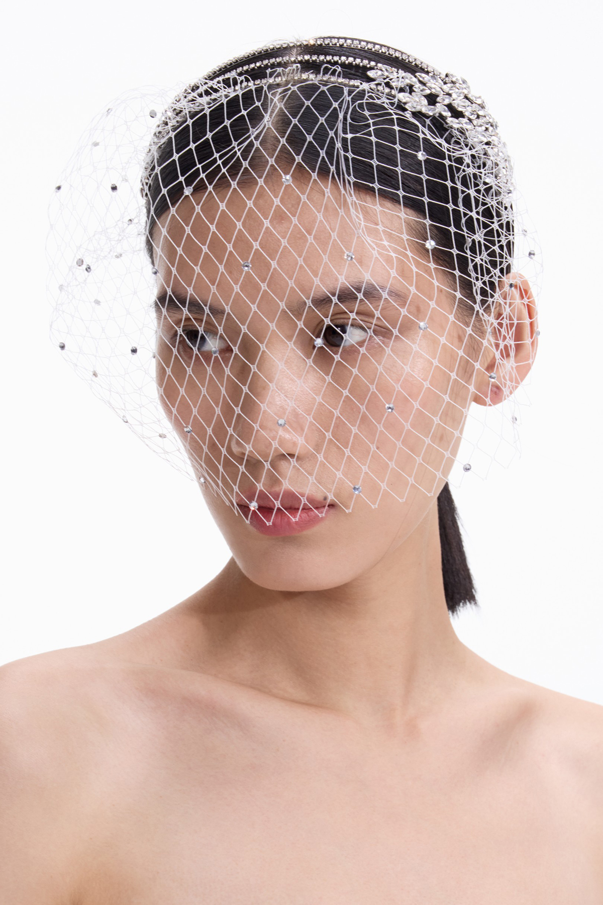 Veil 'Crystal Embellished Veil Headband' composed of a metal headband with three rows of rhinestones and crystals of different sizes and a mesh veil with crystal application.