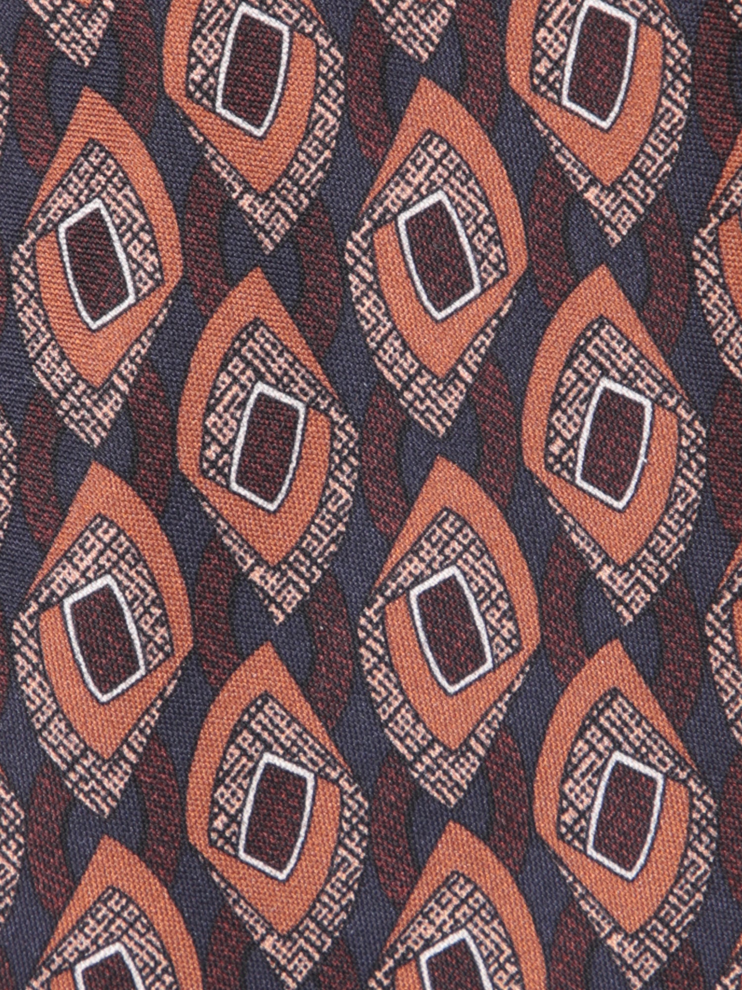 Pure silk tie. Width 7cm. Brown and red geometric pattern.