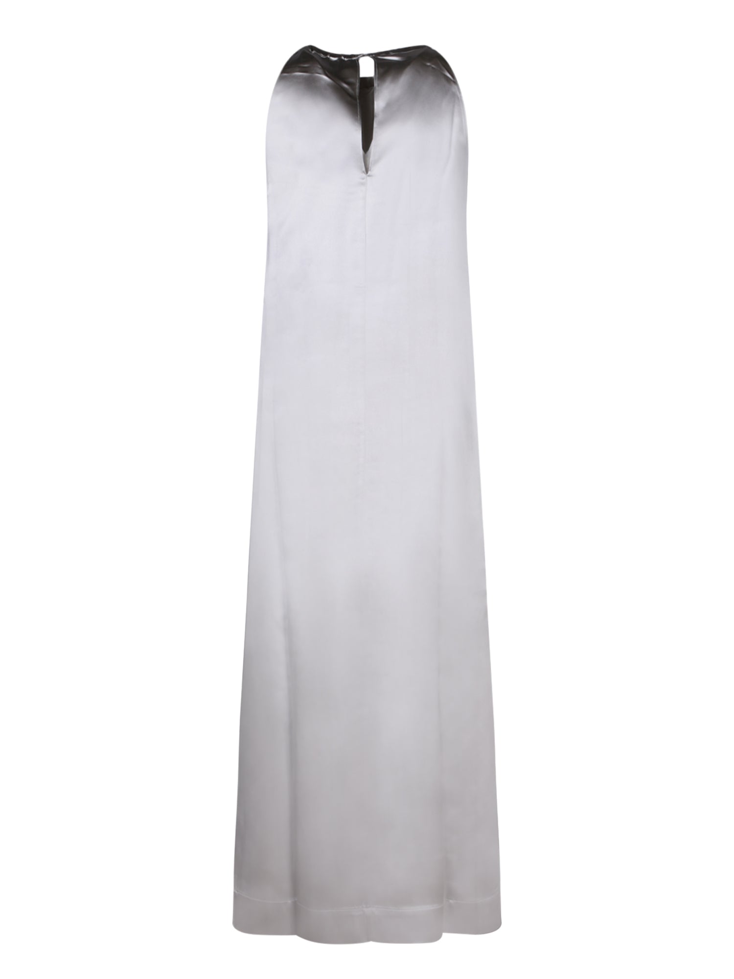 Sleeveless halter design. Draped neckline. Fluid silk and viscose fabric. Column silhouette.
