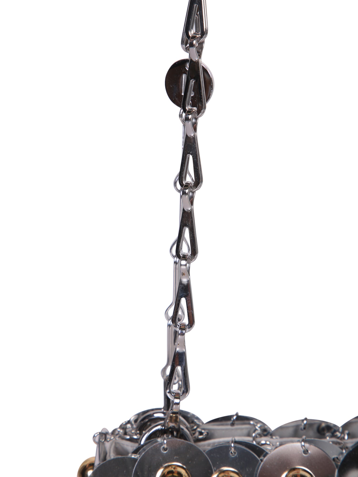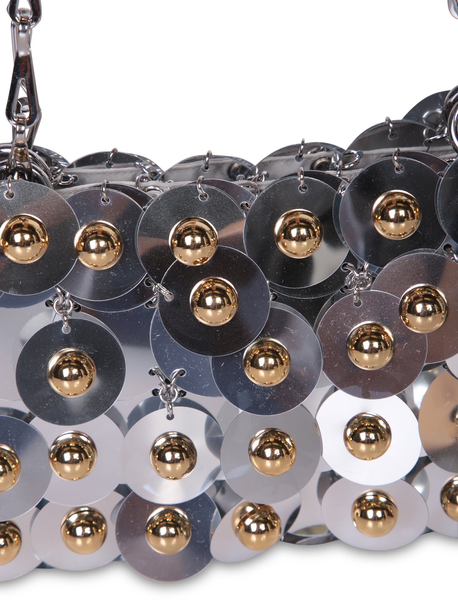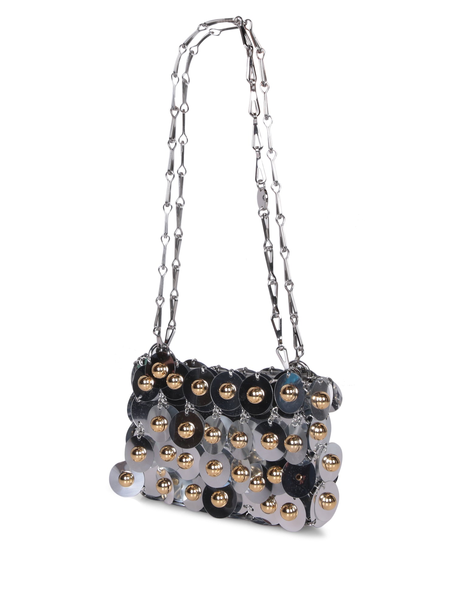 Shoulder bag modeled with silver and gold metallic discs. Sturdy chain for shoulder strap.