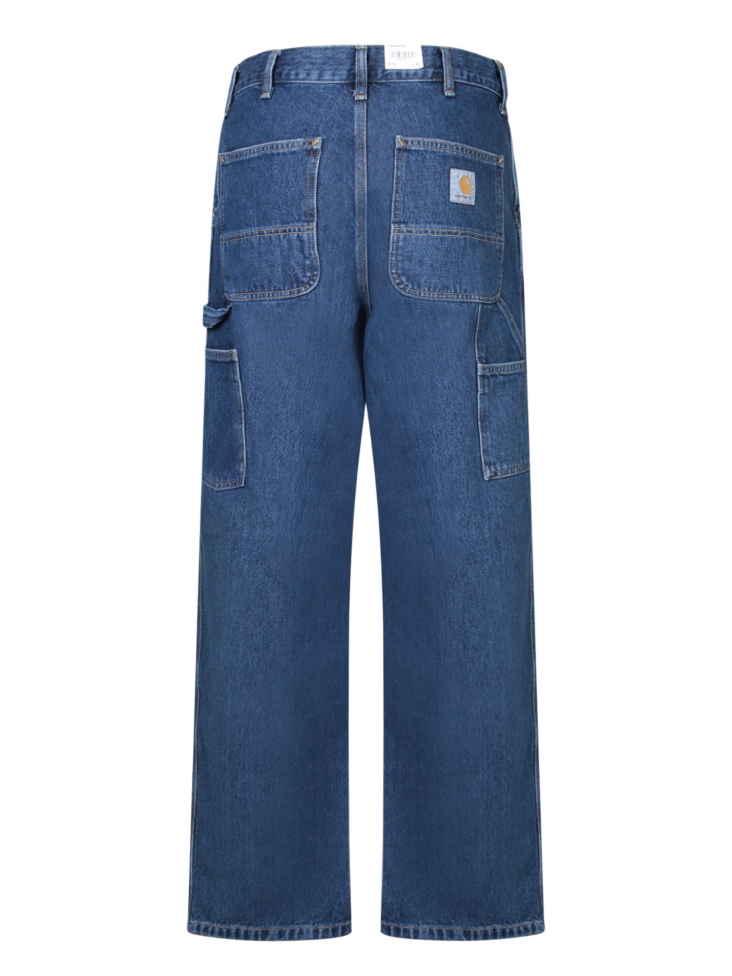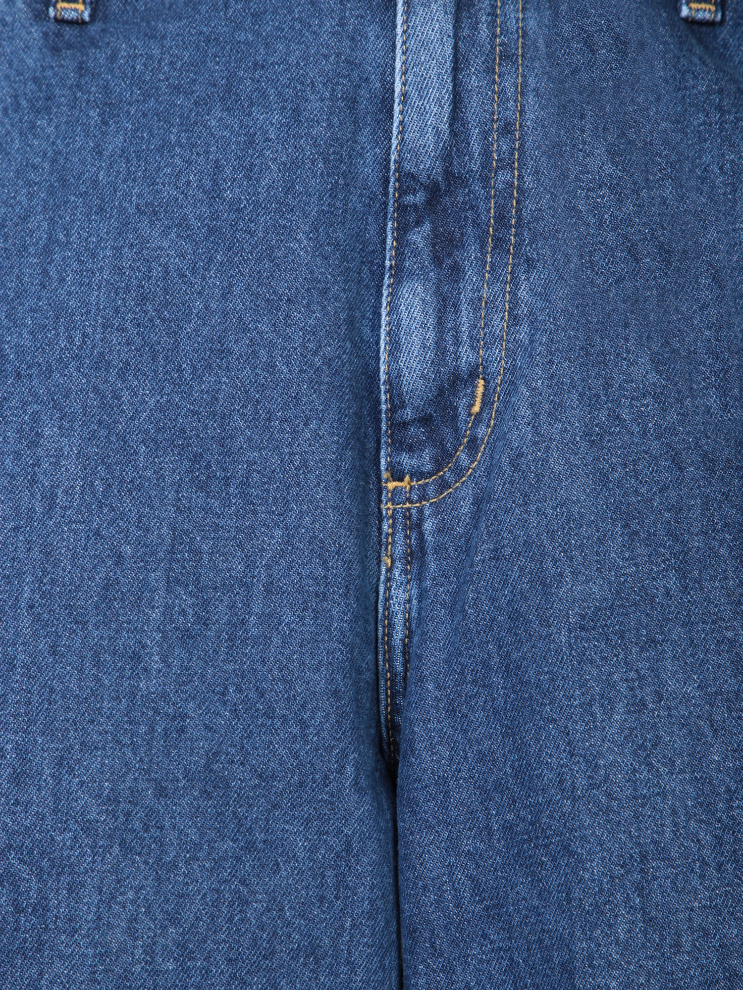 Sturdy denim pants. Adjustable waist with belt loops. Front button and zip closure.