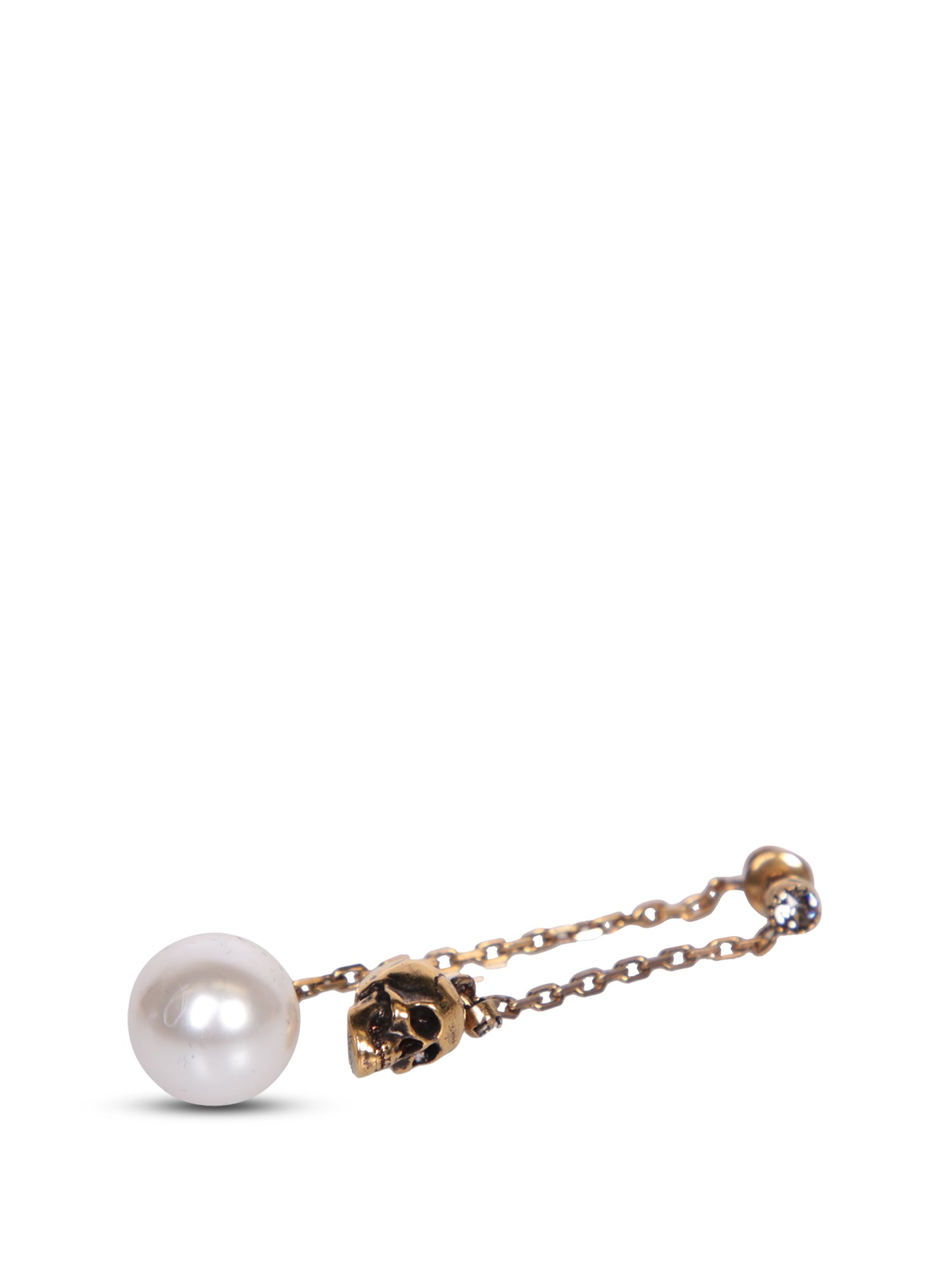 Alexander McQueen earrings adorned with a faux pearl and skull, symbolizing the label's distinctly glamour