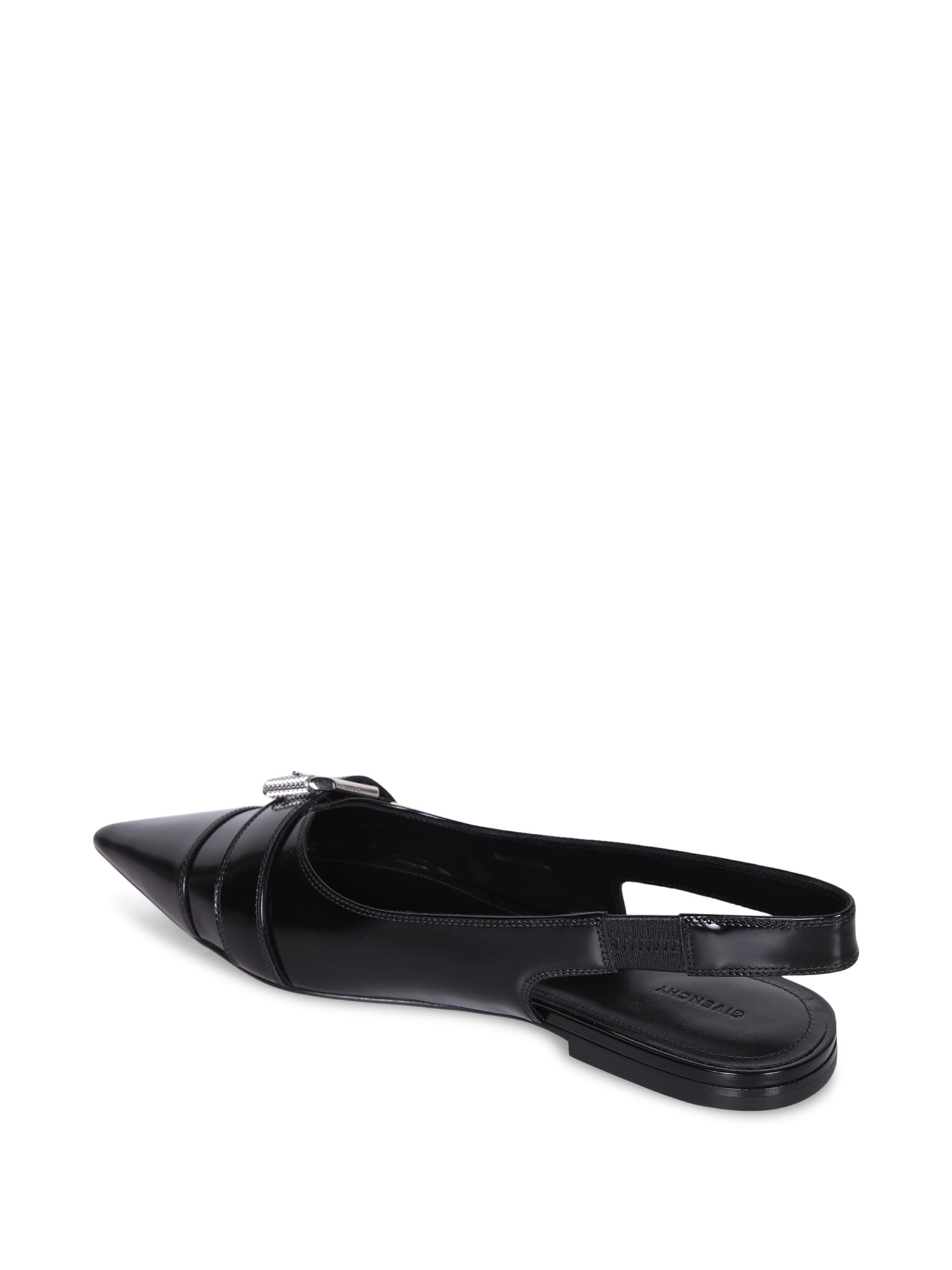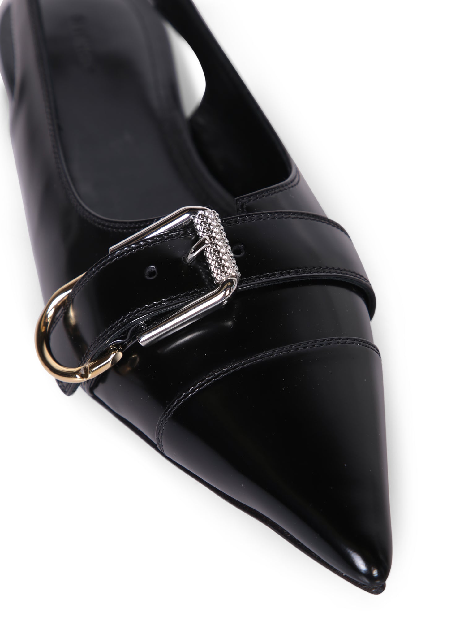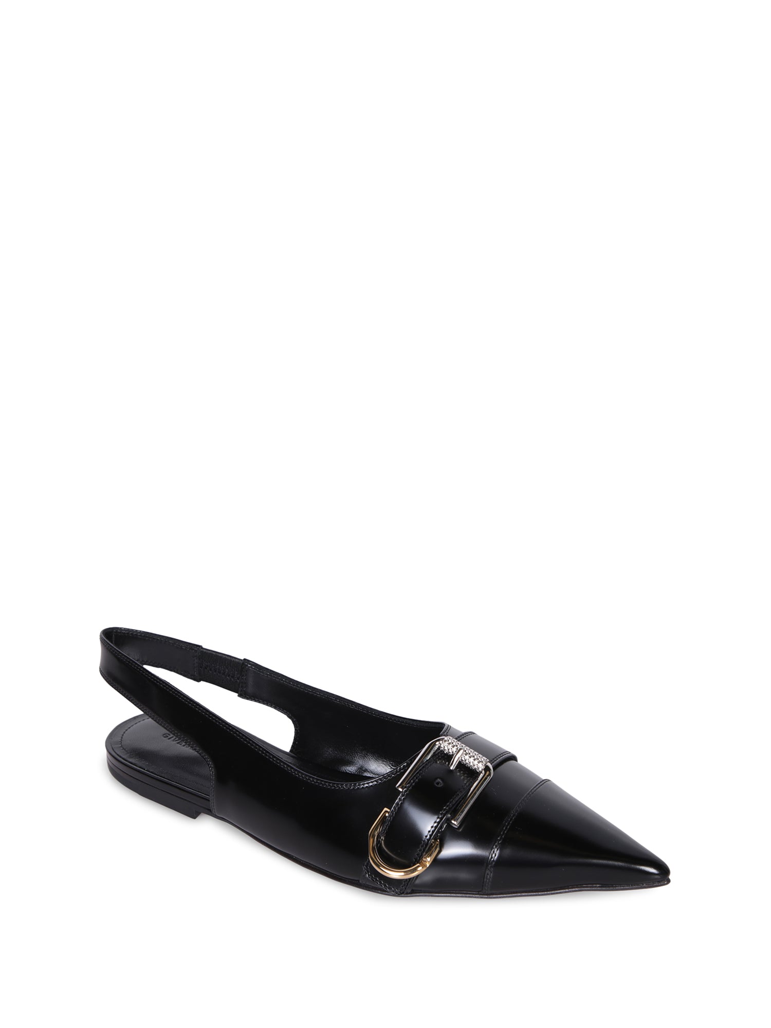 Glossy leather flat slingbacks with a sharp pointed toe. Features a decorative buckle detail and an elastic strap at the back.