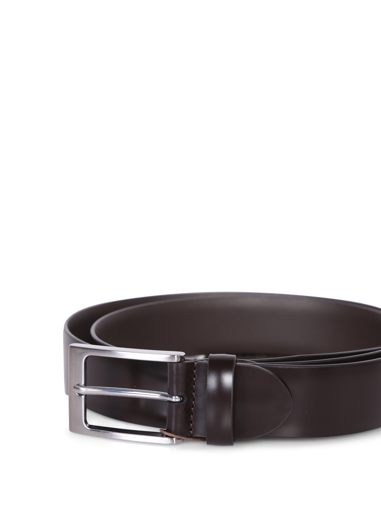 Cordovan leather belt. Rectangular metallic buckle. Single loop.