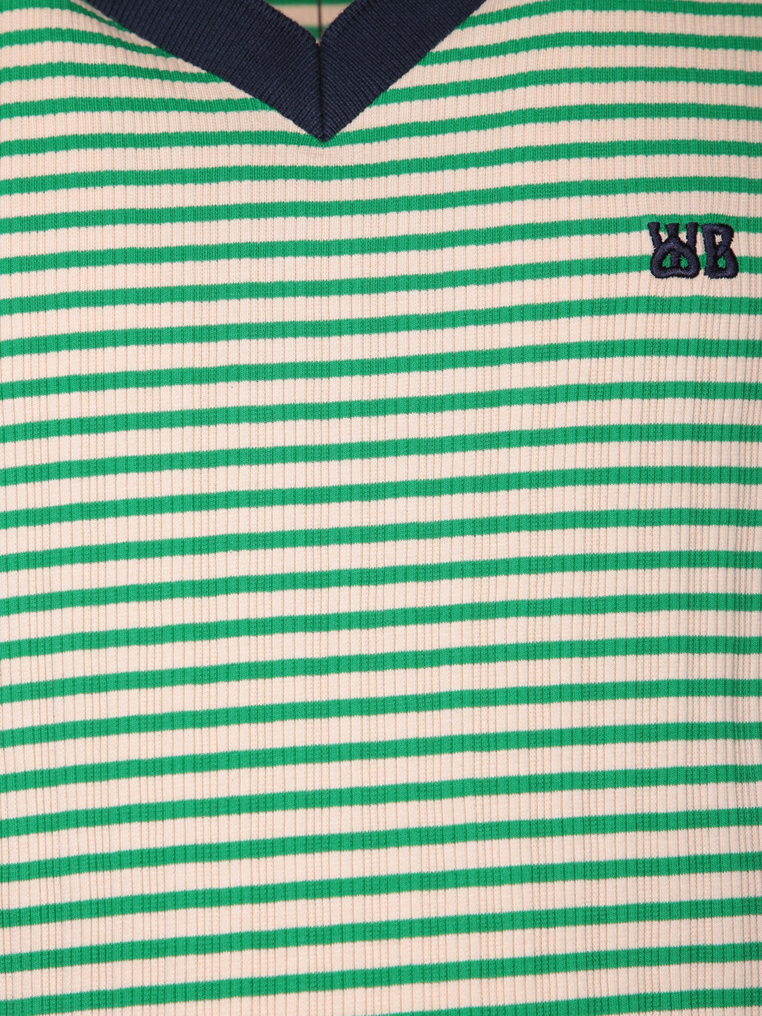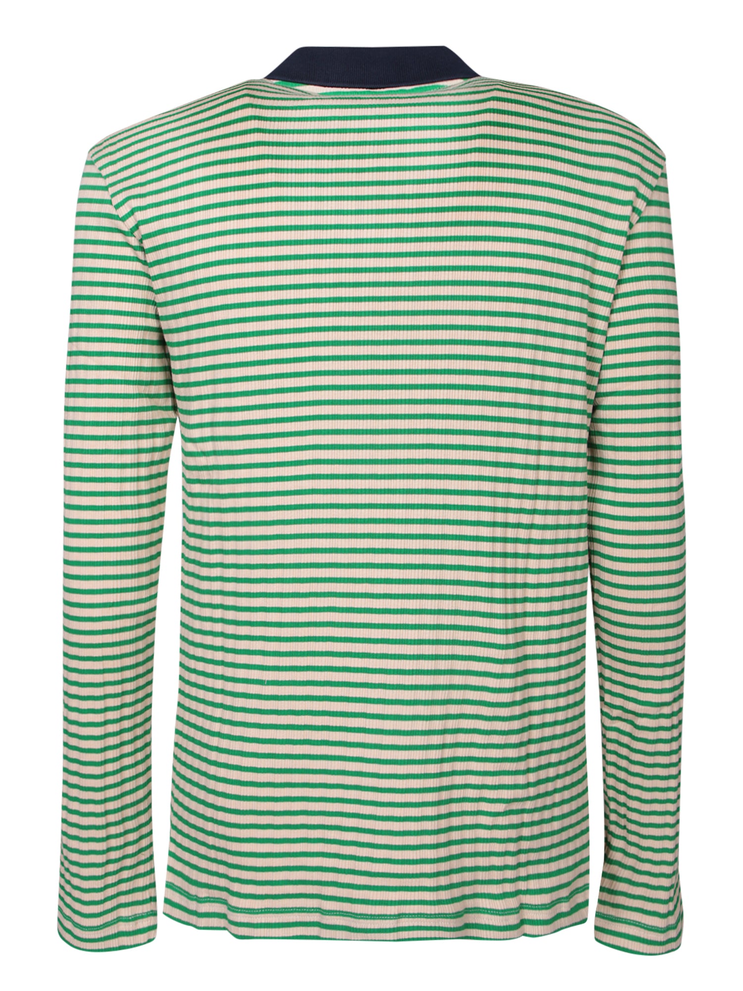 Long sleeve polo shirt. Green and white striped design. Navy blue contrasting collar and sleeve cuffs.