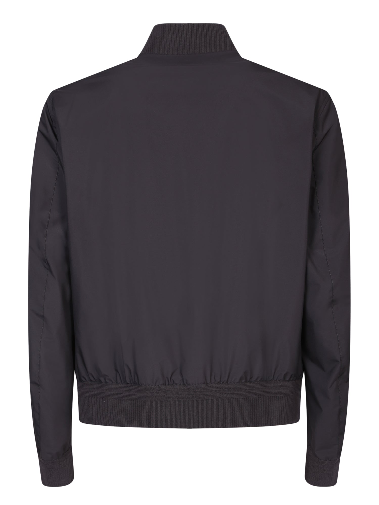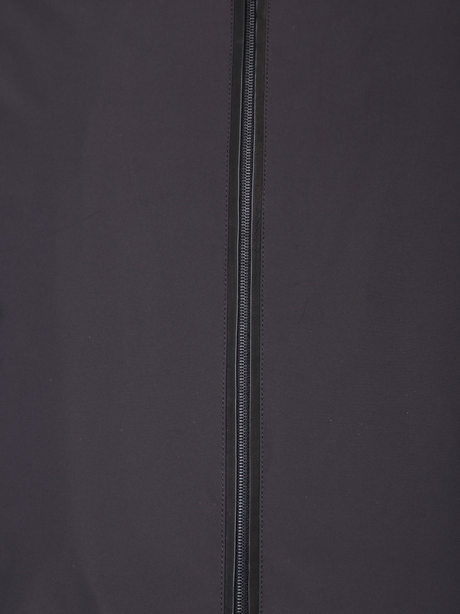 Nylon jacket with zipper closure. Ribbed collar, cuffs, and hem. Side zip pockets.