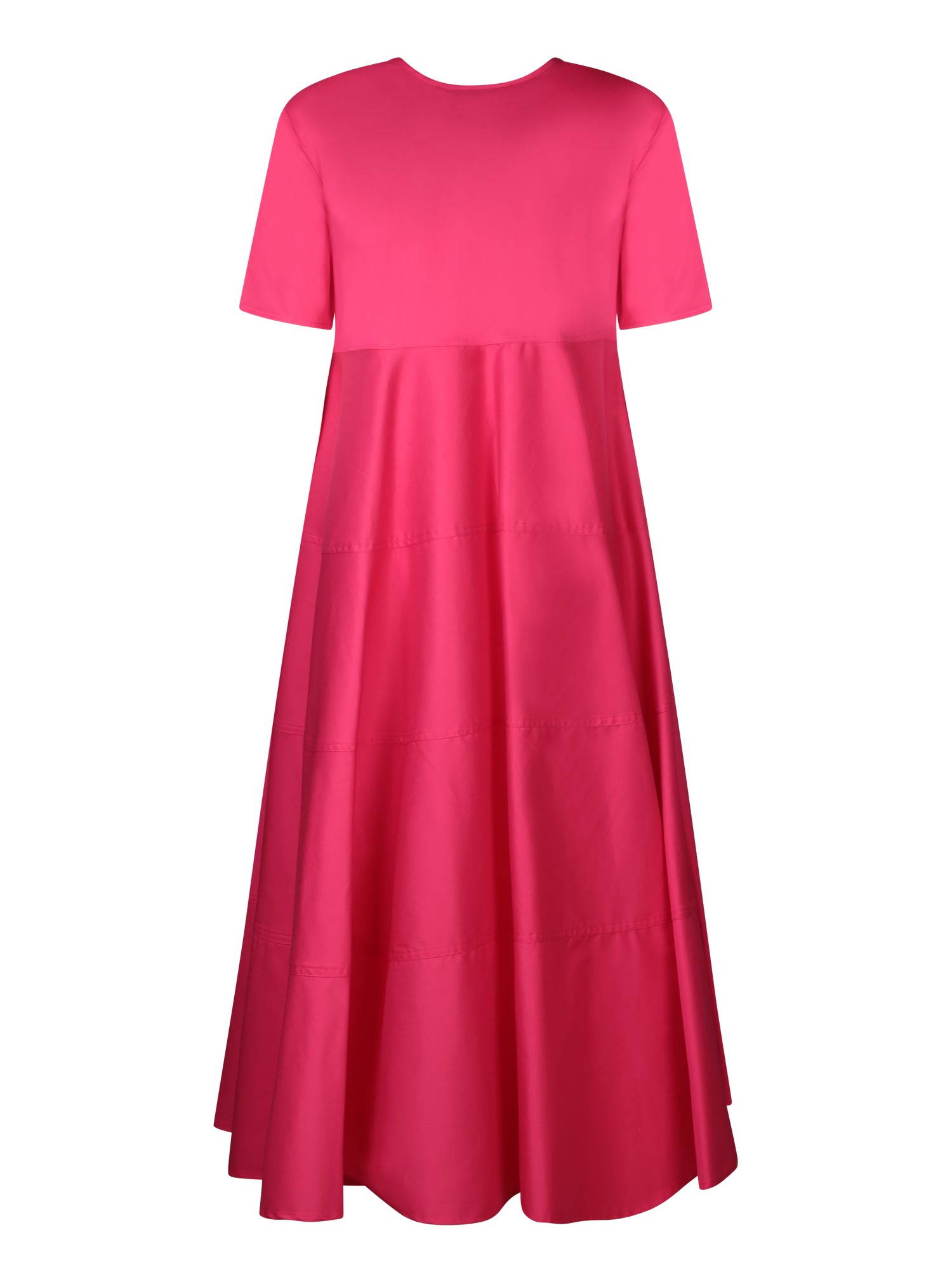 Short-sleeved poplin dress. Strawberry color. Crew neck. Flared cut with pleats.