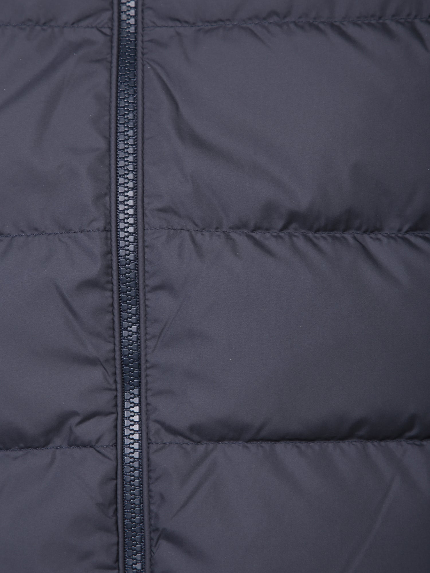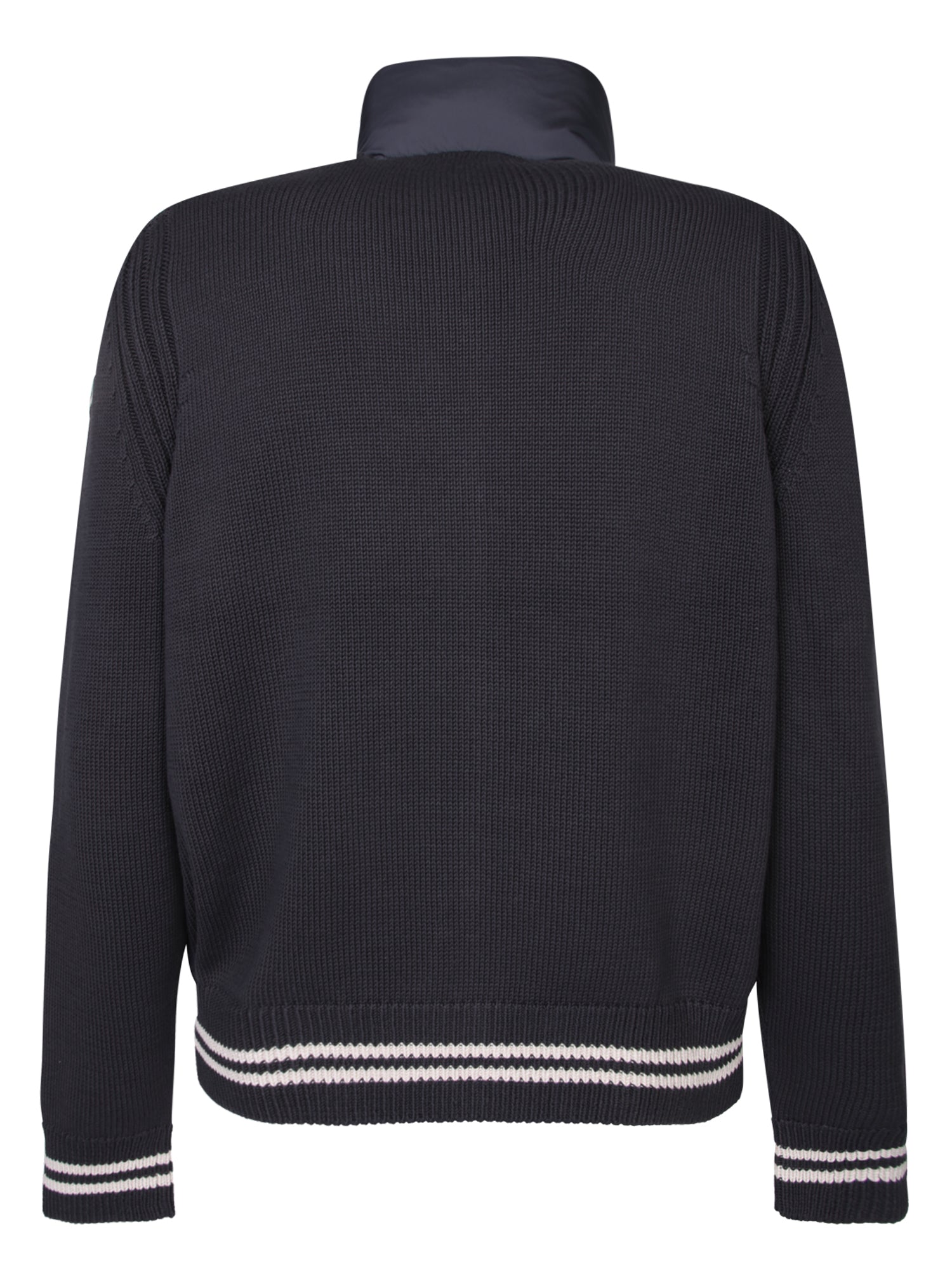 Long sleeve cardigan with full-zip closure and raised collar. Ribbed trims with striped detailing.