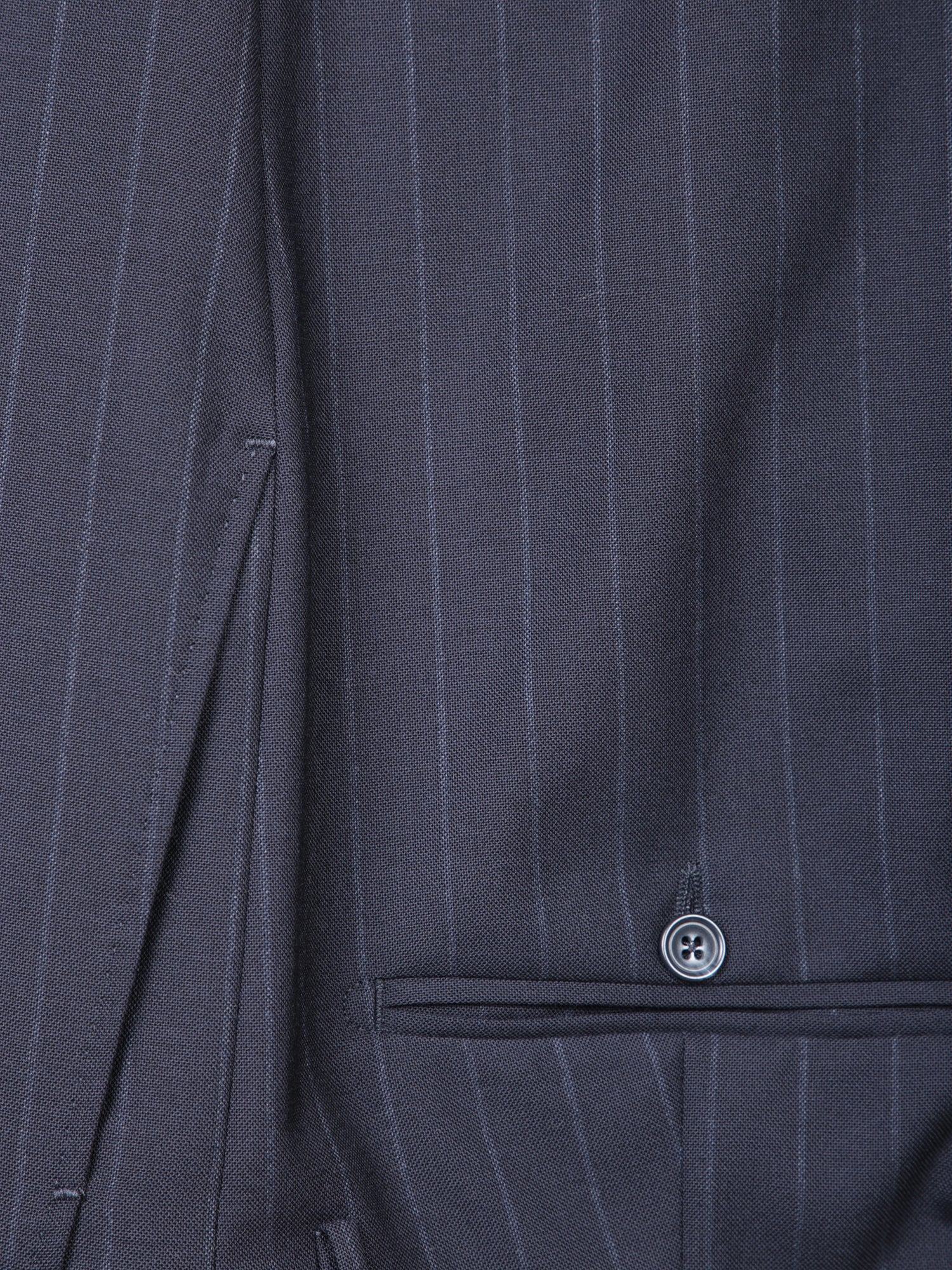 Jacket with notched lapels, front button fastening, flap pockets, pants with concealed closure.