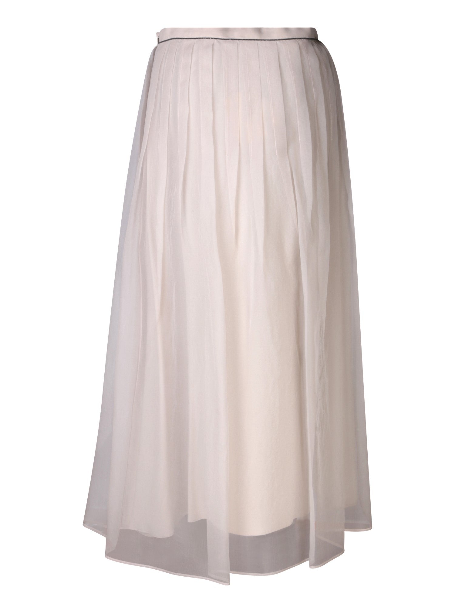 Full-circle skirt. Crafted from lightweight organza. Talc color.