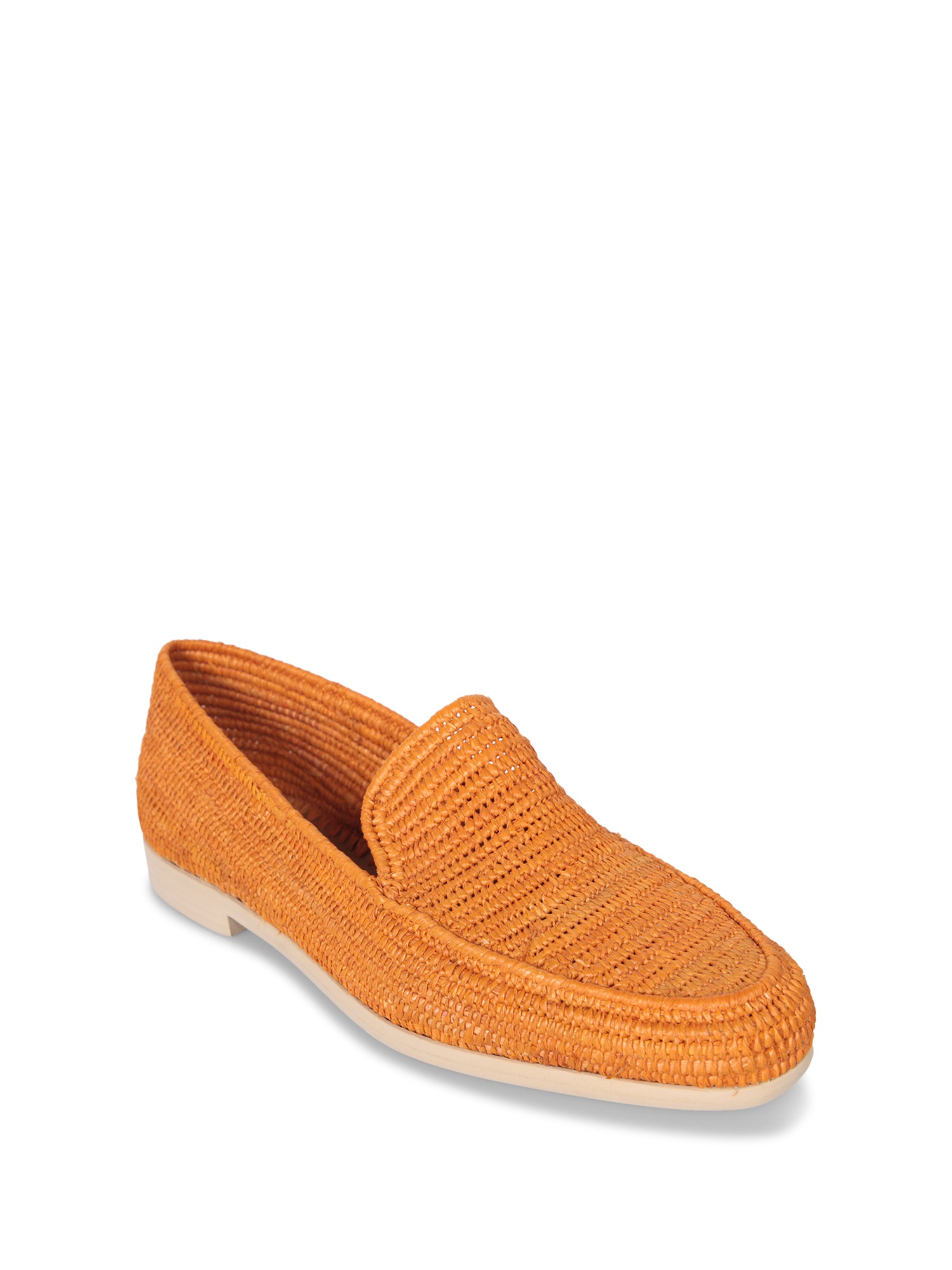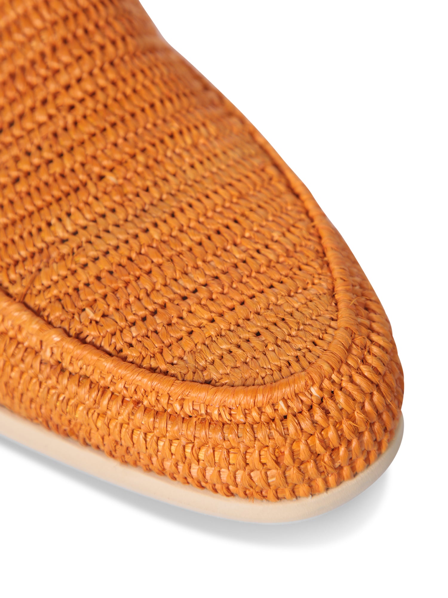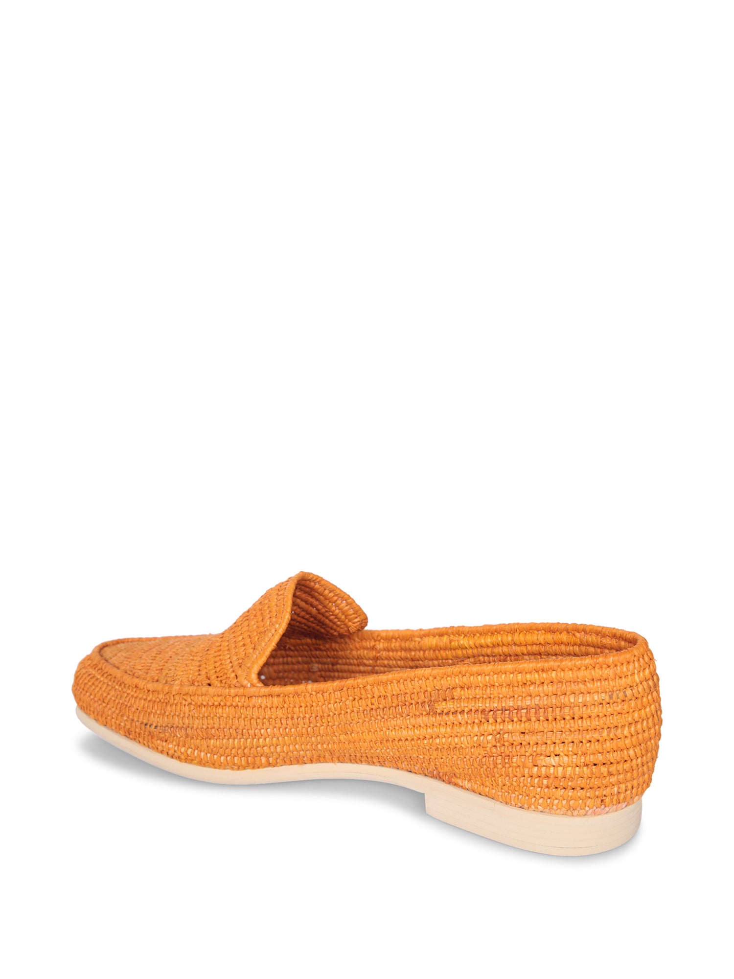 Woven raffia moccasin. Non-slip rubber sole. Slip-on style.