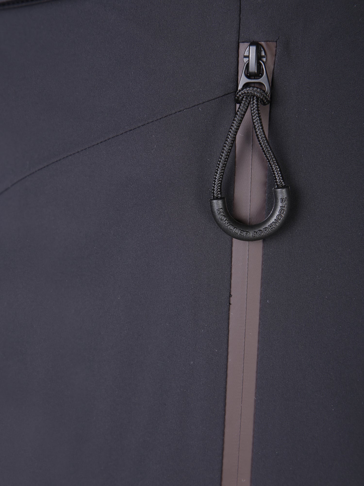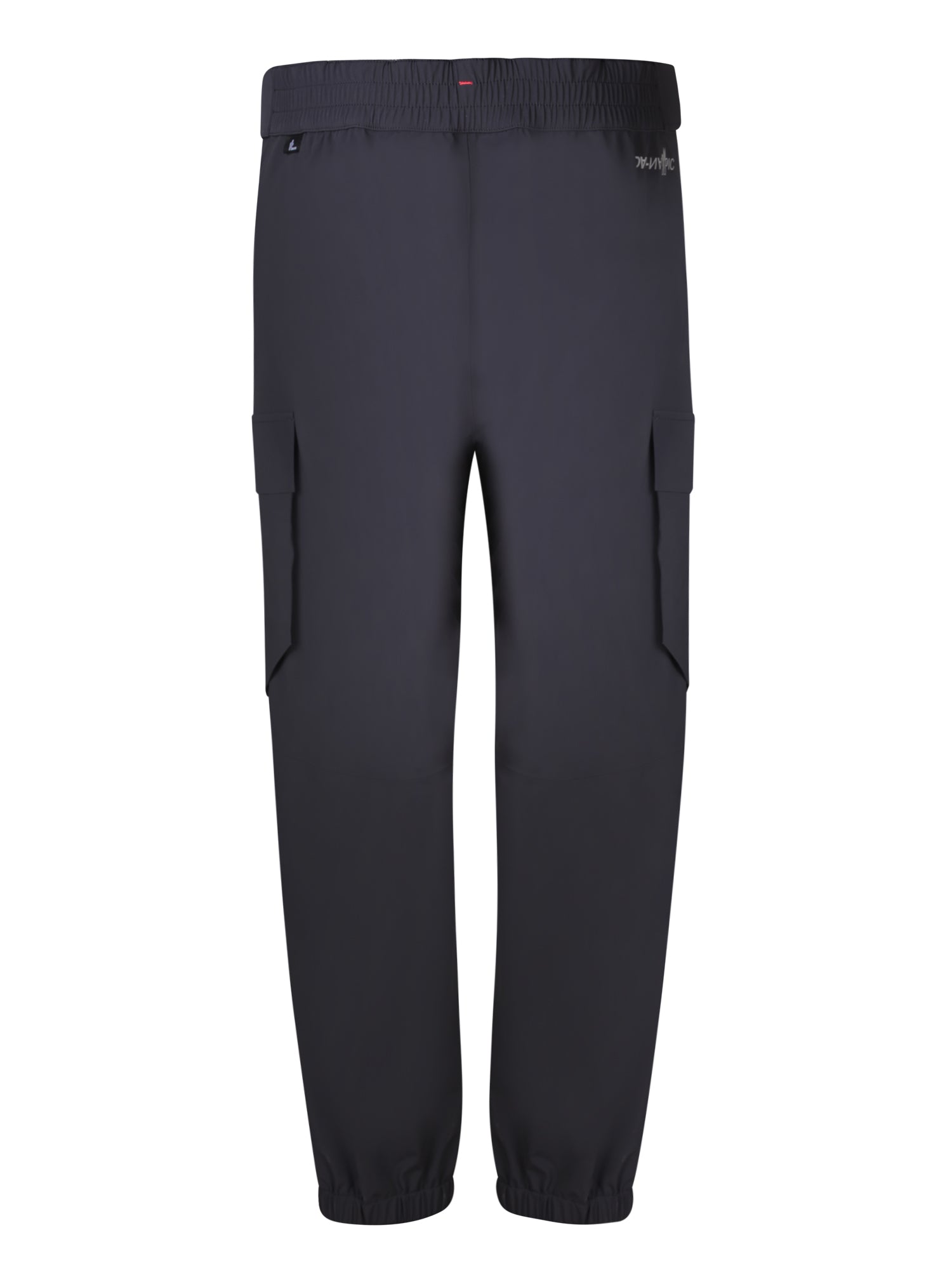 Black trousers with cargo pockets, made from technical fabric, adjustable elastic waistband and button closure.