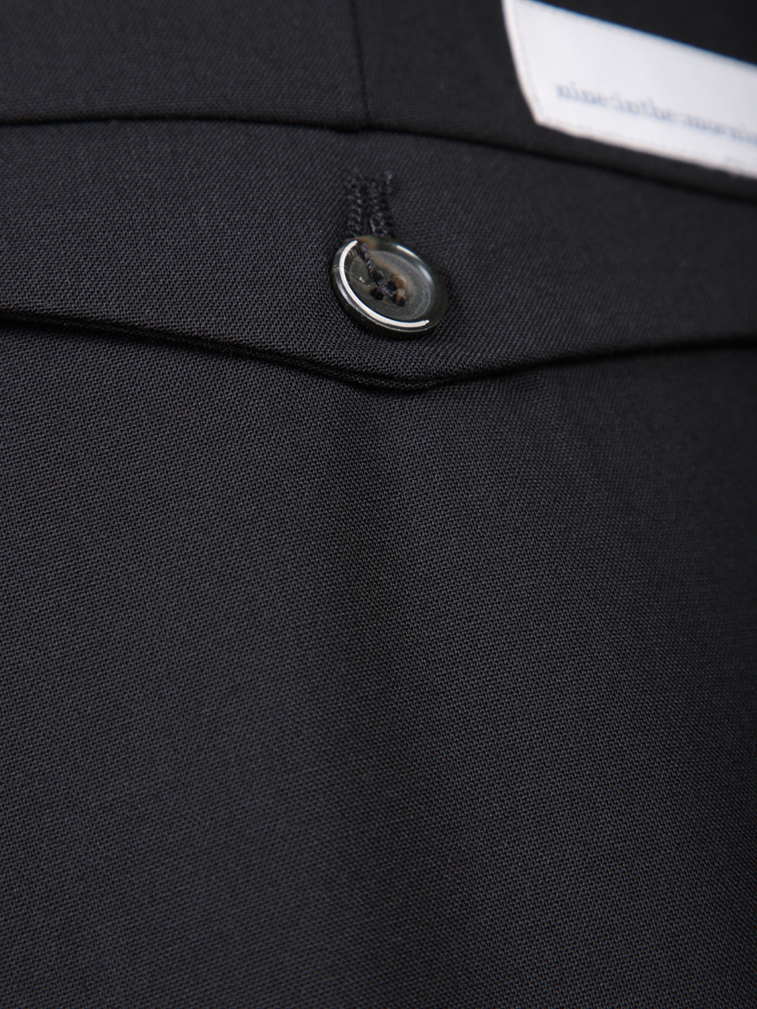 Wide-leg trousers in dark fabric. Zip and button closure. Side pockets.