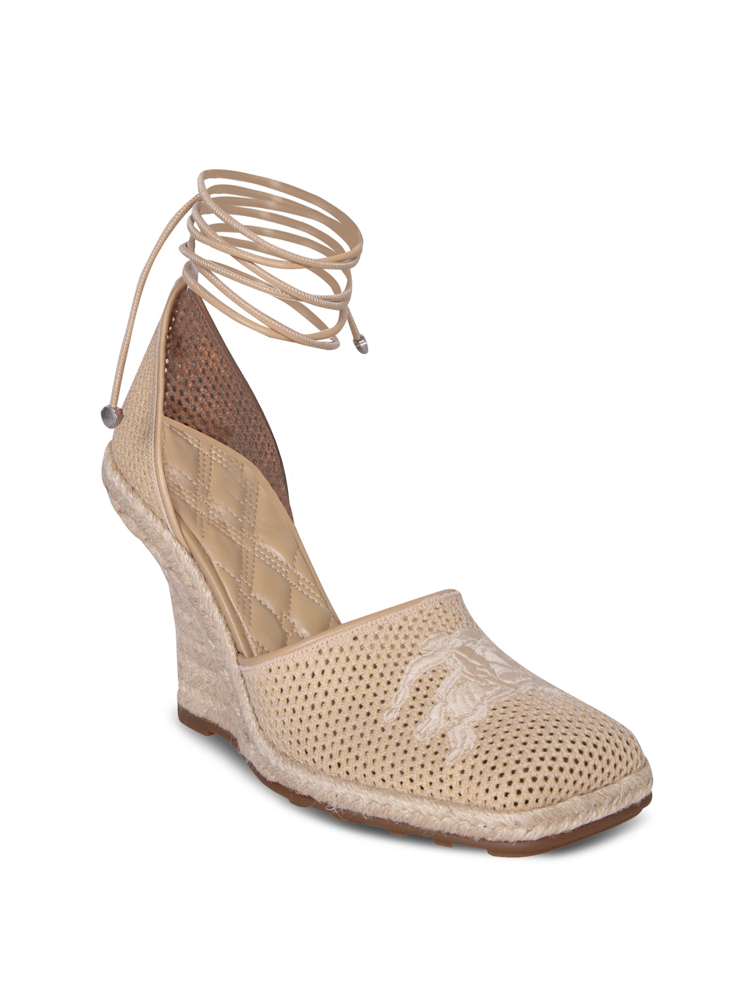 Wedge espadrilles with rope heel, crochet upper, and lace-up closure.