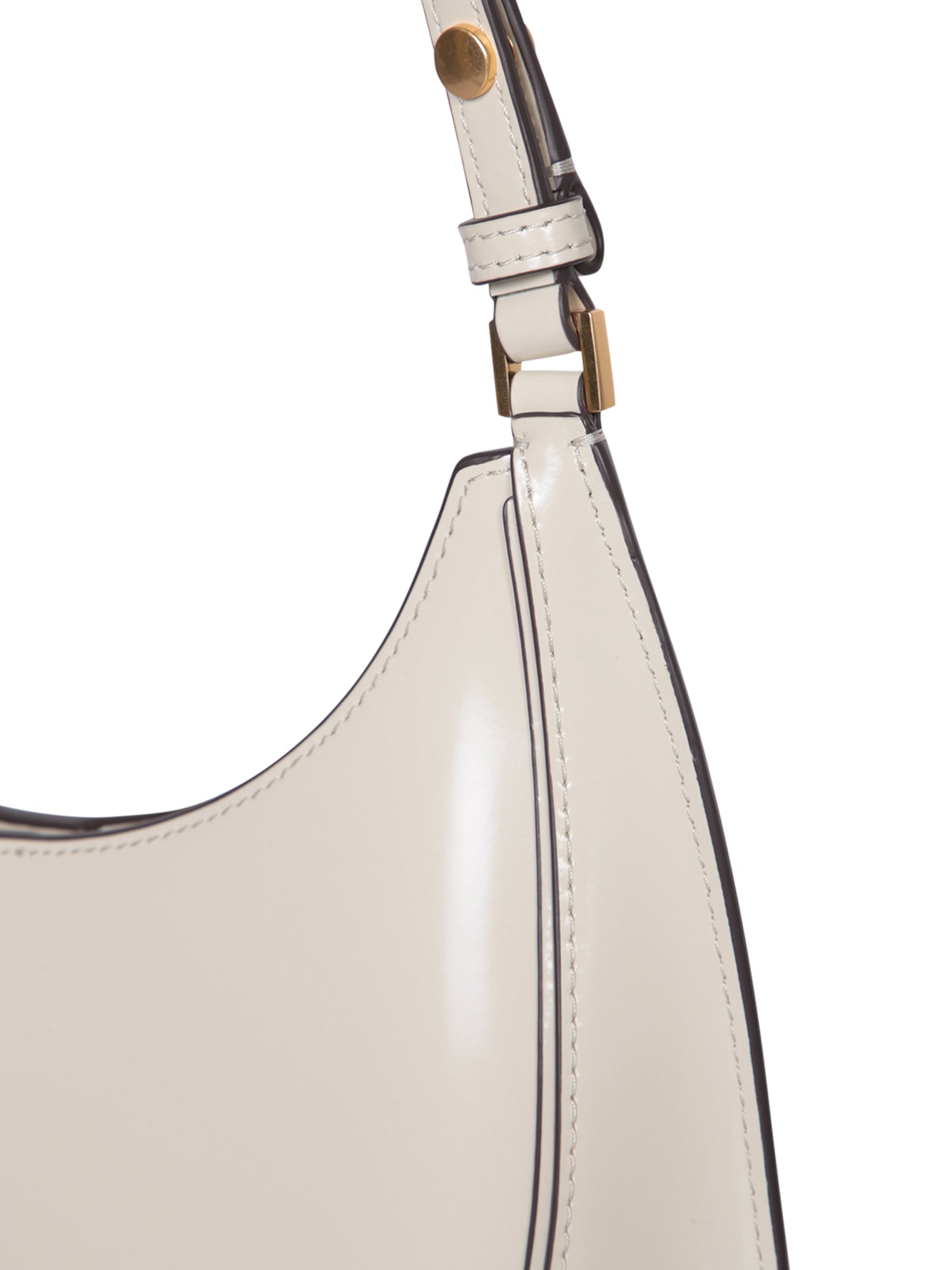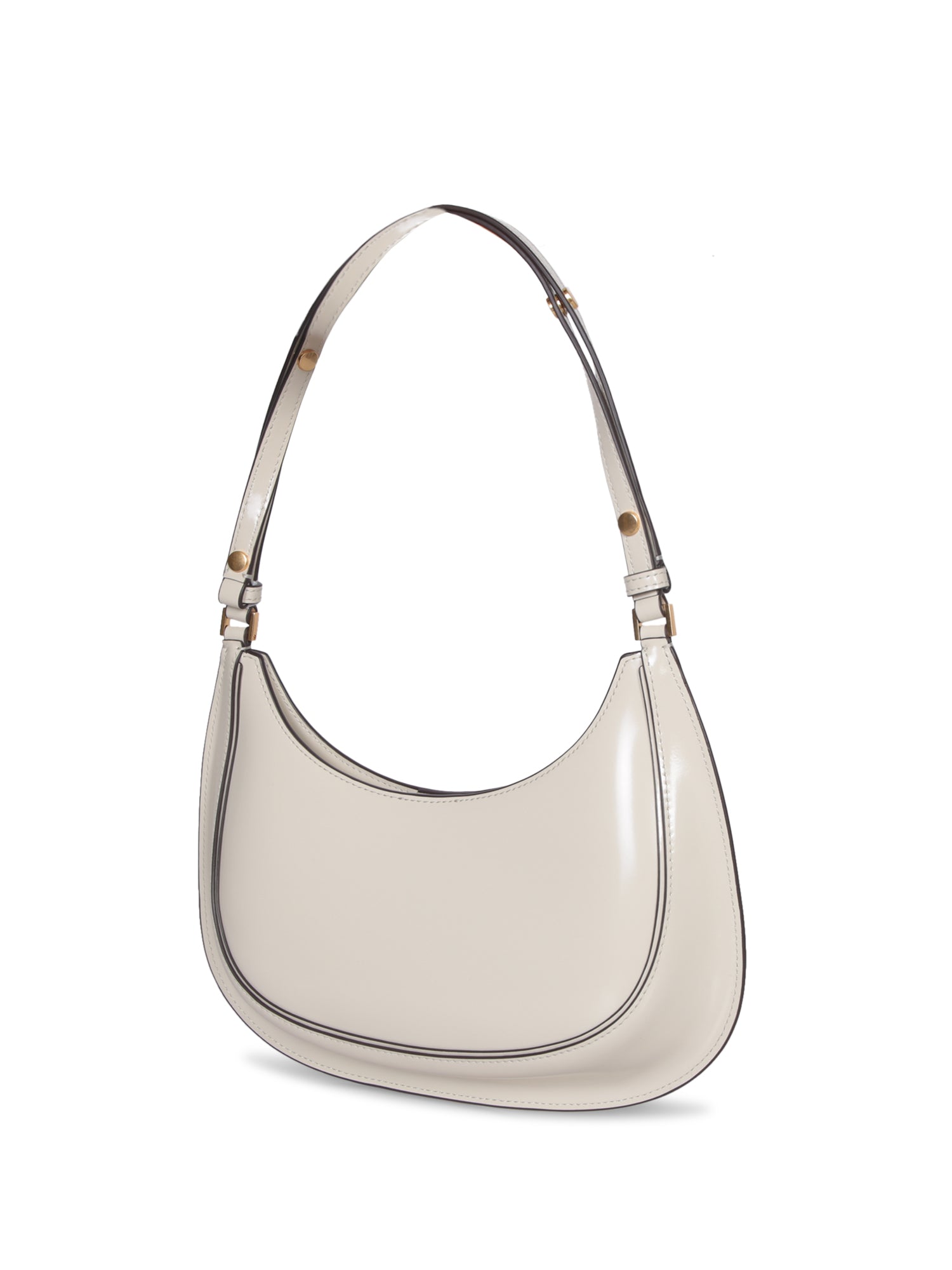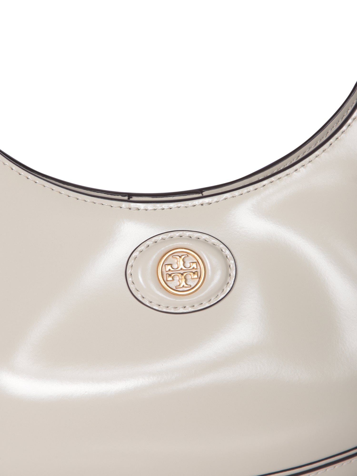 Glossy leather shoulder bag. Top zipper closure. Gold-tone hardware.