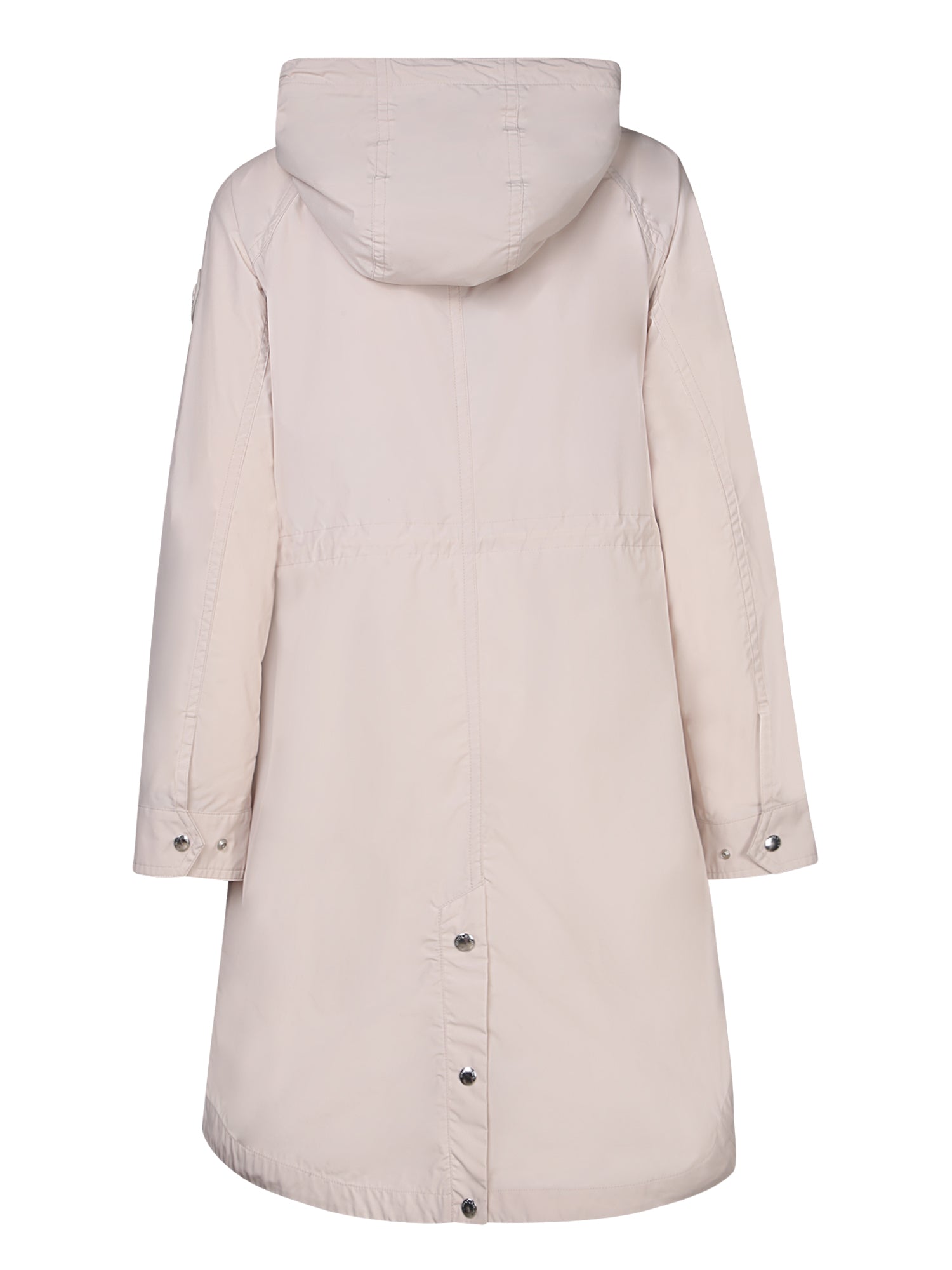 Long waterproof technical fabric parka with integrated hood and flap welt pockets.