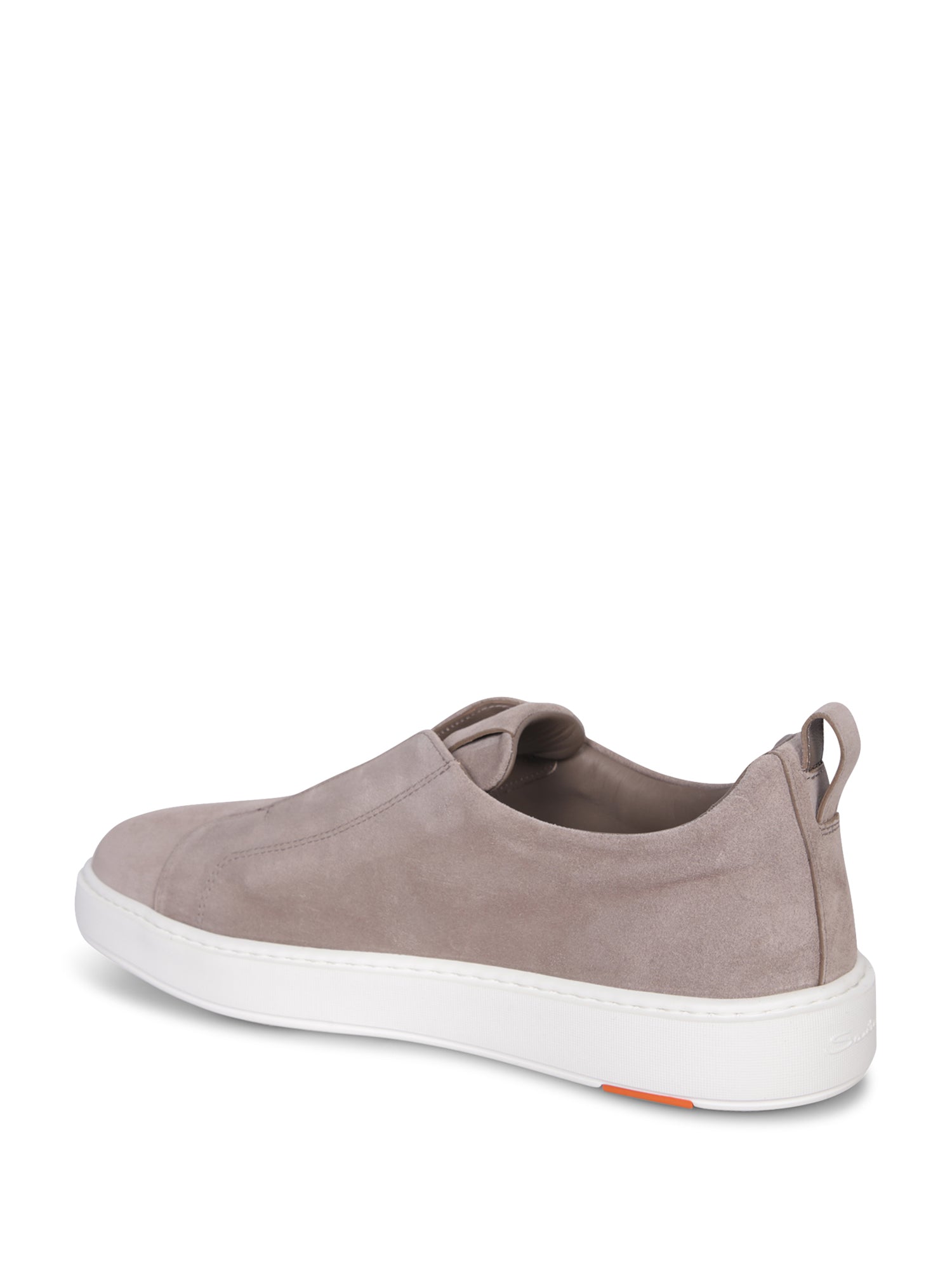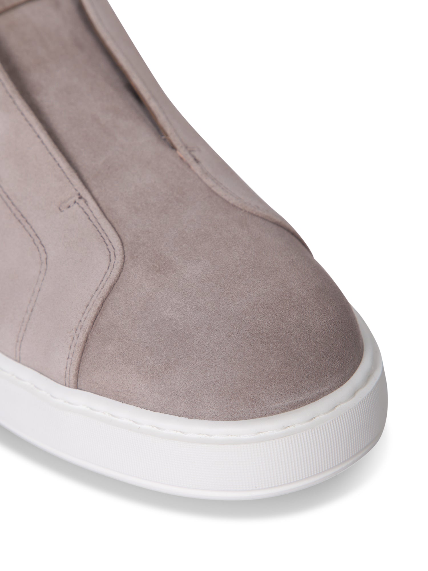 Slip-on sneakers. Grey suede upper. White rubber sole.
