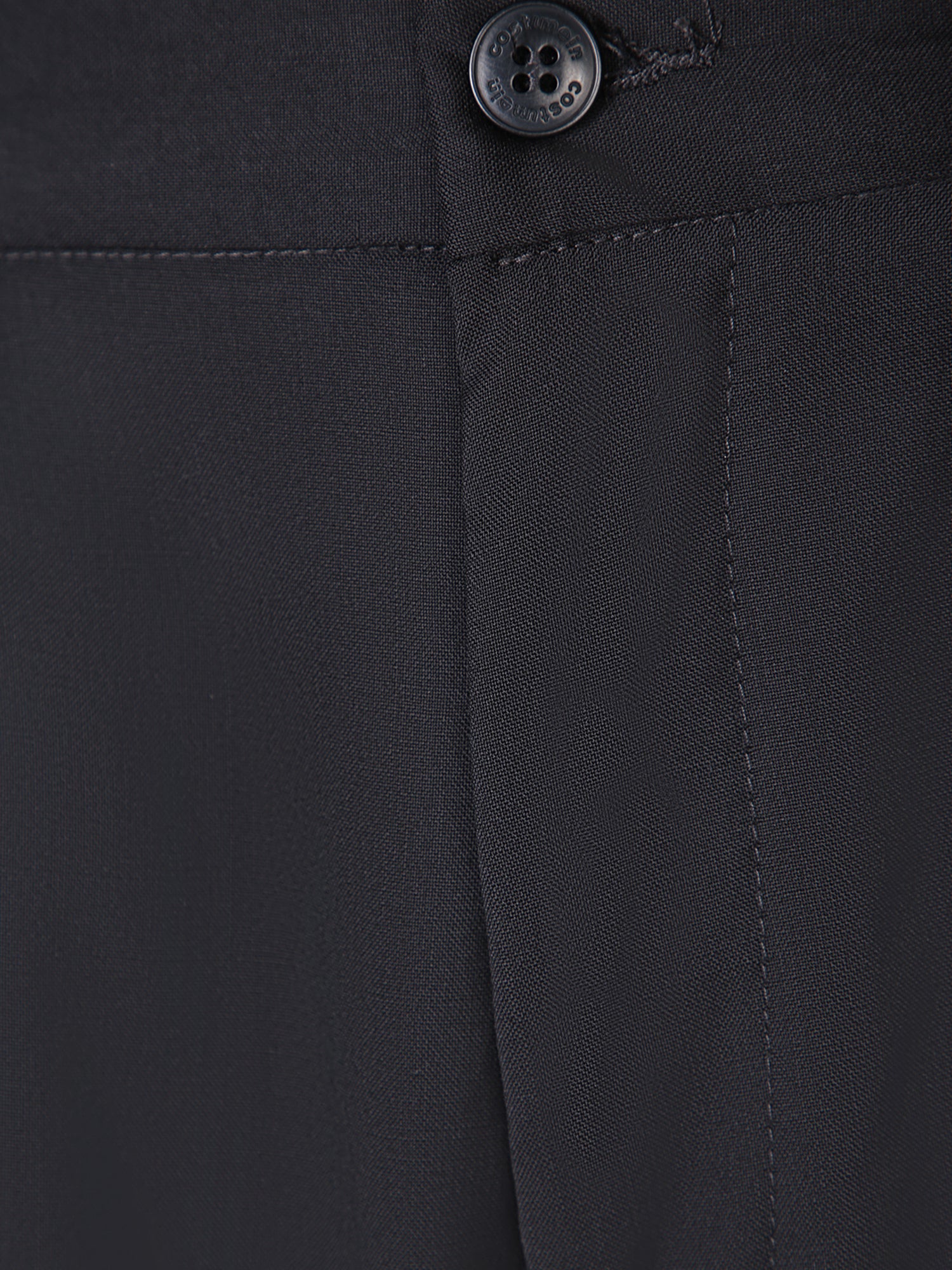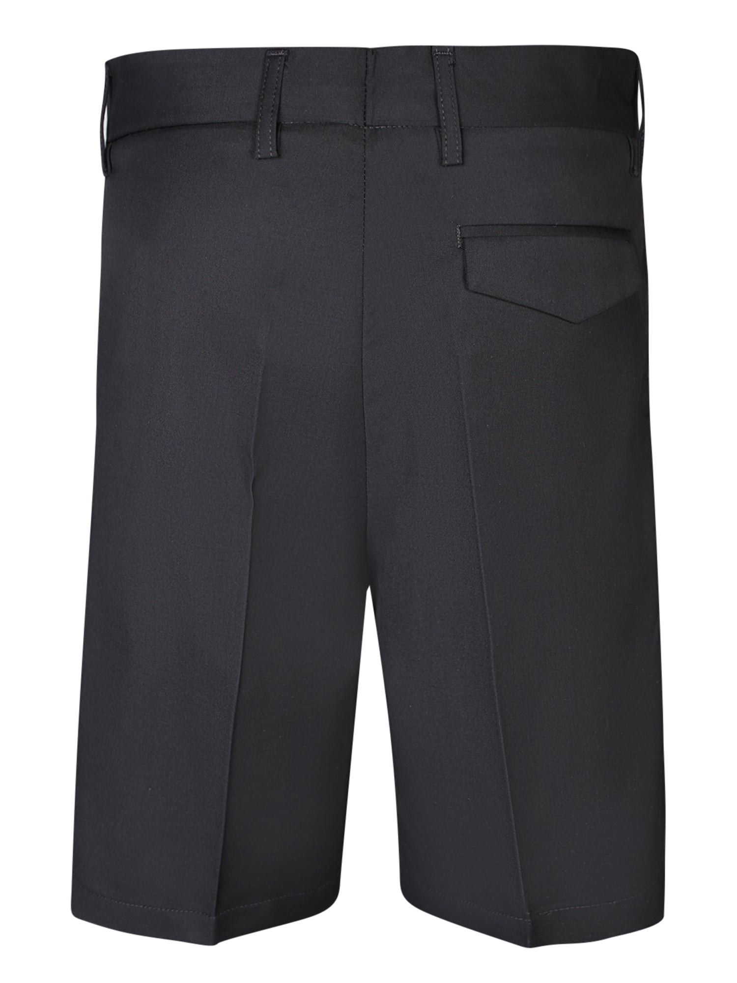 Button and zip closure, belt loops, two side pockets, pleated design, knee length.