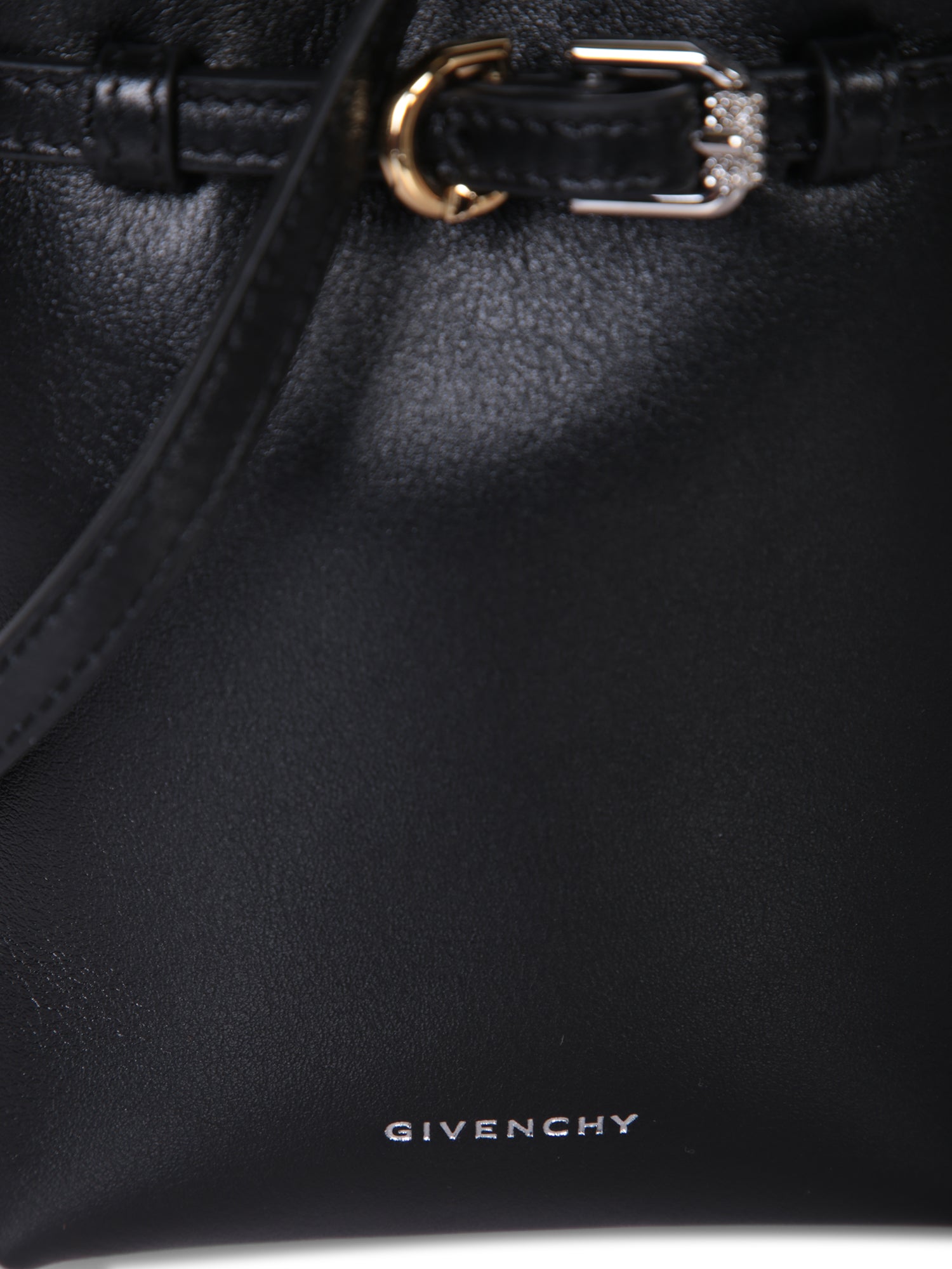 Black leather bucket bag. Adjustable and removable shoulder strap. Buckle closure.