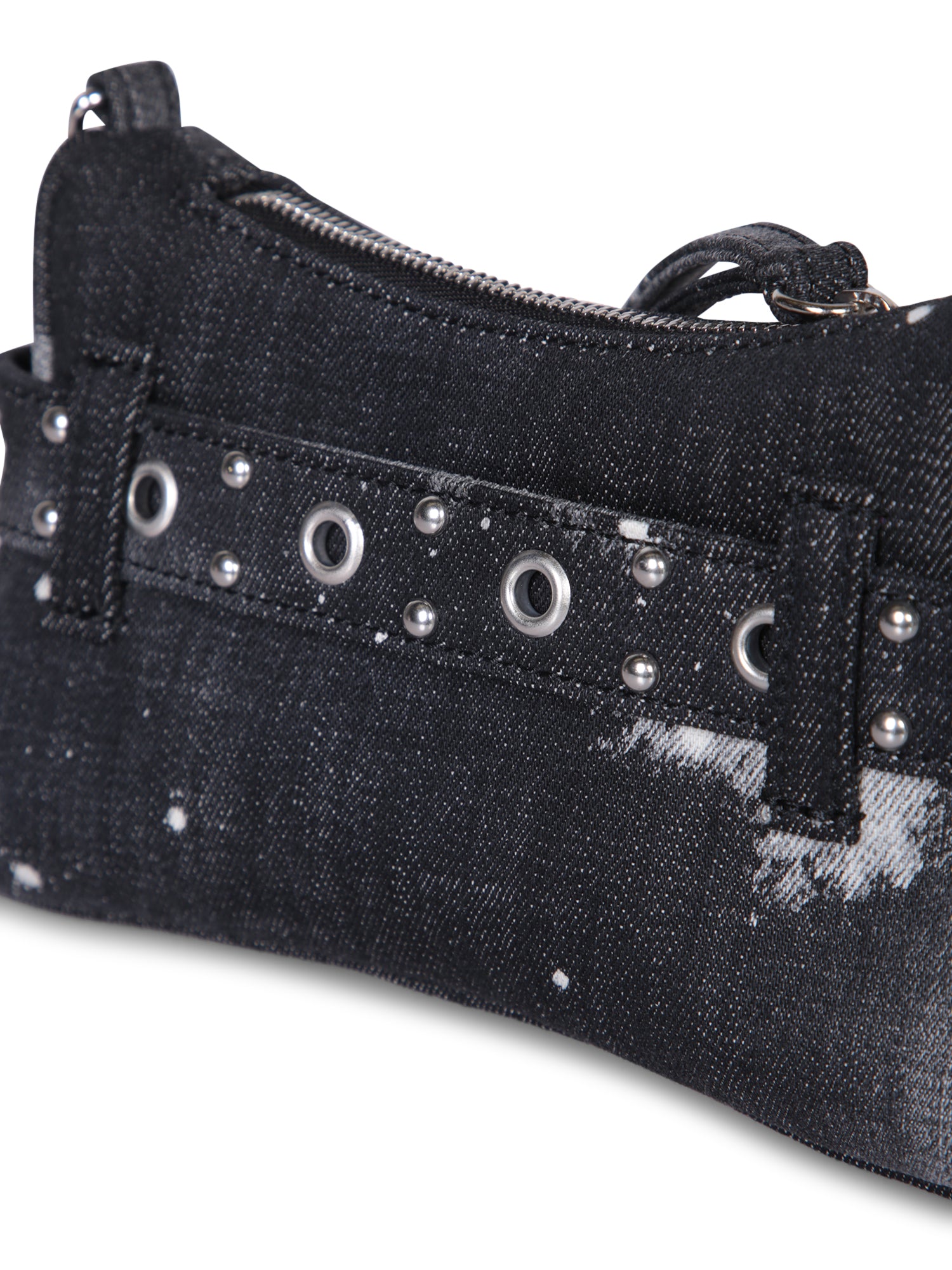 Washed black denim bag. Gothic details with studs and silver logo. Adjustable shoulder strap.