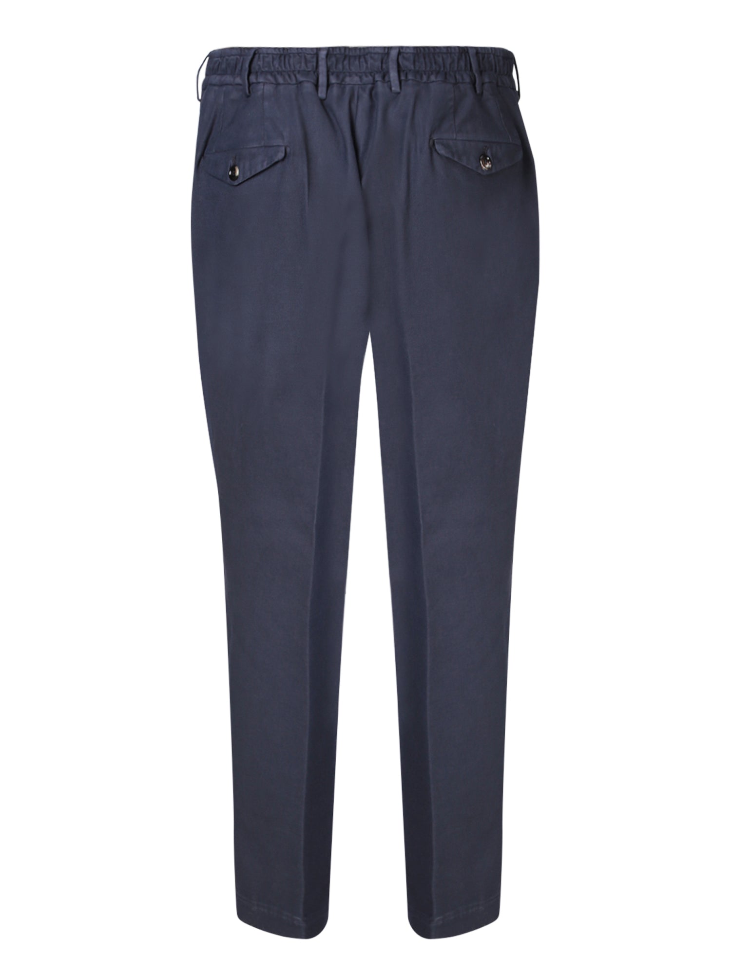 Regular waist, zip and button closure, side slash pockets, two back buttoned welt pockets, slim fit.