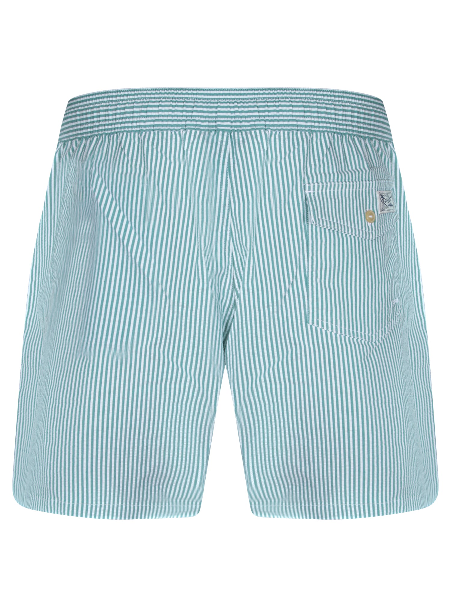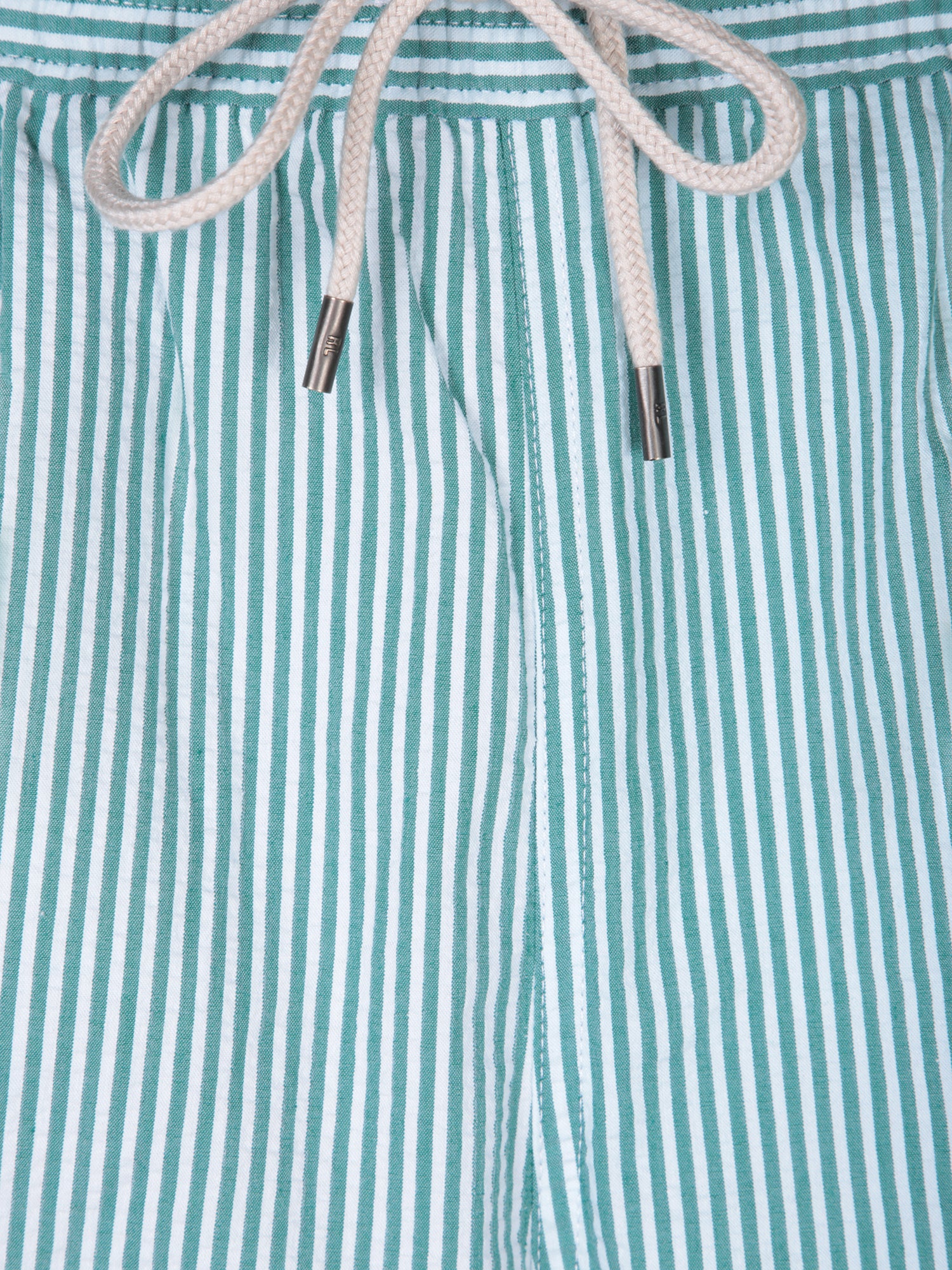 Seersucker fabric swim shorts. Features adjustable drawstring and side pockets.
