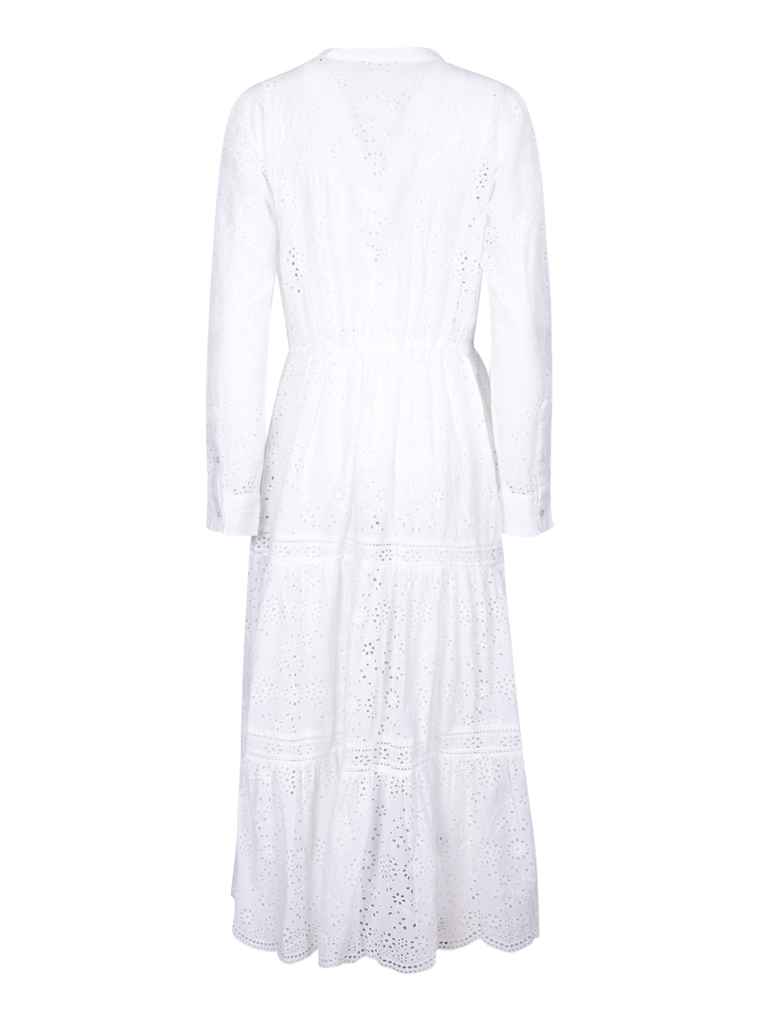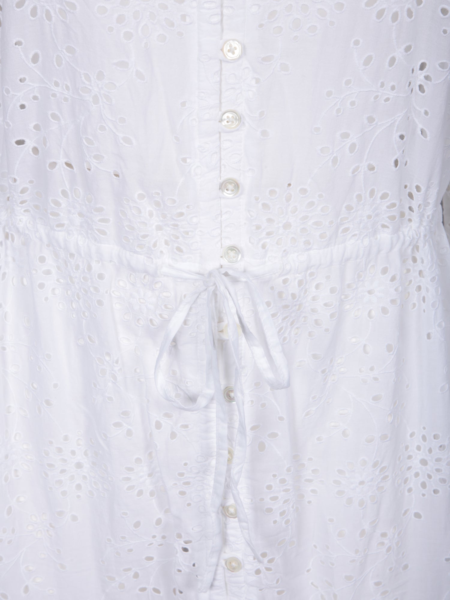White cotton long dress. Features long sleeves, a classic collar, and a front button closure. Includes a matching belt.