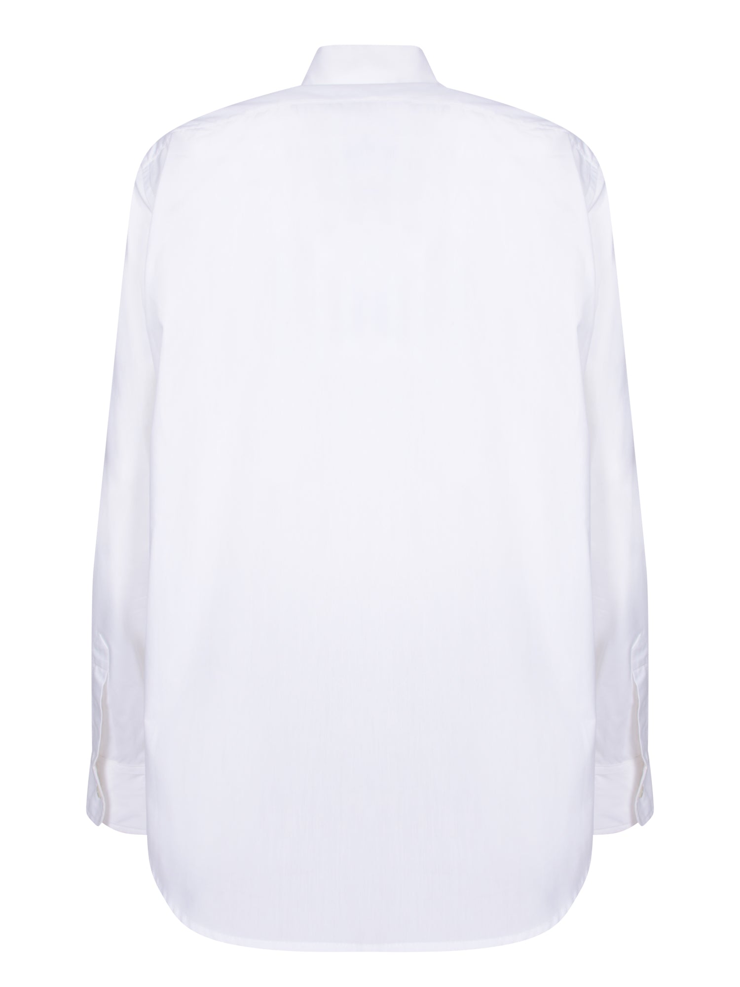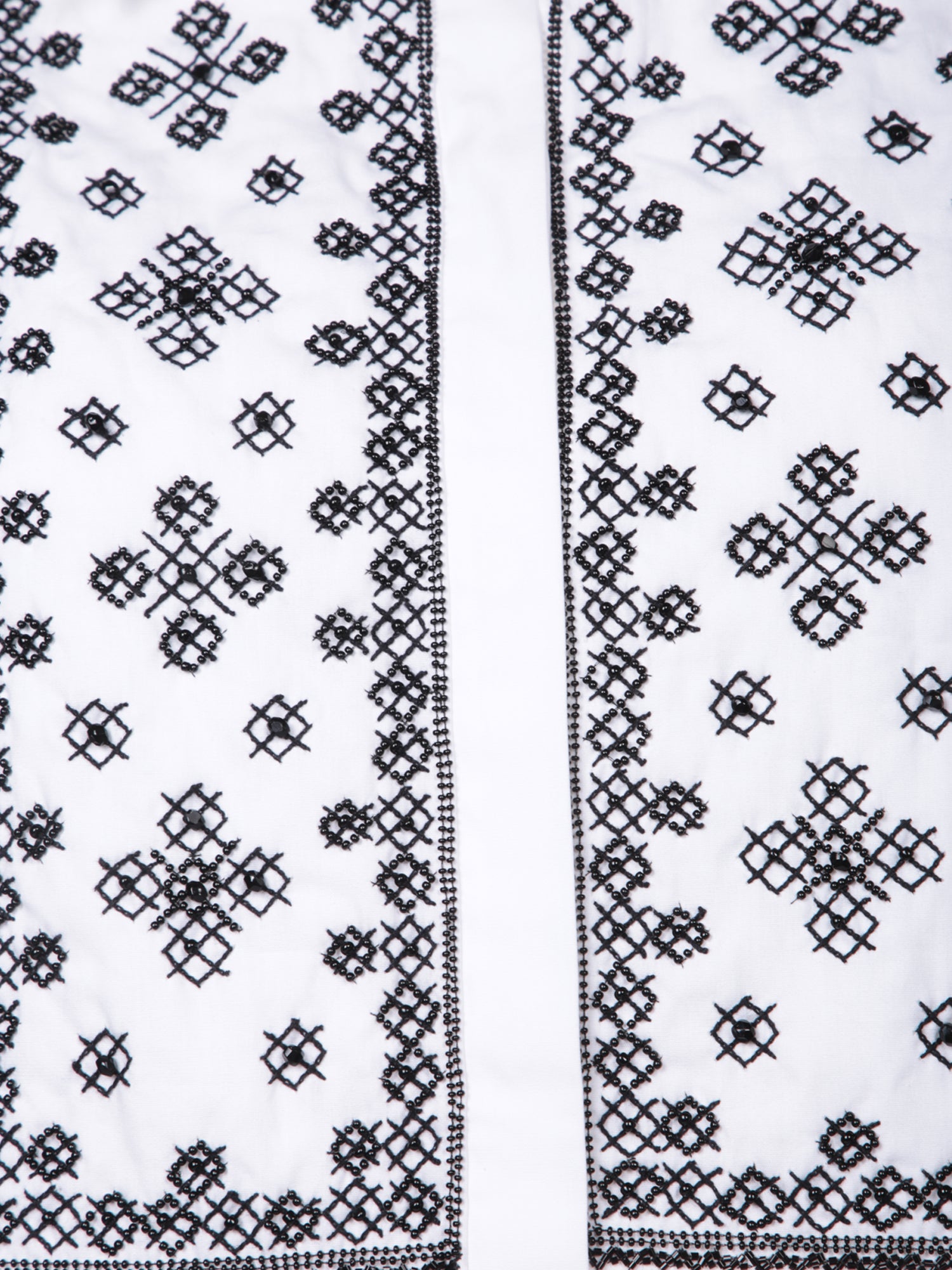 White cotton shirt. Black contrasting embroidery on front panels. Long sleeves with buttoned cuffs.