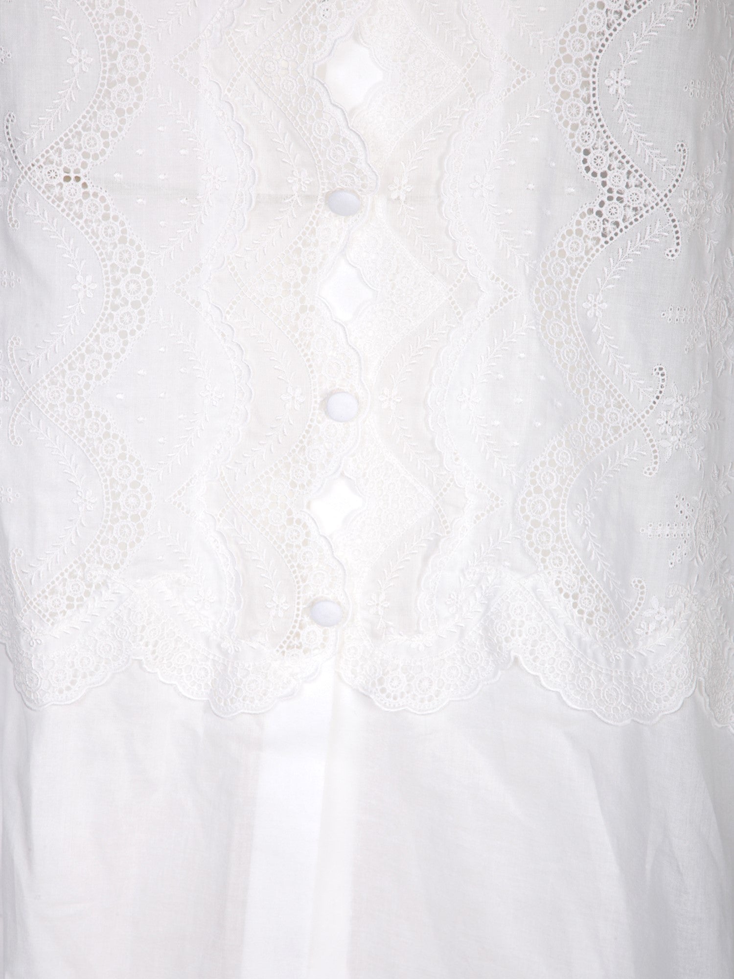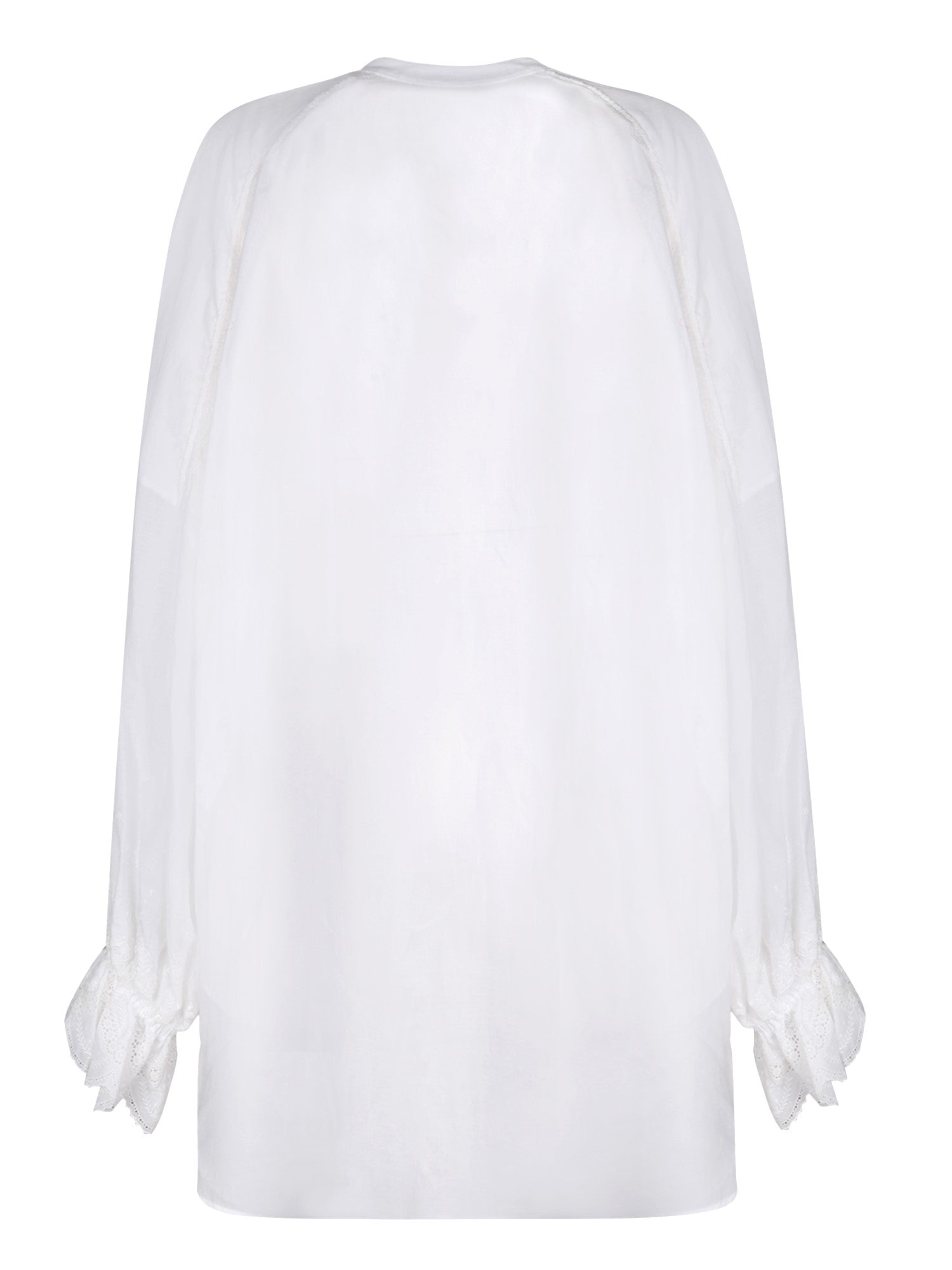 Transparent fabric shirt with embroidery, classic collar, front button fastening, long sleeves with buttoned cuffs.